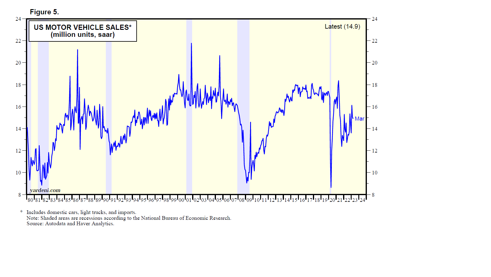(11) The rest of the world’s challenges should remain contained. Also booming is industrial production of defense, which is likely to continue rising to new record highs given the geopolitical turmoil around the world. The wars between Russia and Ukraine and between Israel and Gaza should remain contained regionally. China’s economic woes reduce the chances that China will invade Taiwan. Nevertheless, these geopolitical hot spots will boost defense spending among the NATO members.