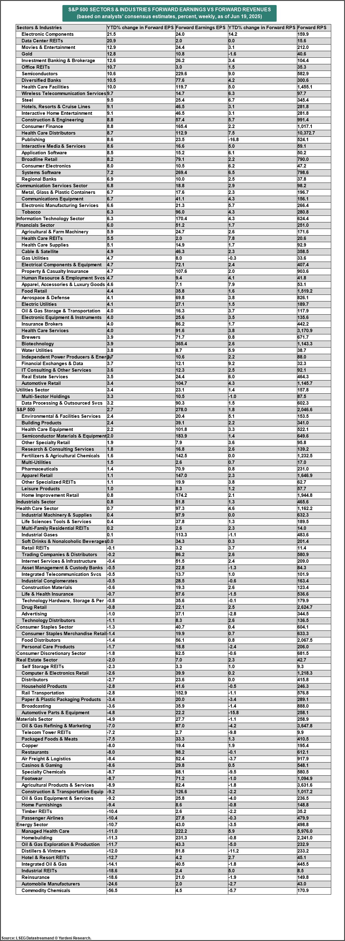 The S&P 493 is another story. Its collective profit margin dropped 0.1ppt to 12.0% during Q3 from an 11-quarter high of 12.1% during Q2 but was 0.1ppt ahead of the 11.9% forecast. Analysts currently expect the profit margin to drop by 0.3ppt to 11.6% in Q4-2025. For the surprise hook to push it above the 12.9% record high of H2-2021 would be a stretch, as many sectors are still in a profit margin recession (e.g., Consumer Staples, Energy, Health Care, Materials, and Real Estate).