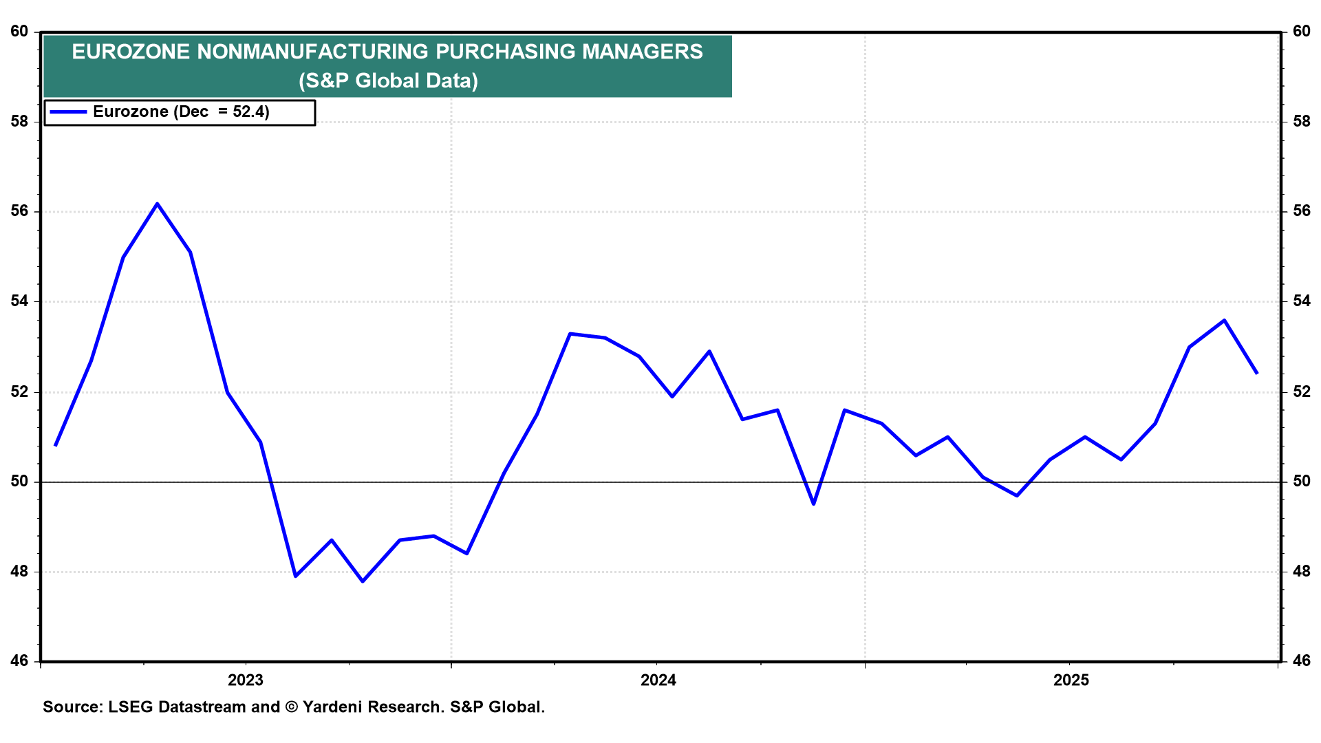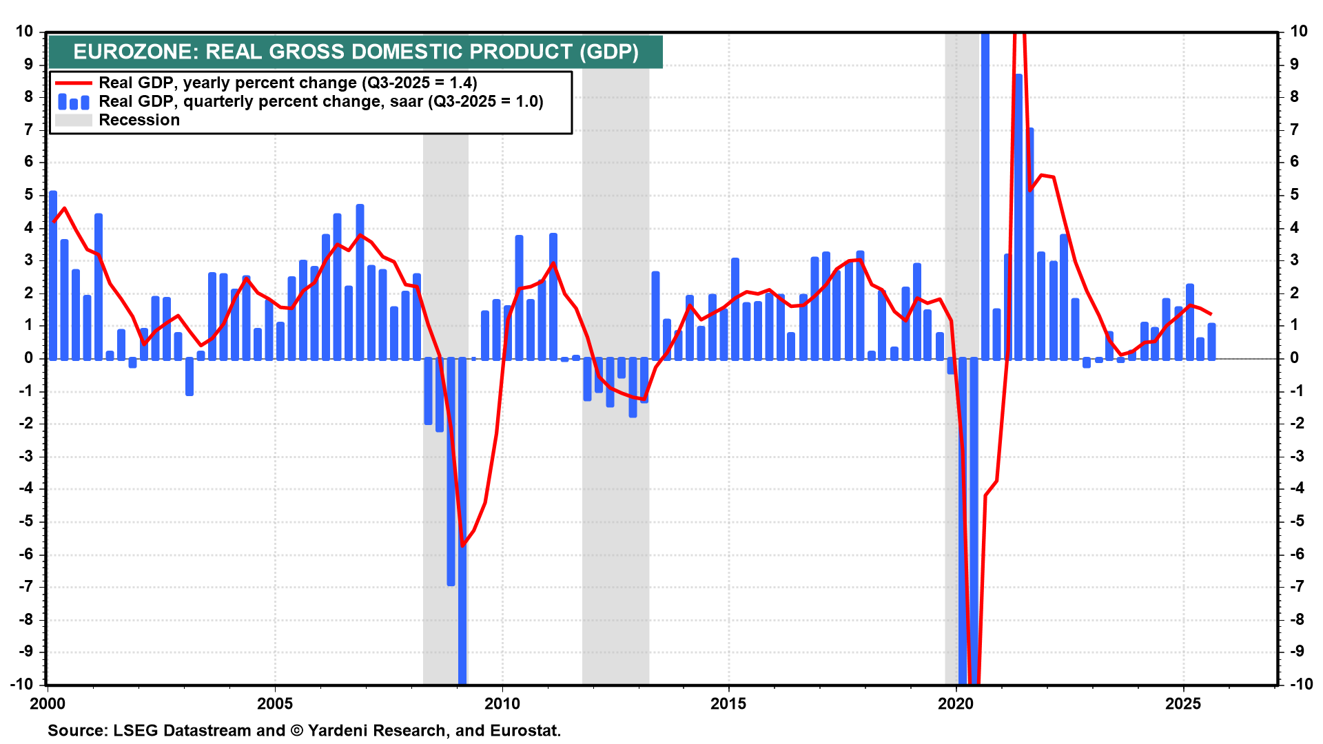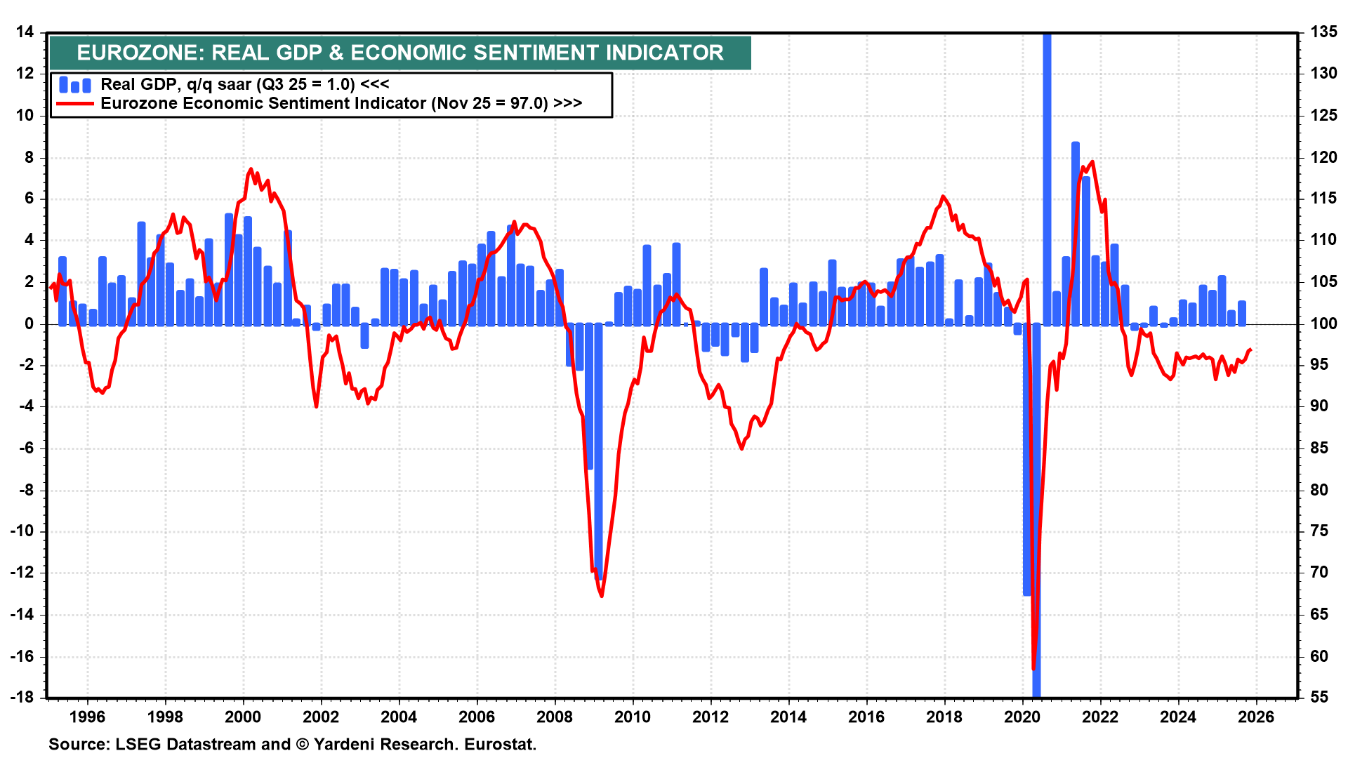 (1) Growth: positive, but nothing to write home about. The Eurozone economy expanded at a mediocre pace of 1.4% y/y in Q3-2025, according to Eurostat (Fig. 3). This performance was boosted by a surge in exports ahead of anticipated tariff increases. However, investment in equipment and intangible assets also rose. The European Commission continues to expect growth just north of 1.0% through 2026 for the Eurozone, assuming no major shocks. Economic sentiment, often correlated with output, has increased but remains lackluster (Fig. 4).