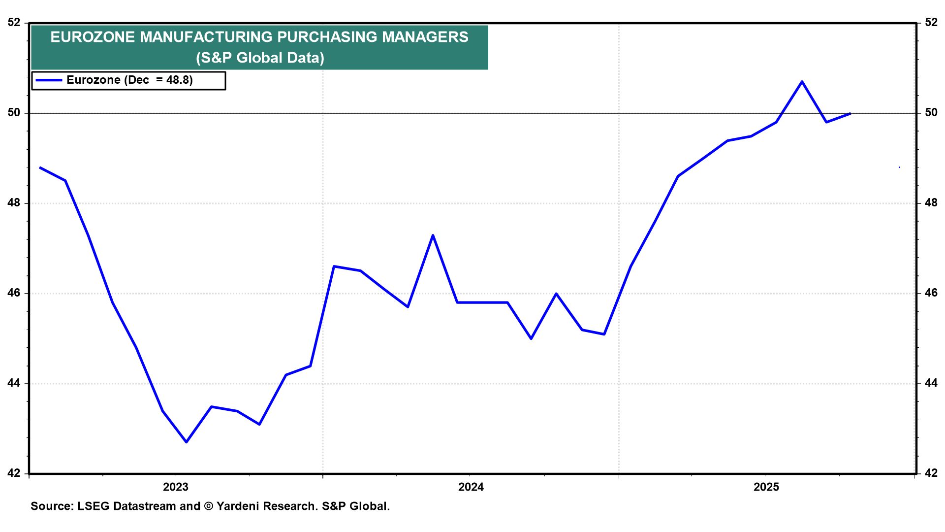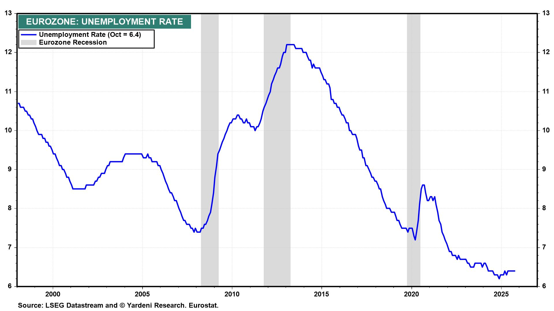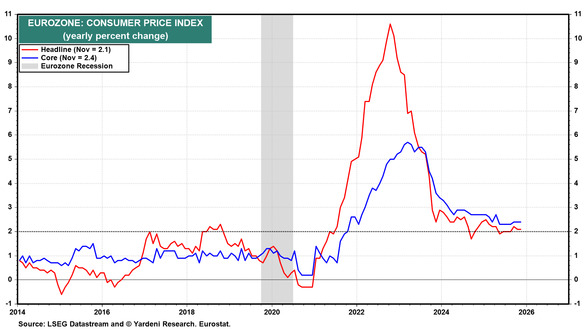 (1) Growth: positive, but nothing to write home about. The Eurozone economy expanded at a mediocre pace of 1.4% y/y in Q3-2025, according to Eurostat (Fig. 3). This performance was boosted by a surge in exports ahead of anticipated tariff increases. However, investment in equipment and intangible assets also rose. The European Commission continues to expect growth just north of 1.0% through 2026 for the Eurozone, assuming no major shocks. Economic sentiment, often correlated with output, has increased but remains lackluster (Fig. 4).