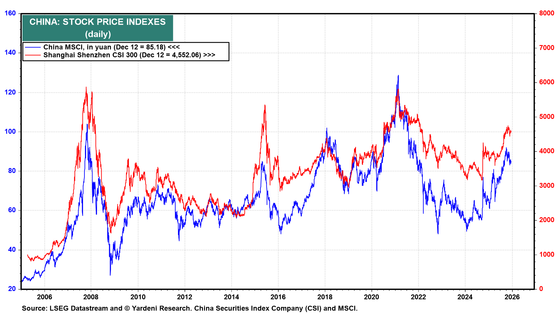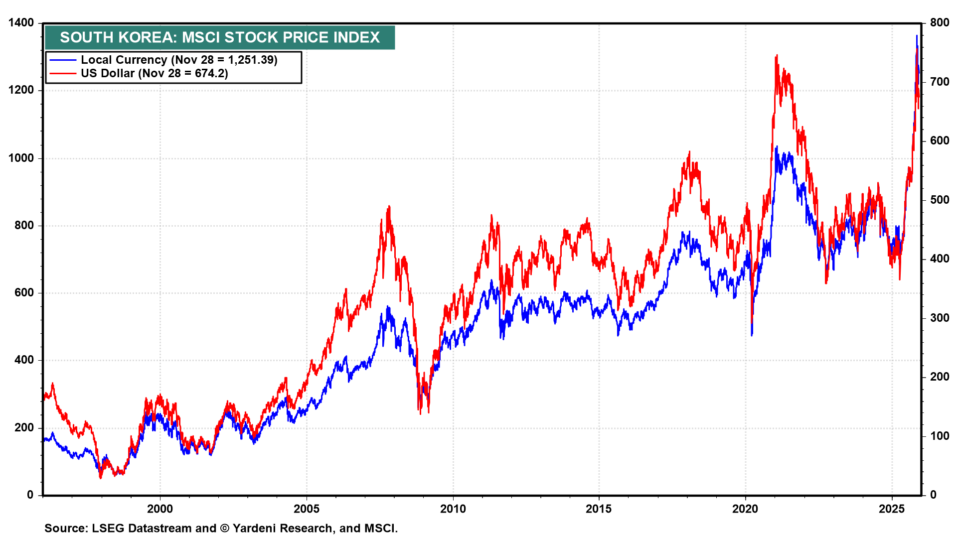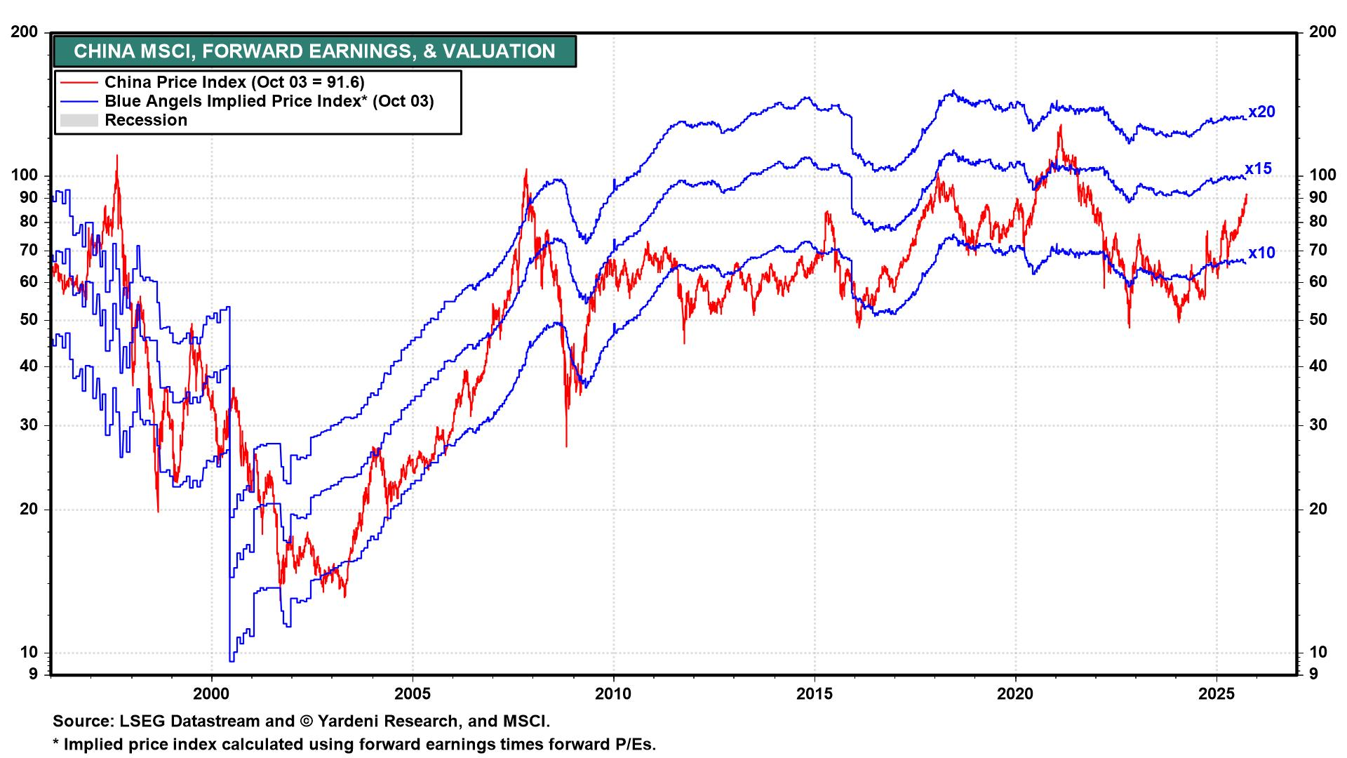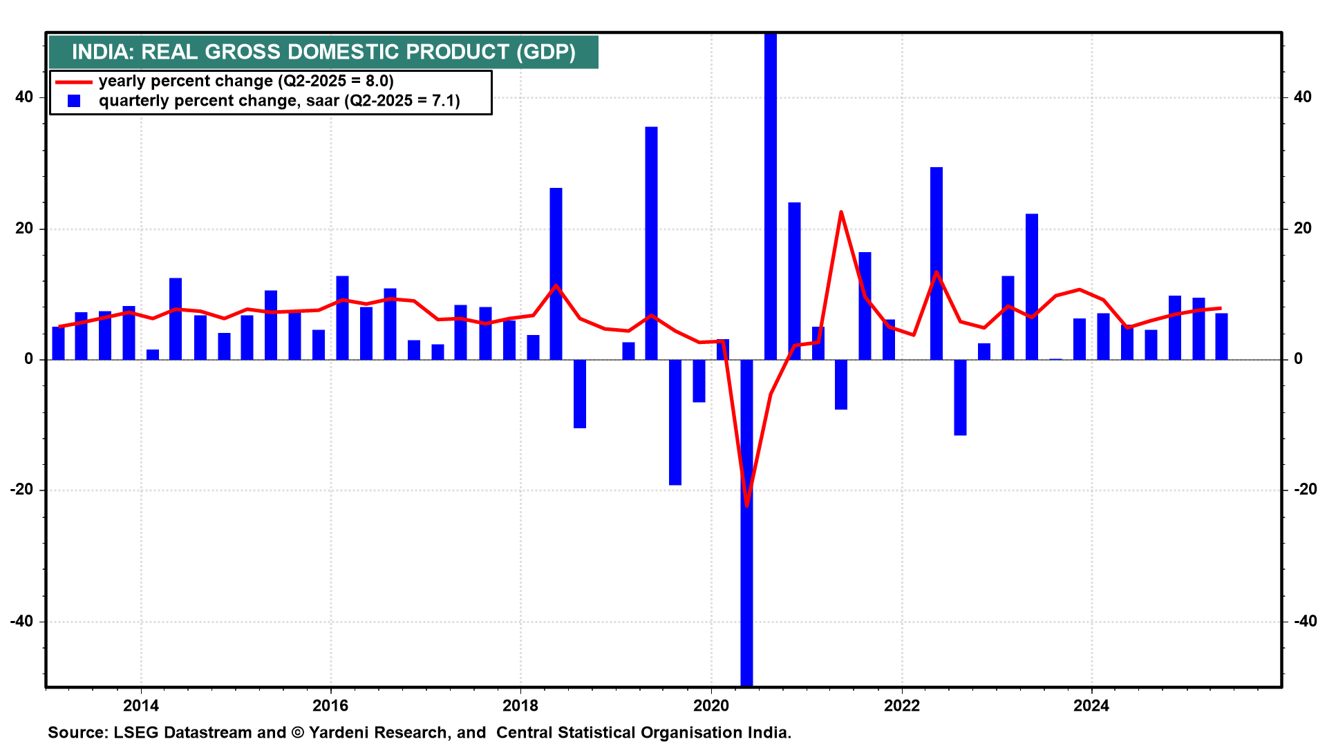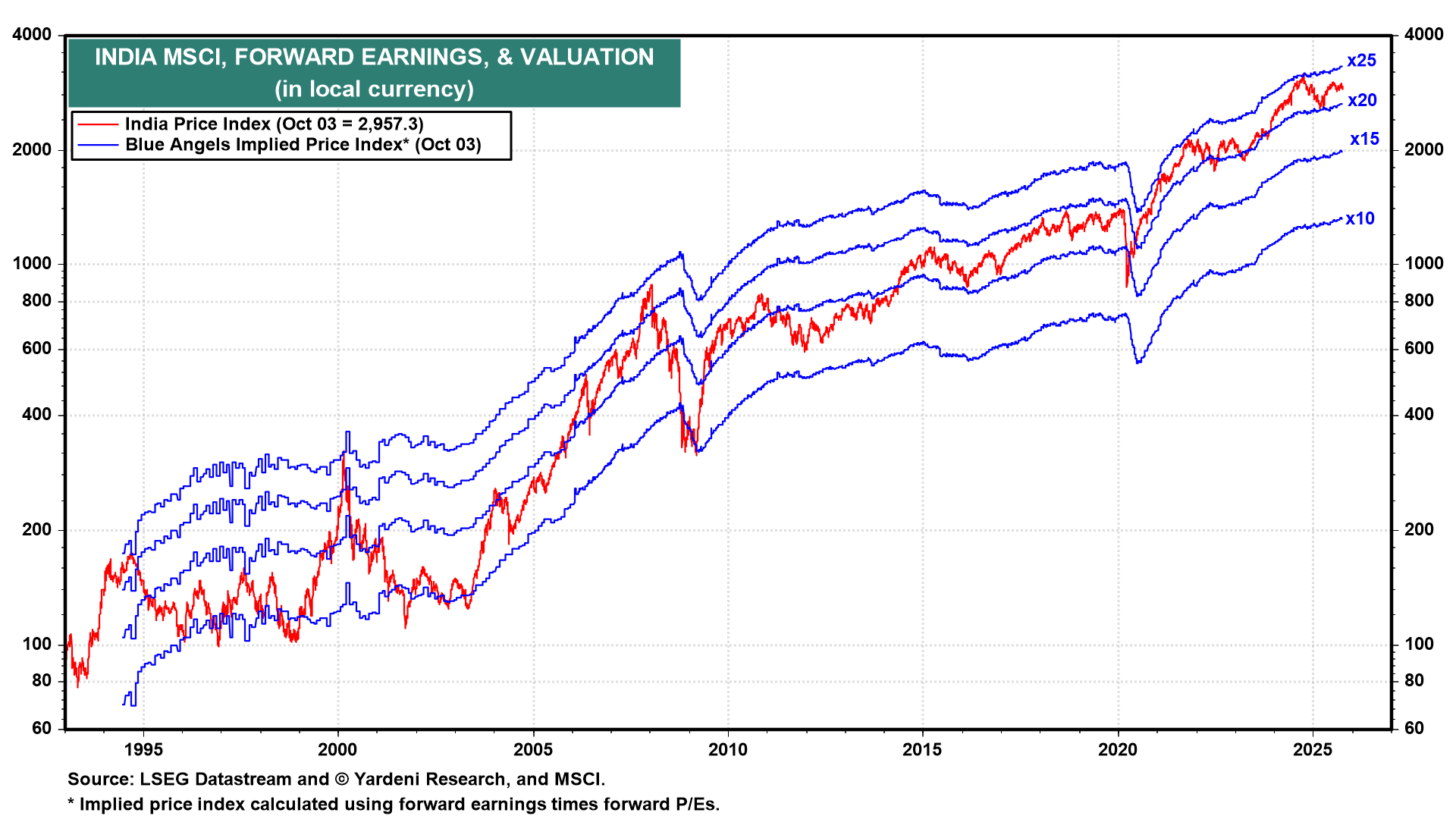 (1) India leads Asian economies. The Reserve Bank of India (RBI) expects India’s real GDP growth to approach the government’s 7.0% target during its fiscal year 2025-26 (Fig. 11). The region remains the world’s fastest growing economy. With the India MSCI trading at 22.6 times forward earnings, however, investors certainly are paying for that growth.