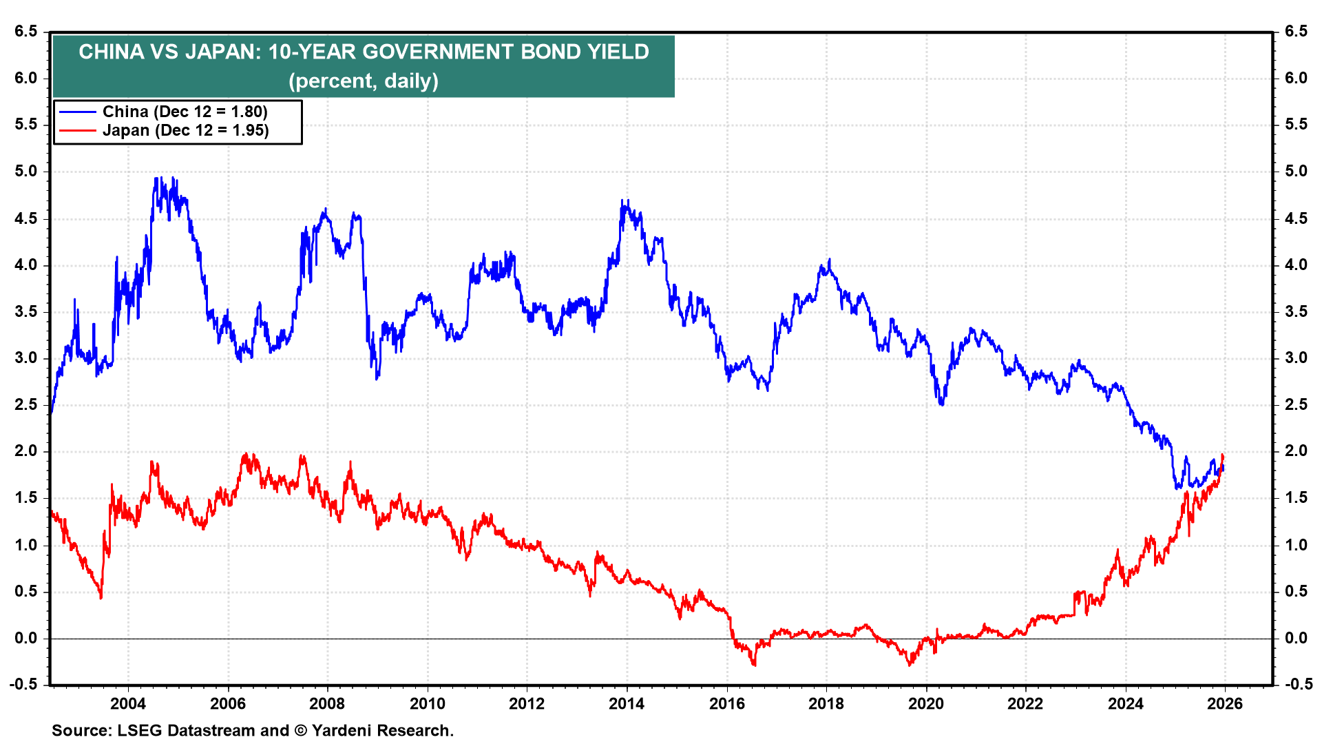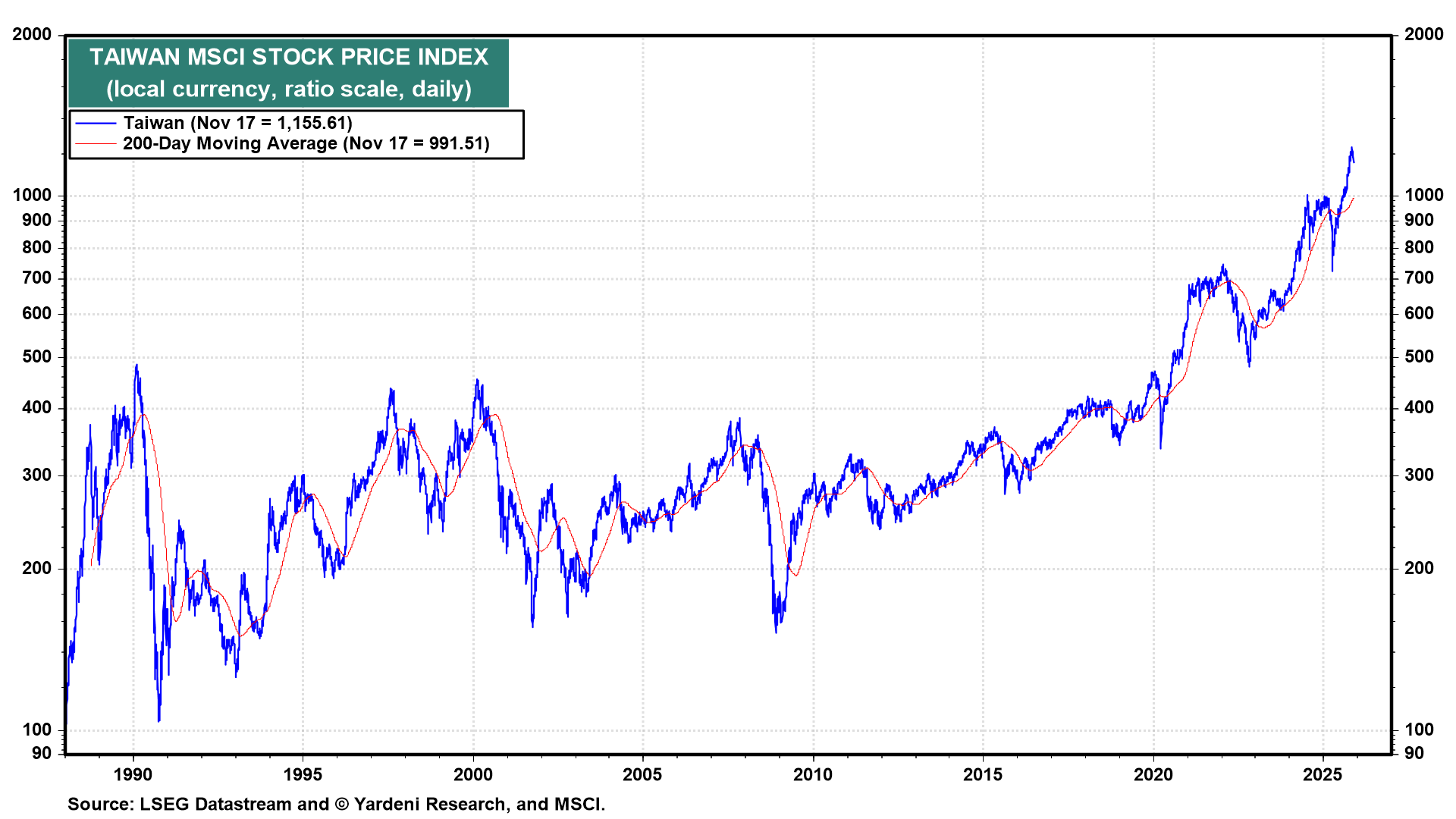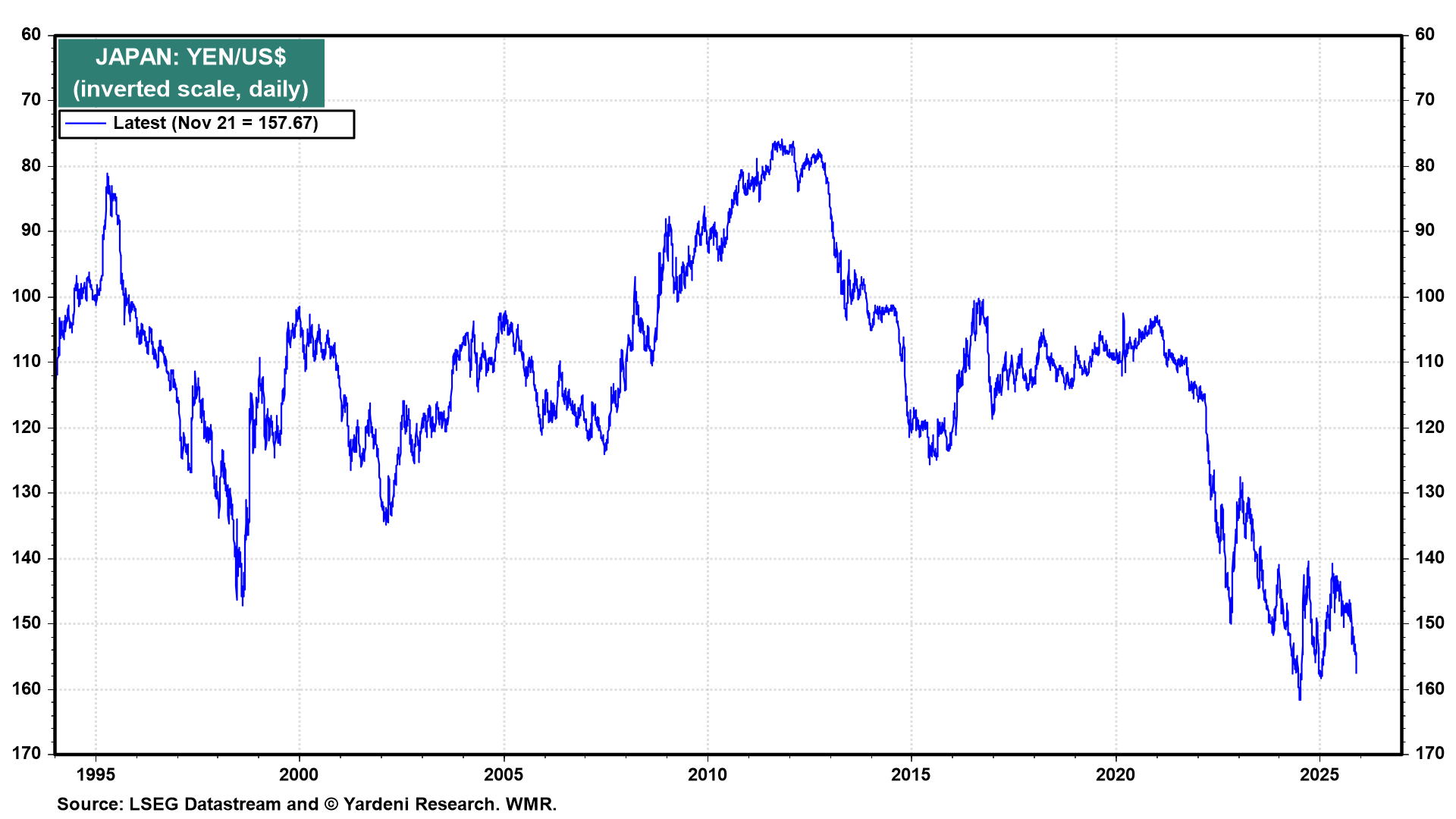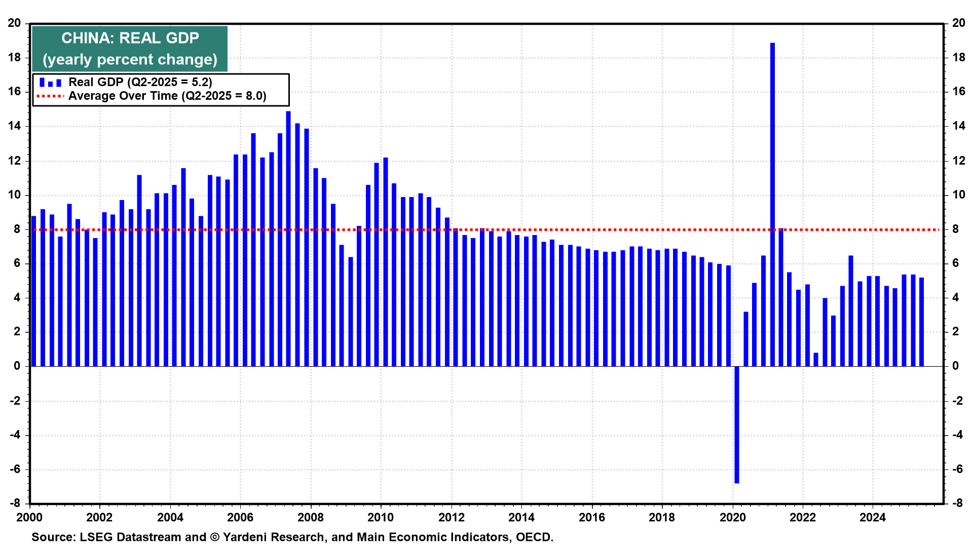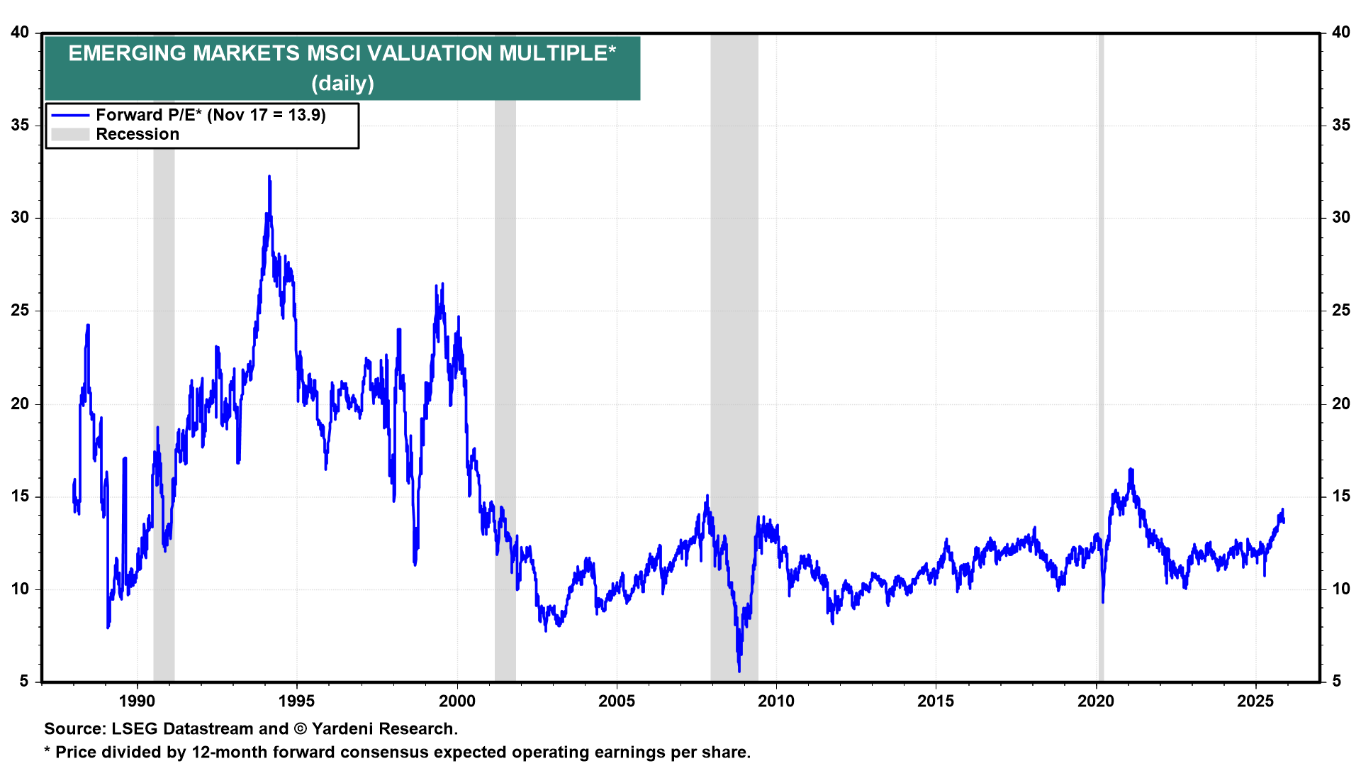 (1) India leads Asian economies. The Reserve Bank of India (RBI) expects India’s real GDP growth to approach the government’s 7.0% target during its fiscal year 2025-26 (Fig. 11). The region remains the world’s fastest growing economy. With the India MSCI trading at 22.6 times forward earnings, however, investors certainly are paying for that growth.
