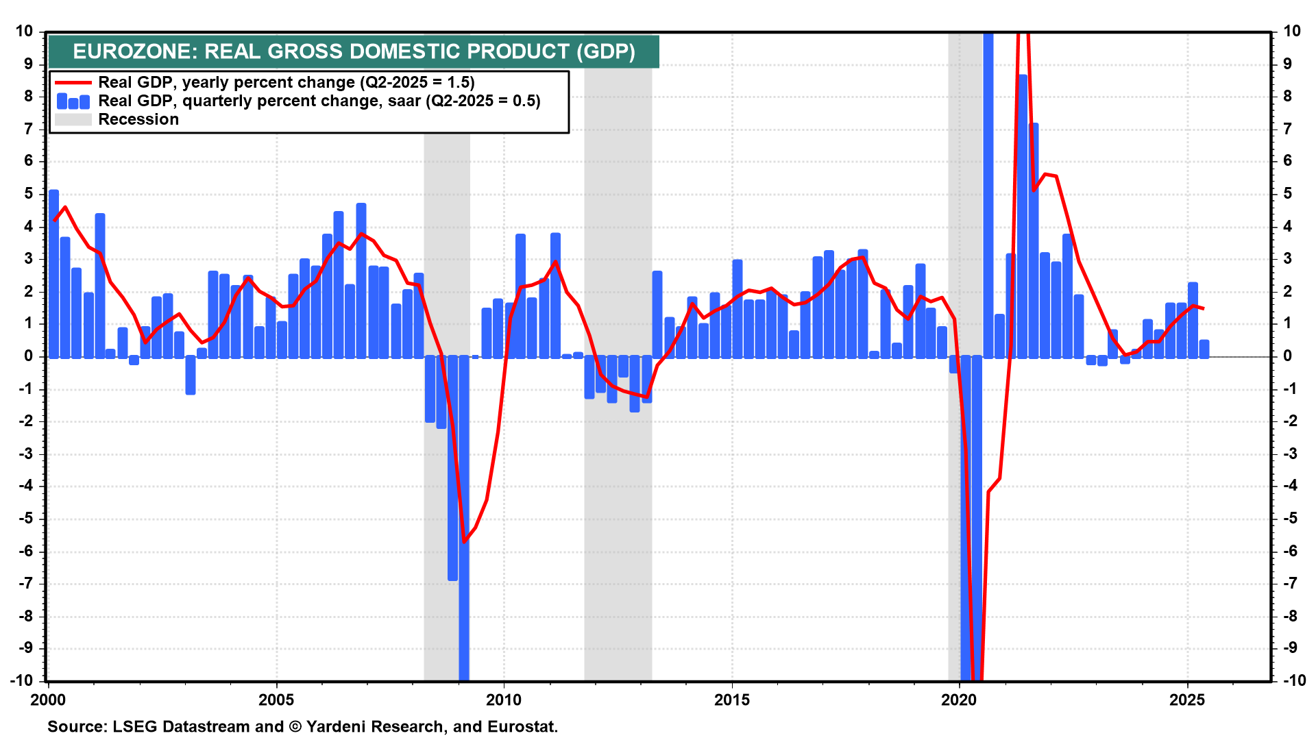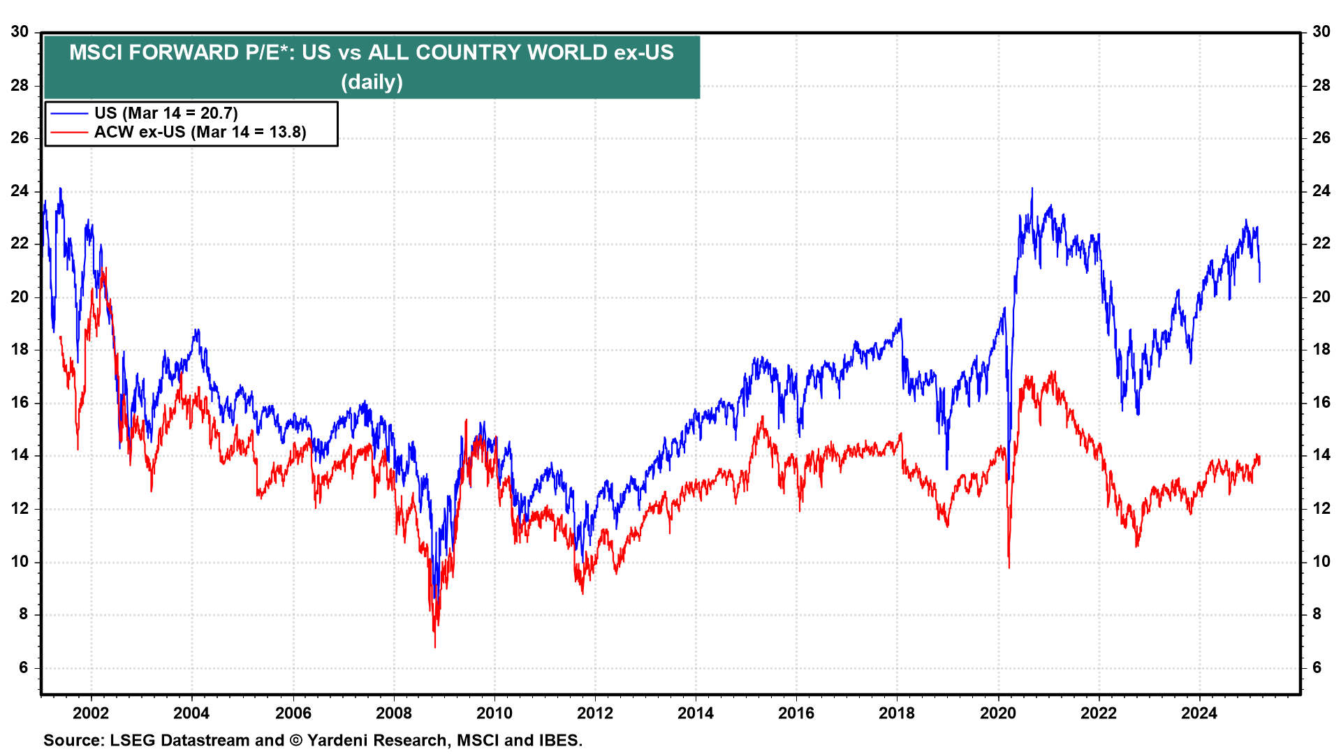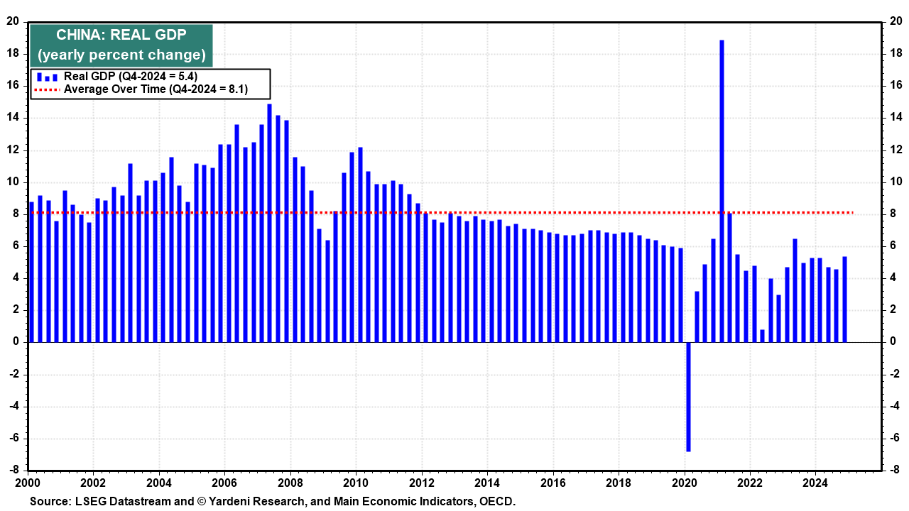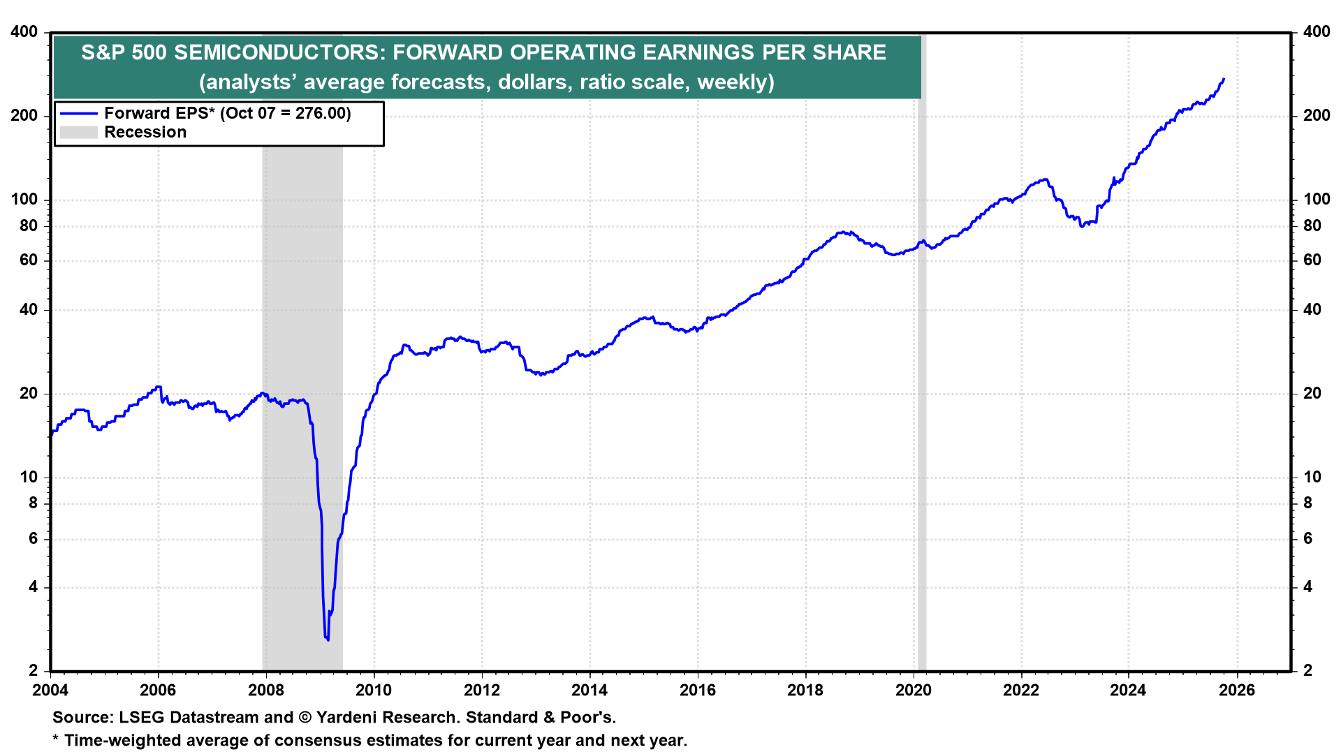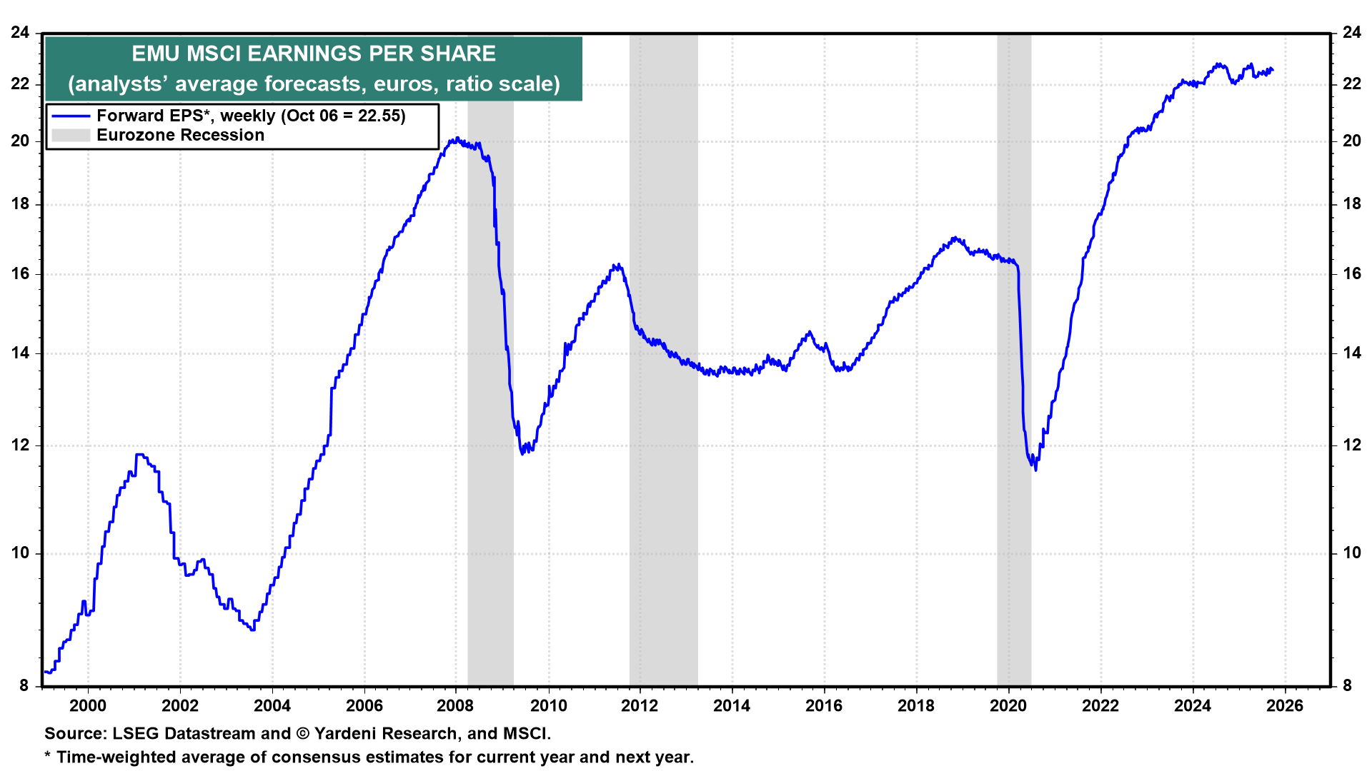 (1) India leads Asian economies. The Reserve Bank of India (RBI) expects India’s real GDP growth to approach the government’s 7.0% target during its fiscal year 2025-26 (Fig. 11). The region remains the world’s fastest growing economy. With the India MSCI trading at 22.6 times forward earnings, however, investors certainly are paying for that growth.