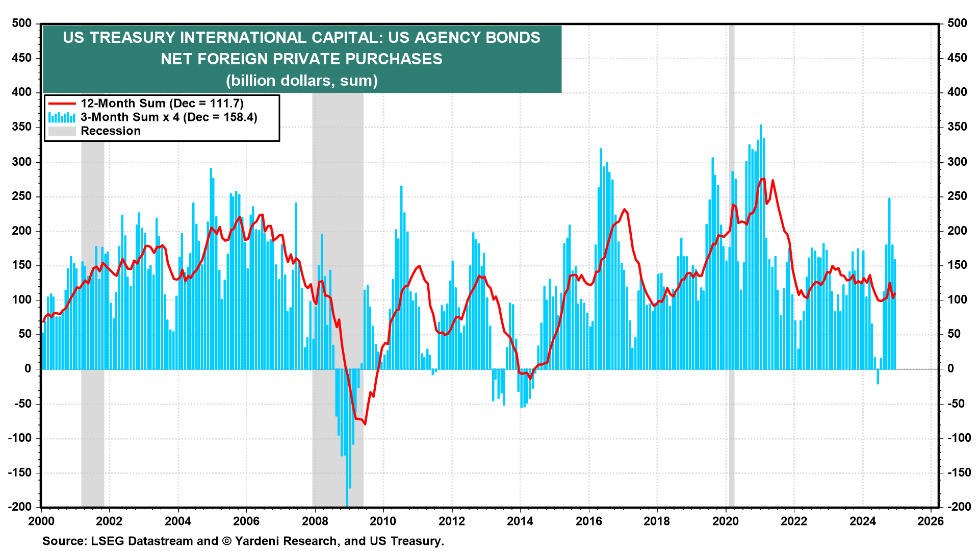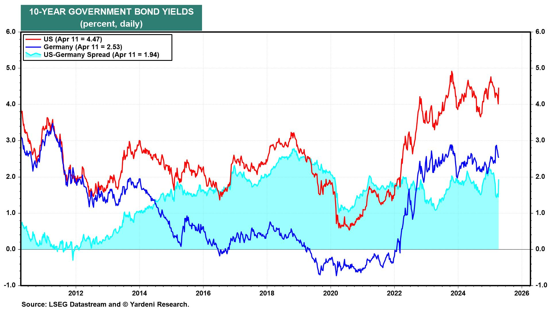 Right on cue, the economics punditariat is lining up with takes on the dollar’s inevitable demise. The dollar is down 12% versus the euro this year and down less than 1% versus the yen (Fig. 5). Yet there are reasons to believe that recent dollar losses represent a correction, not the start of a downtrend, and reasons to be bullish on the dollar’s outlook for the year ahead.