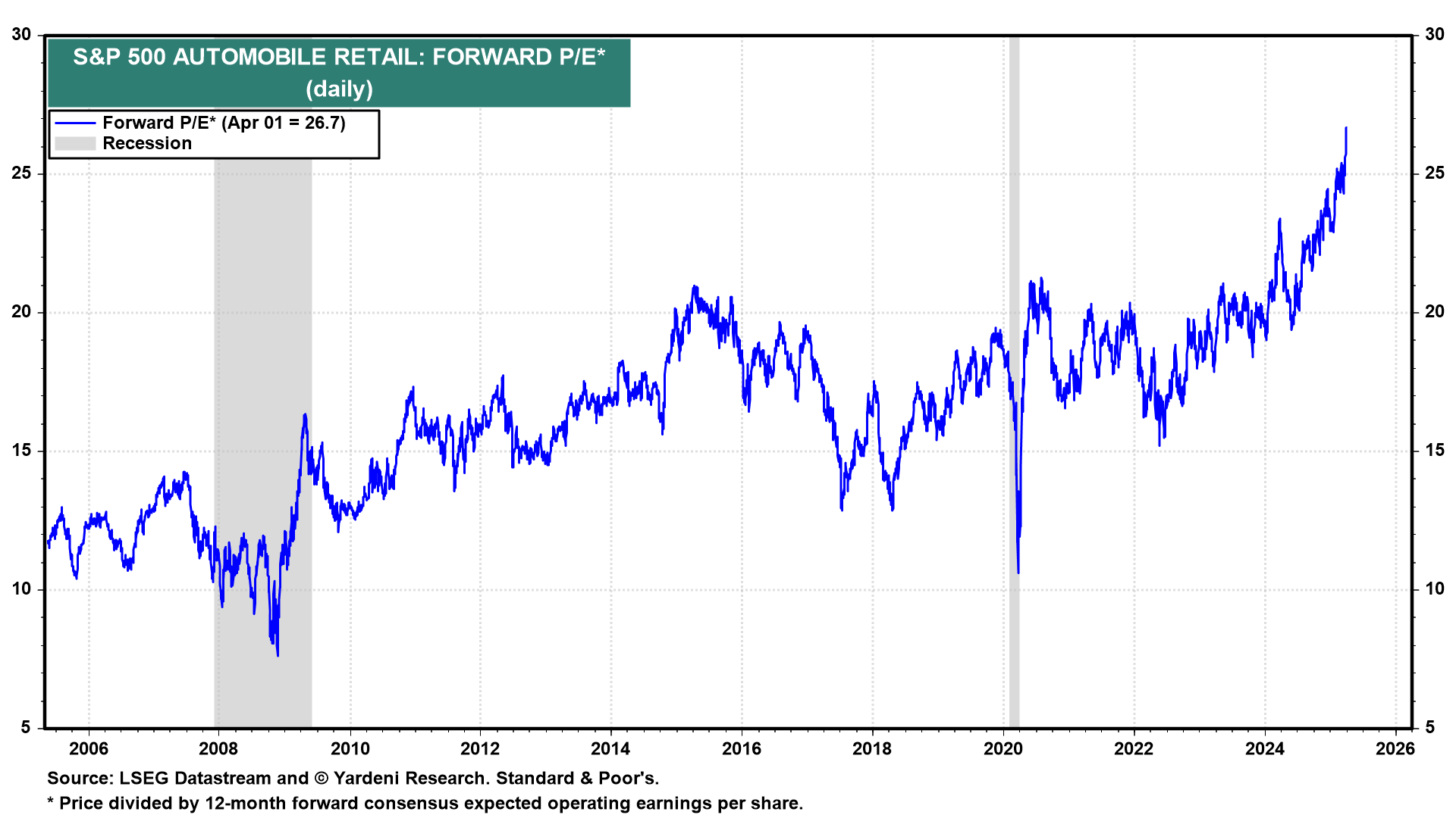 However, single-digit y/y earnings growth and even y/y declines are forecast for nearly all S&P 500 sectors. Furthermore, expected y/y revenues growth lags earnings growth for six of the 11 sectors as tariffs take hold. Growth within the S&P 500 has become top-heavy in Q4: Just three sectors have faster expected revenues growth than the S&P 500 (the same as Q3’s count), and only ONE has higher expected earnings growth (versus five last quarter).