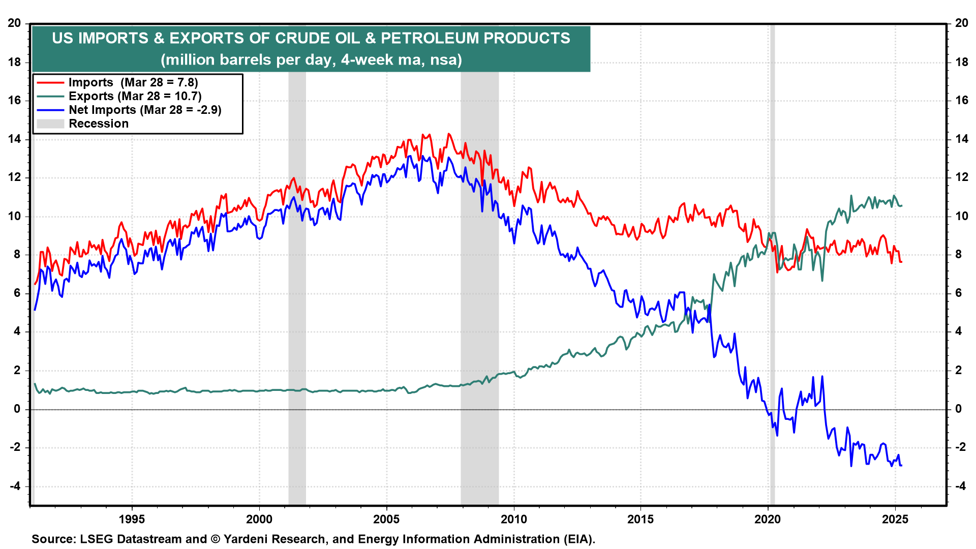 (6) Bear: oversupply. The US Energy Information Administration’s (EIA) oil price outlook is stark: With global oversupply the dominant theme, the EIA estimates that the prices of both West Texas Intermediate and Brent crude oil will average below $60 a barrel in 2026. However, we think the EIA’s forecasts tend to be overly pessimistic. Nonetheless, even with OPEC+ pausing output hikes, non-OPEC producers continue to add barrels (Fig. 2). US production remains near record highs, although we are monitoring signs of a potential growth slowdown (Fig. 3).