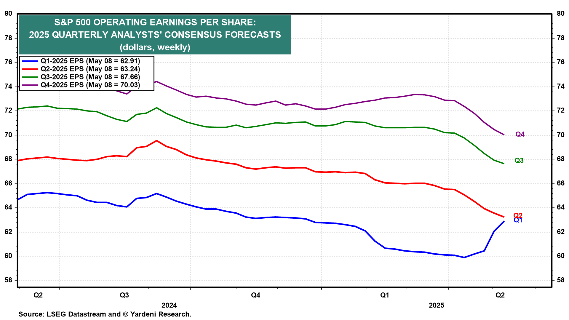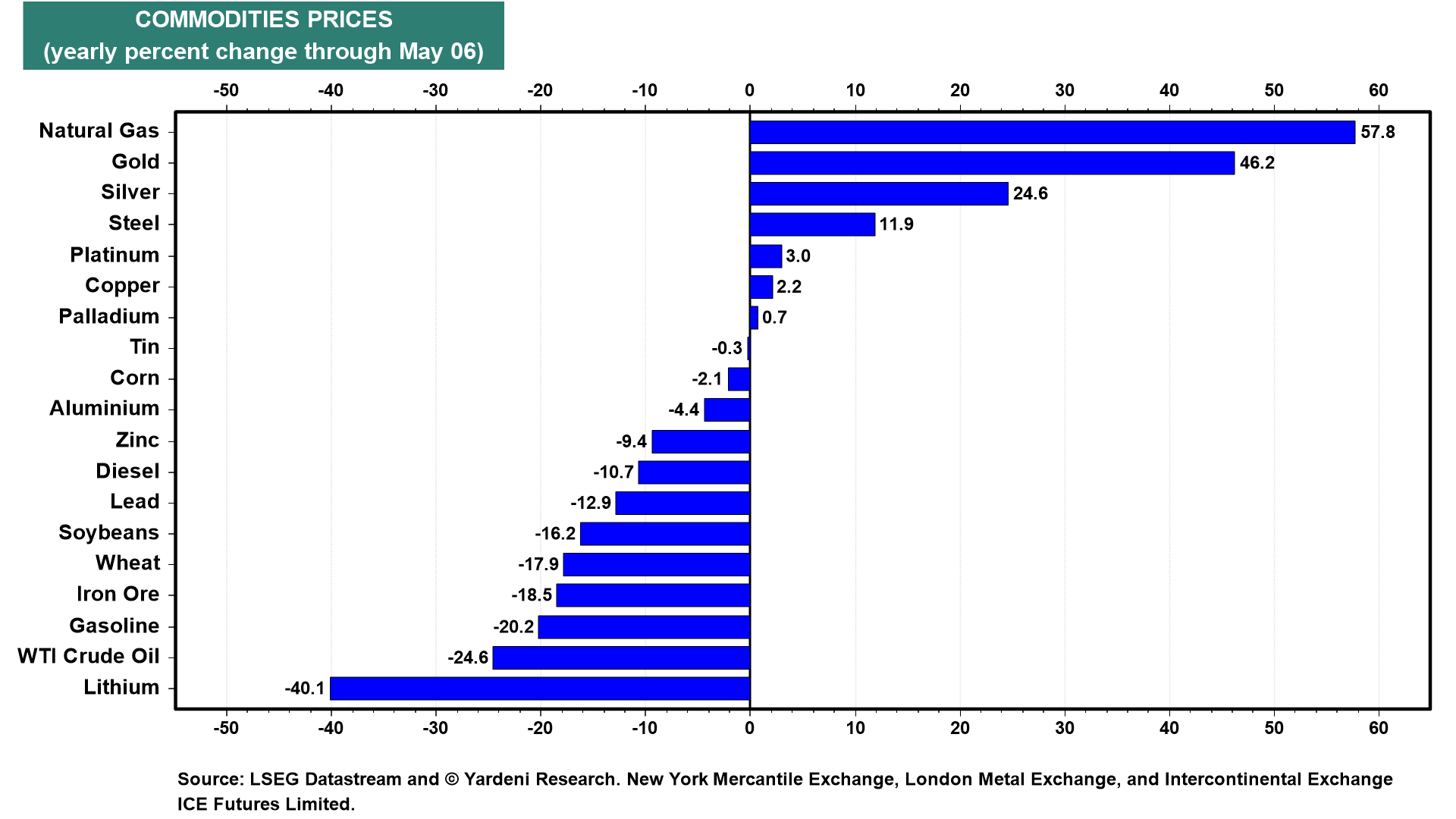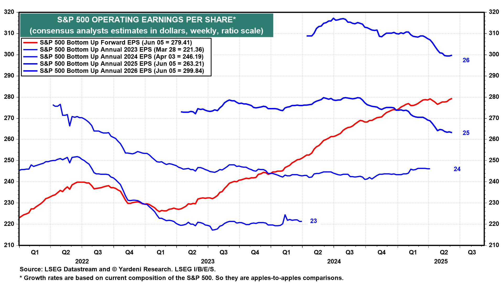 Strategy: A Peek at 2026 Earnings Prospects. The full-year earnings growth forecasted for companies in the S&P 500 this year is a solid 12.9%, and analysts expect even stronger growth in 2026, rising 14.8%. The strength is broad based. Each of the S&P 500 sectors is forecast to grow earnings y/y in 2026: Information Technology (28.1%), Materials (20.3), Industrials (15.1), S&P 500 (14.8), Consumer Discretionary (11.9), Communication Services (9.9), Health Care (9.4), Utilities (9.3), Financials (9.2), Energy (9.0), Real Estate (8.8), and Consumer Staples (7.0) (Table 1).