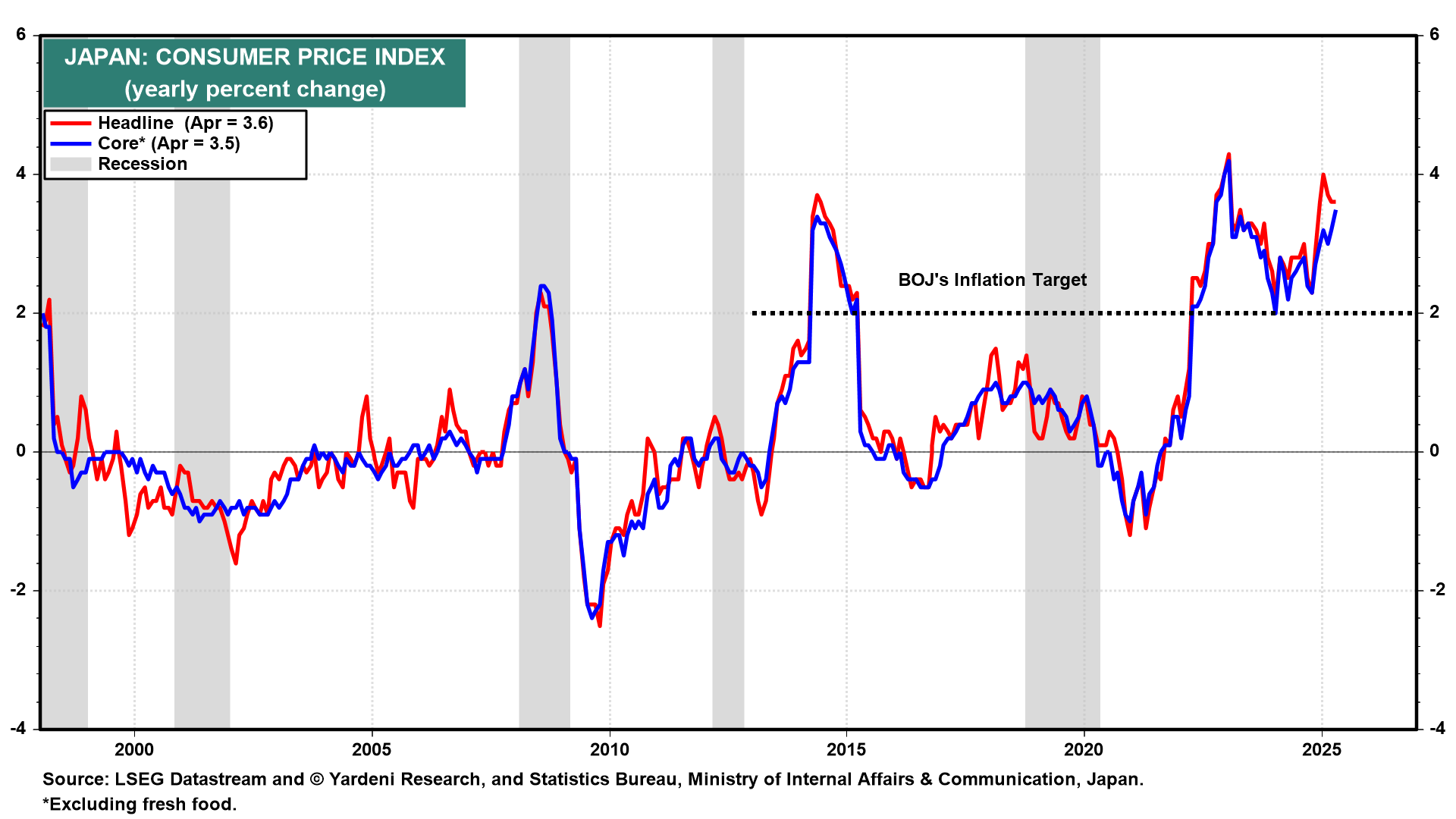 (1) Bond Vigilantes pounce. Leading the tightening camp are the ranks of the Bond Vigilante pushing 10-year Japanese government bond (JGB) yields to the highest levels since 2007 (Fig. 2). To them, inflation hovering around 3.0% y/y, well above the BOJ’s 2.0% target, demands a fresh dose of monetary restraint.