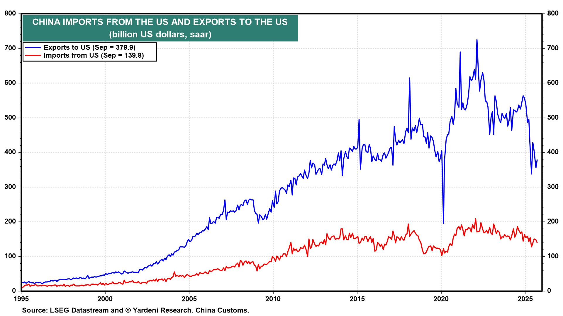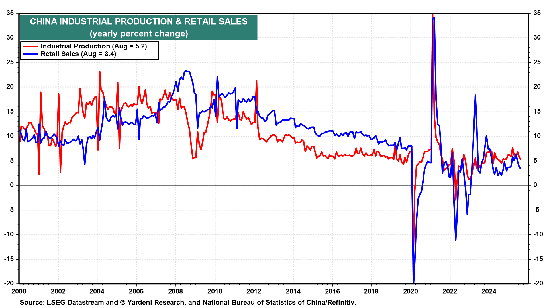 For Xi, the easiest way to limit the damage is to negotiate a trade deal with the Trump administration. Until now, China has slow-walked talks, betting that Trump is desperate enough for a “grand bargain” pact that Team Xi need give up very little and buying time to woo some major economies away from the US into China’s orbit. At this, China has met with some real success. Southeast Asia is now China’s top market, followed by the EU. That’s limiting the damage from US tariffs. Even though US-bound shipments from China fell 27% y/y in September, China’s overall exports rose 8.3% y/y (Fig.1).