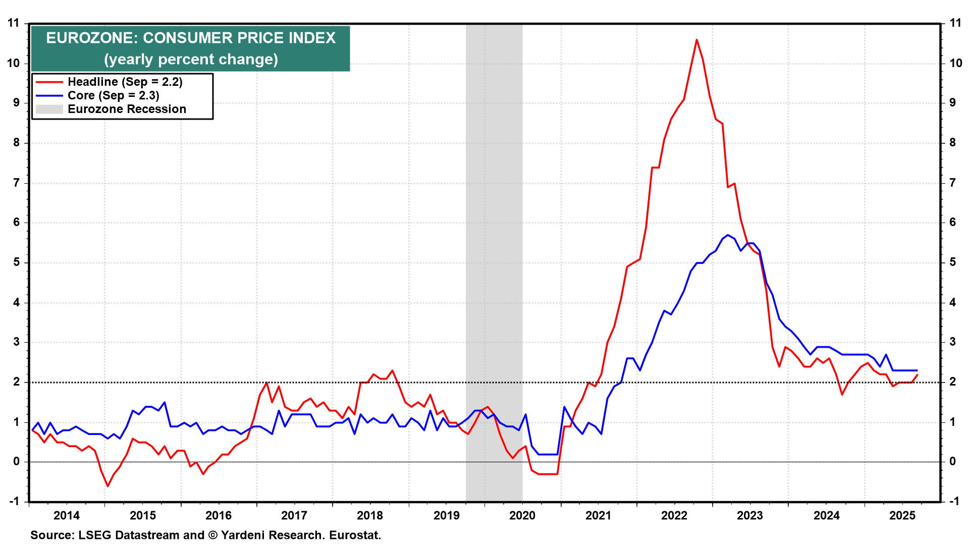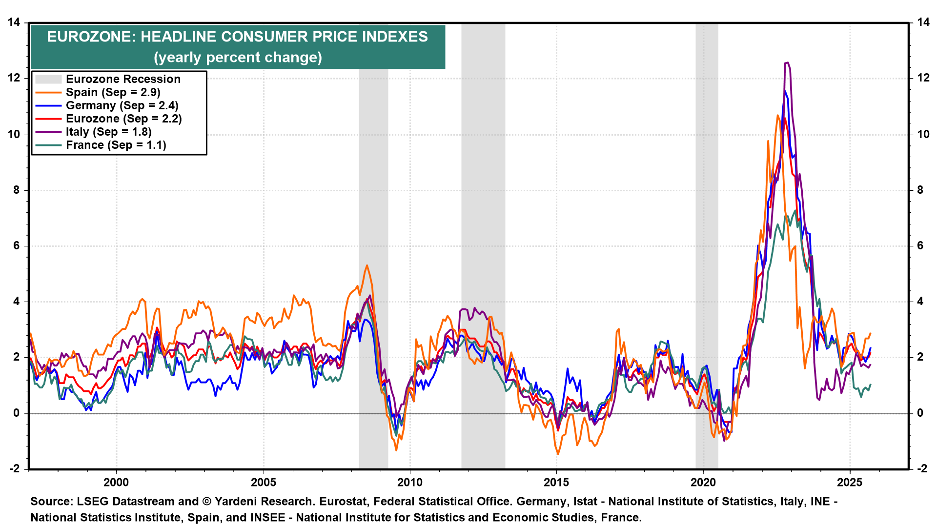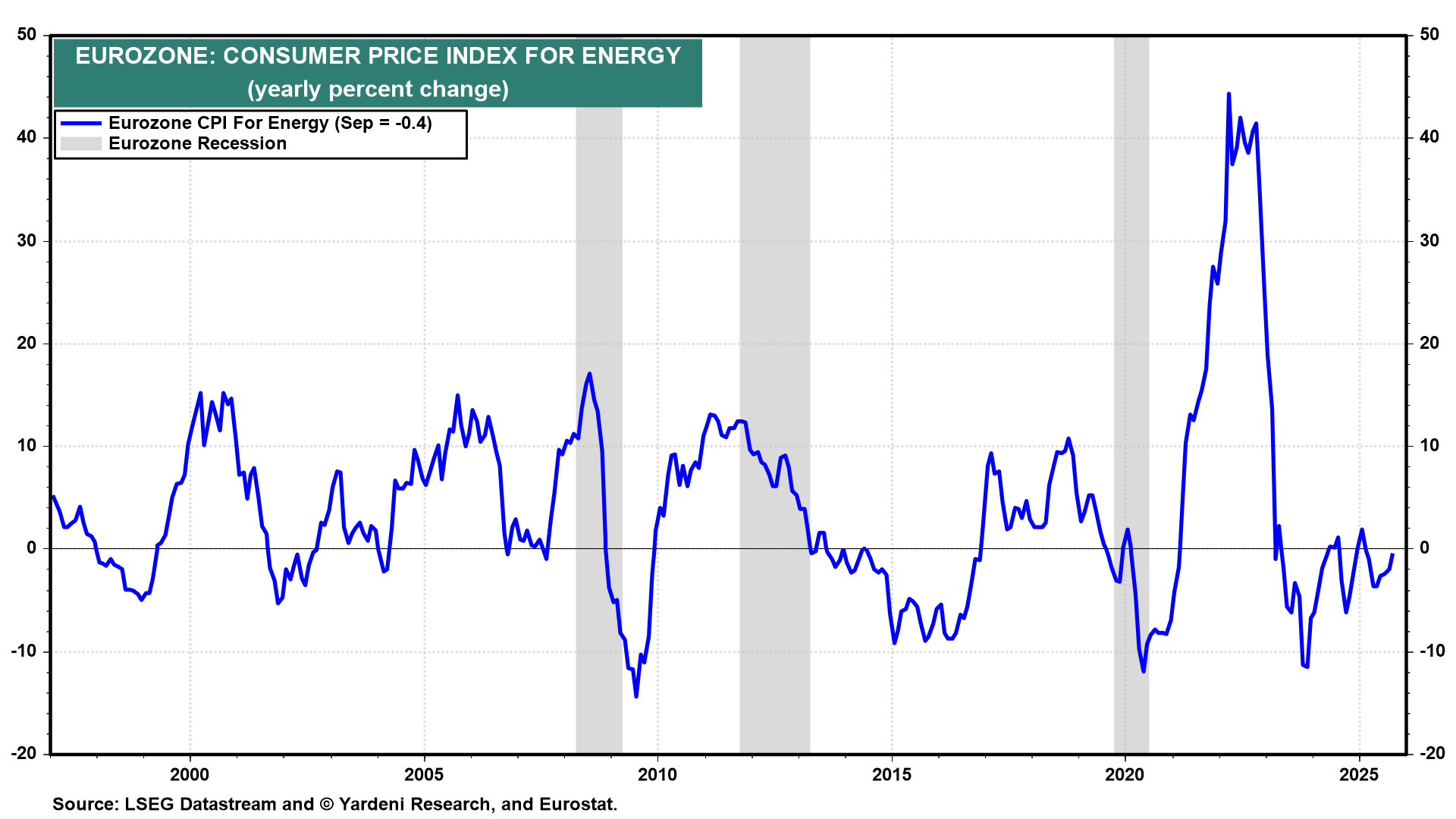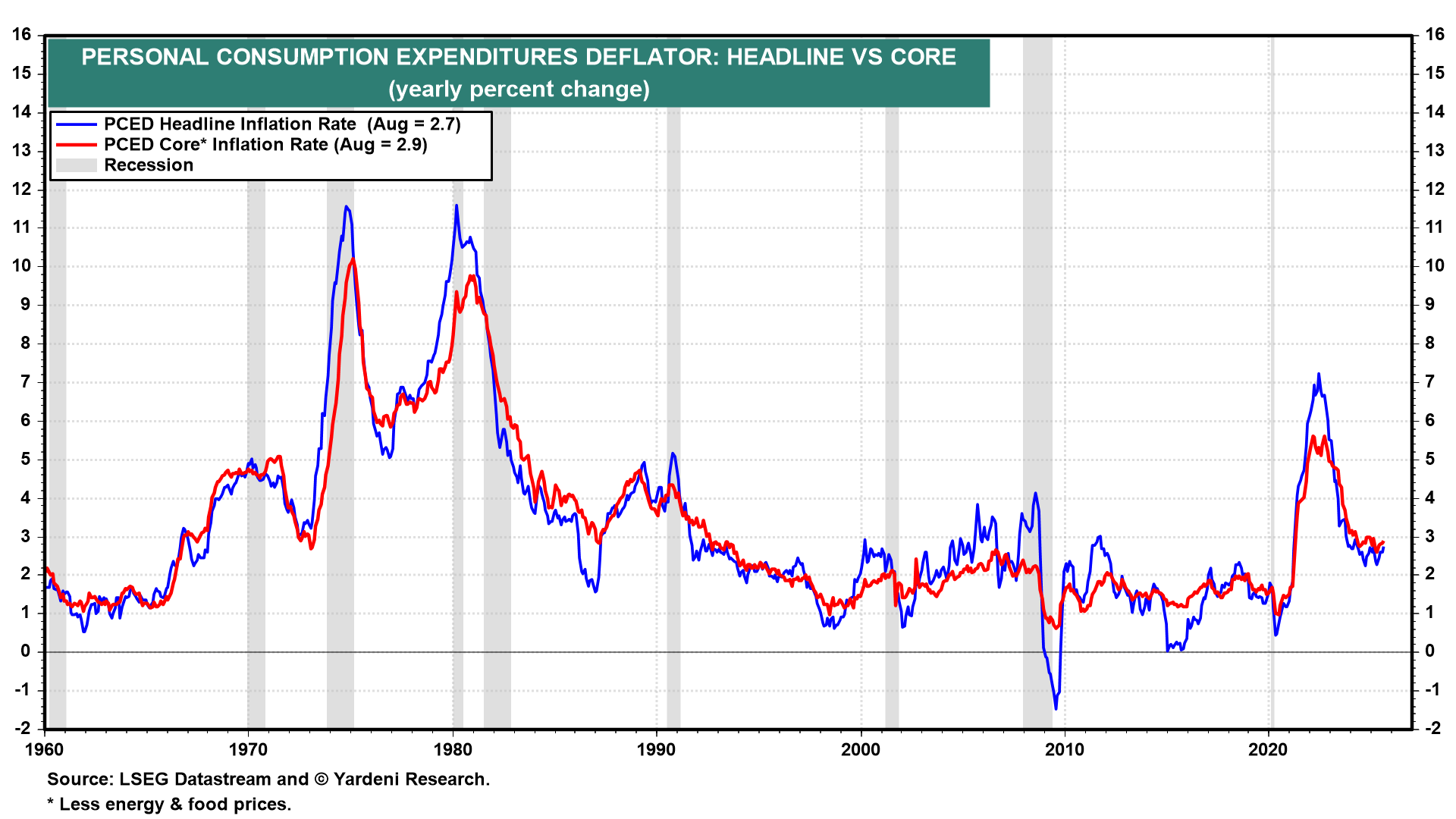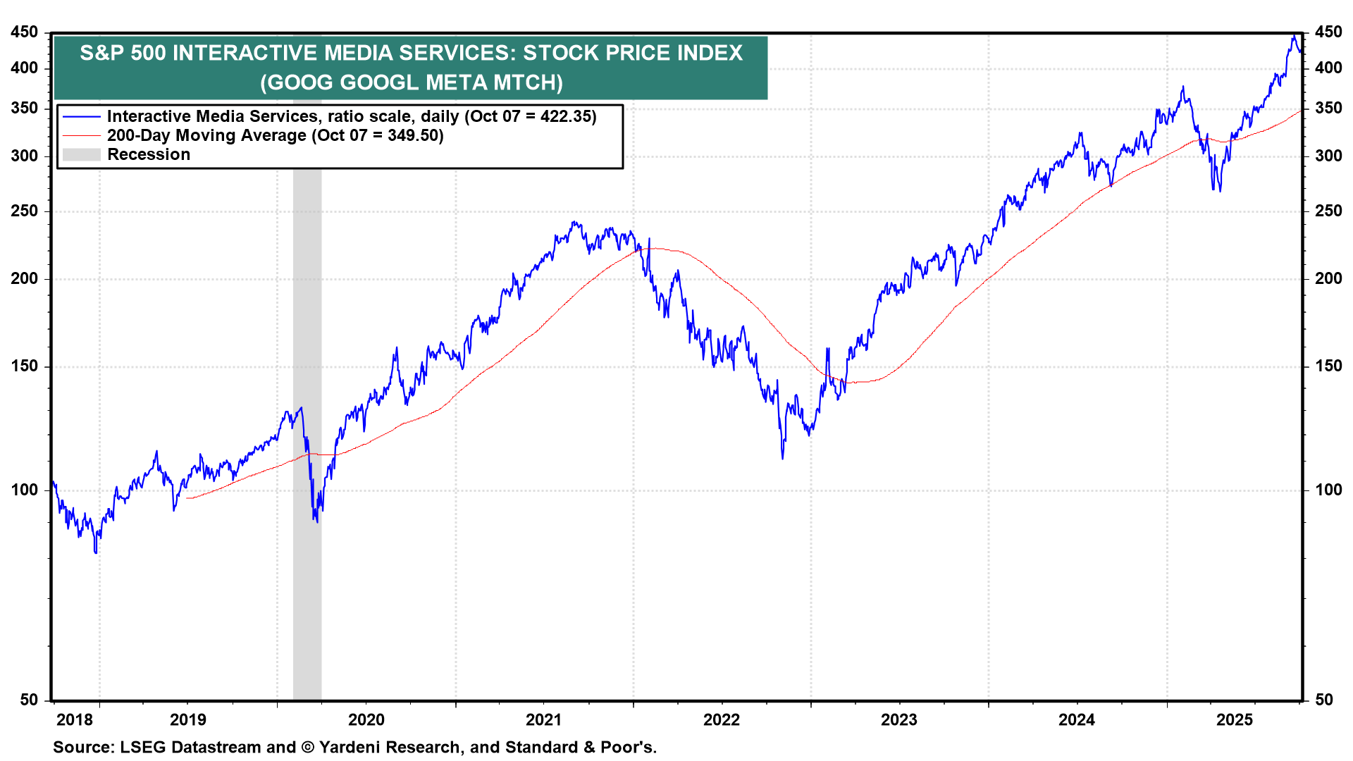 (2) Inflation’s temporary pressures. Powell acknowledged that inflation remains above the Fed’s 2.0% target, but he attributed this mostly to tariff pass-throughs that should diminish over the longer term (Fig. 6). The September Minutes similarly highlighted that the latest price pressures likely reflect temporary effects of tariff increases rather than sustained inflation.