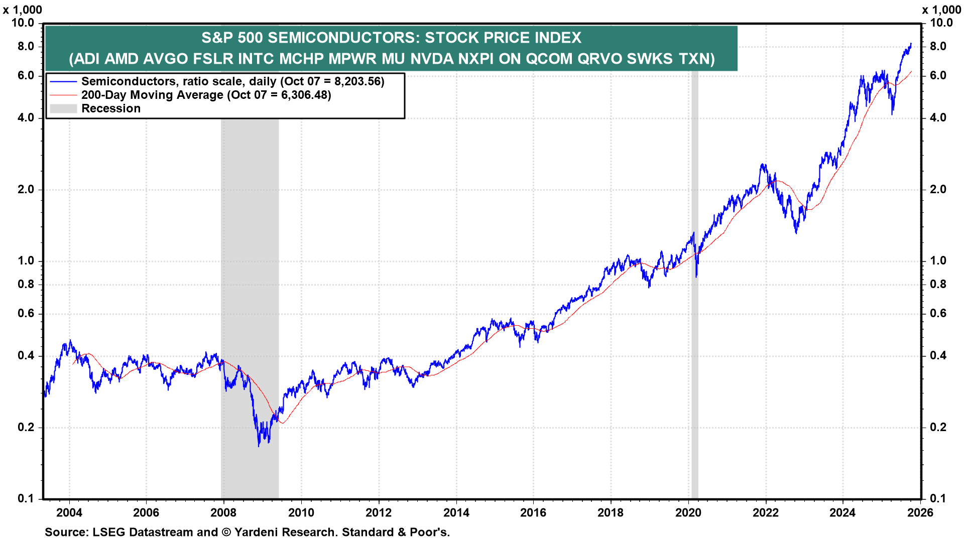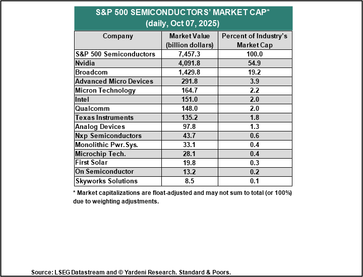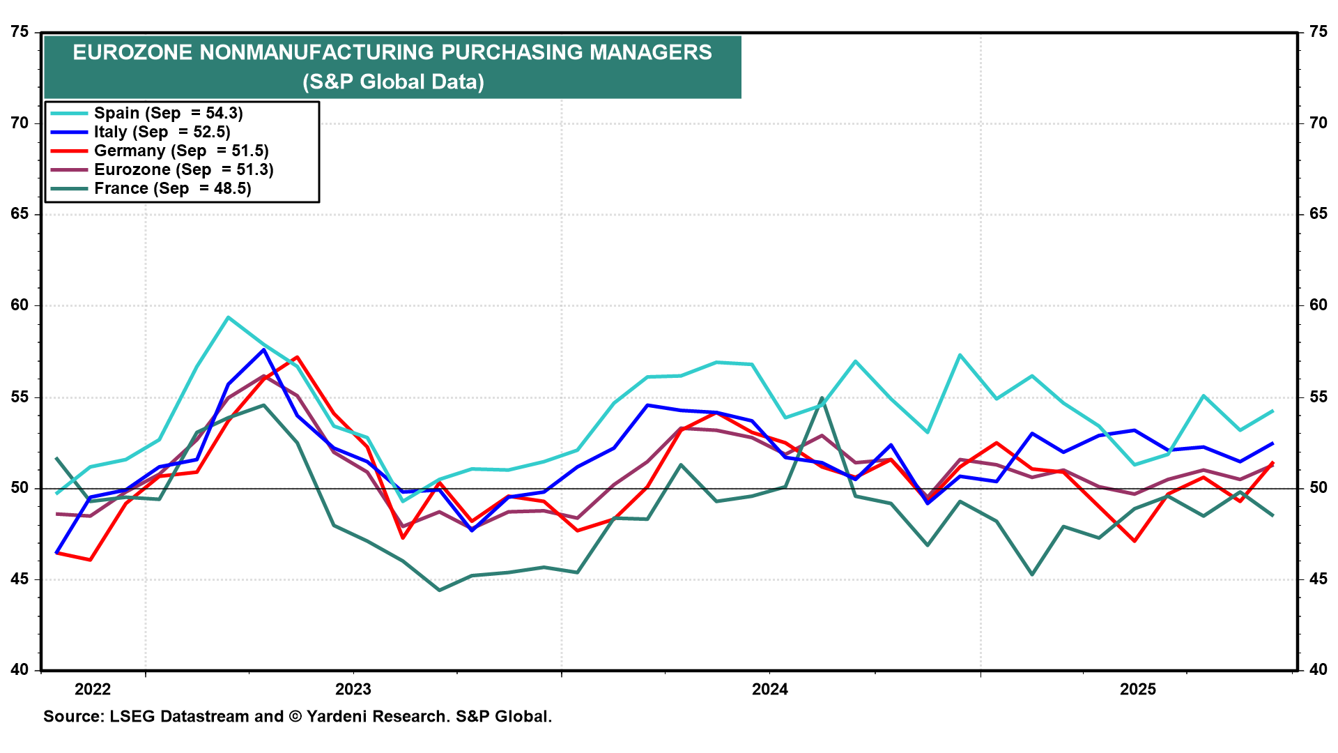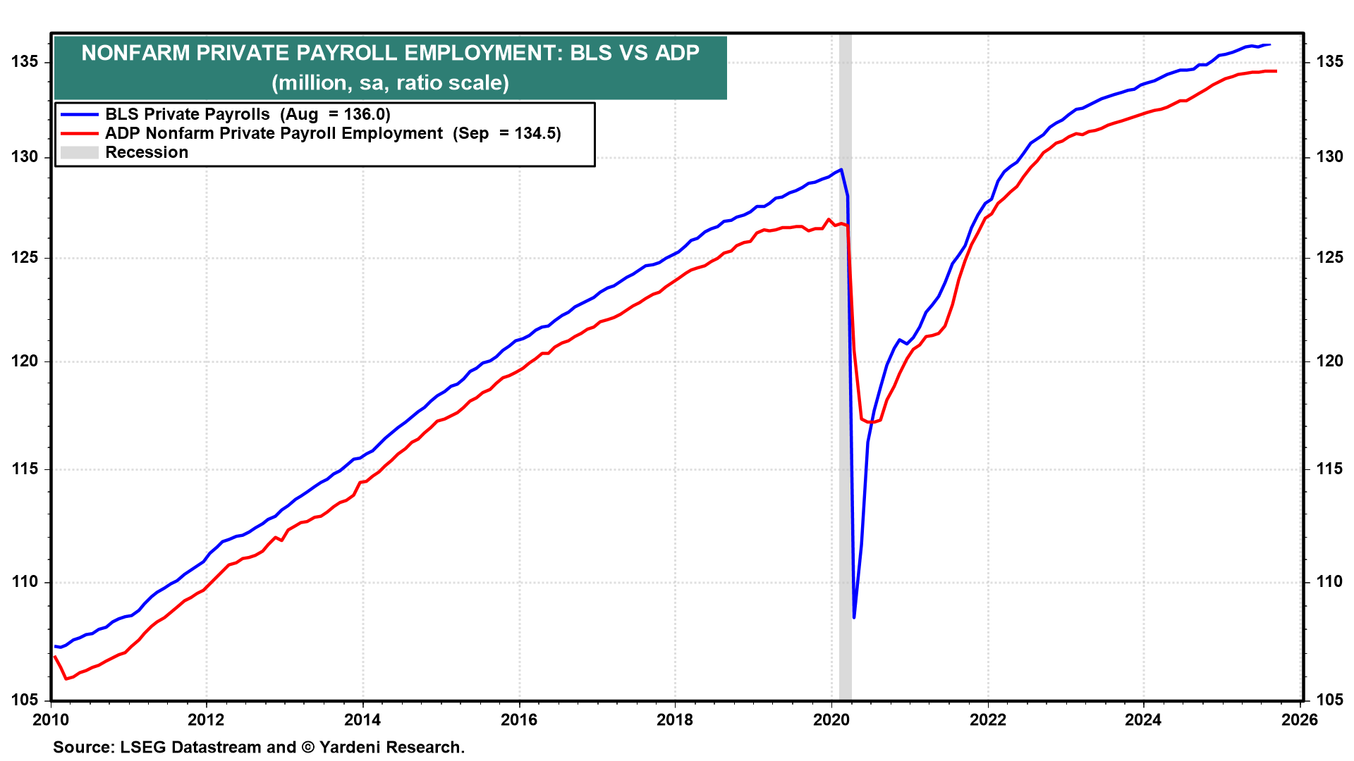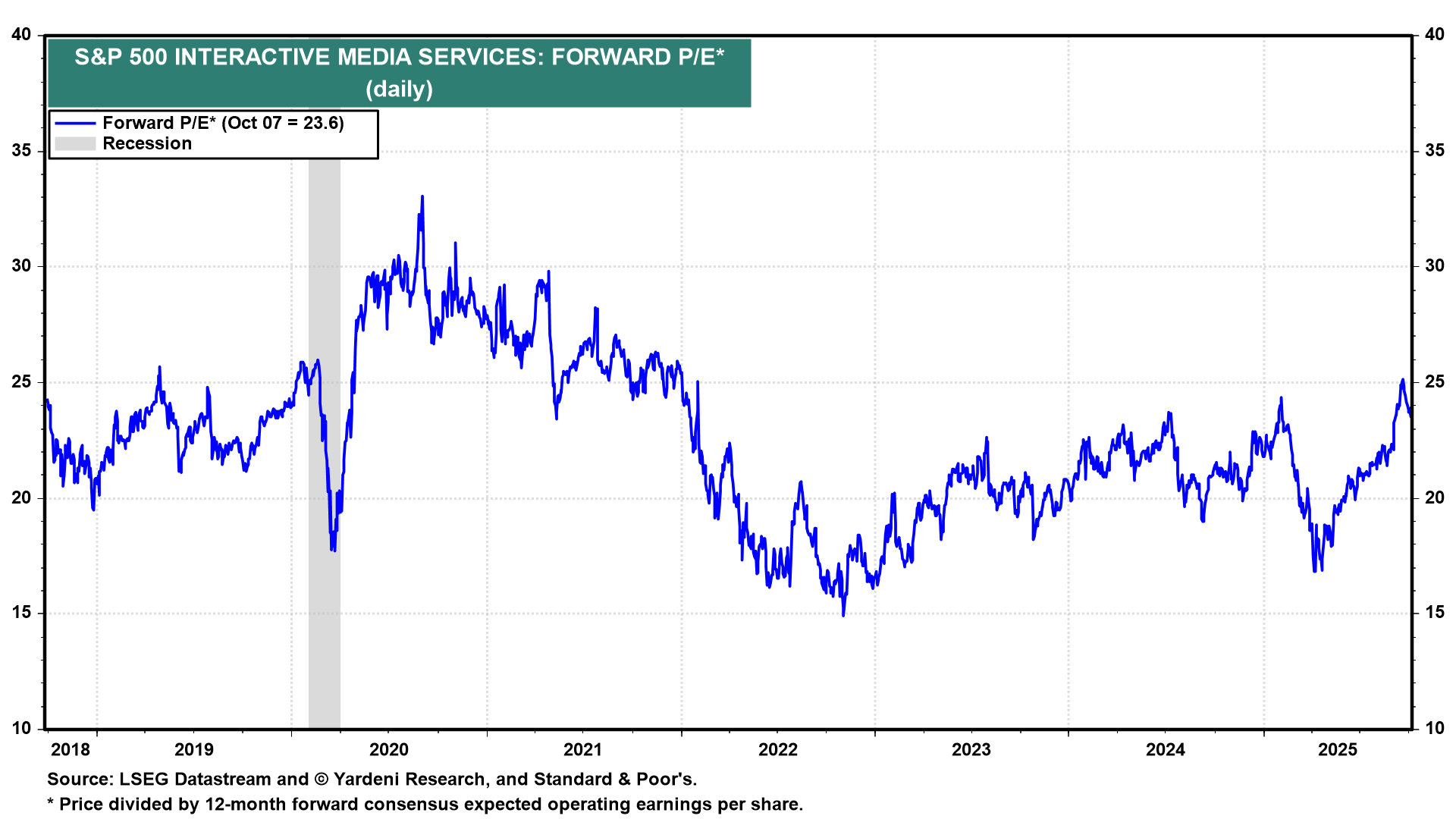 (2) Inflation’s temporary pressures. Powell acknowledged that inflation remains above the Fed’s 2.0% target, but he attributed this mostly to tariff pass-throughs that should diminish over the longer term (Fig. 6). The September Minutes similarly highlighted that the latest price pressures likely reflect temporary effects of tariff increases rather than sustained inflation.