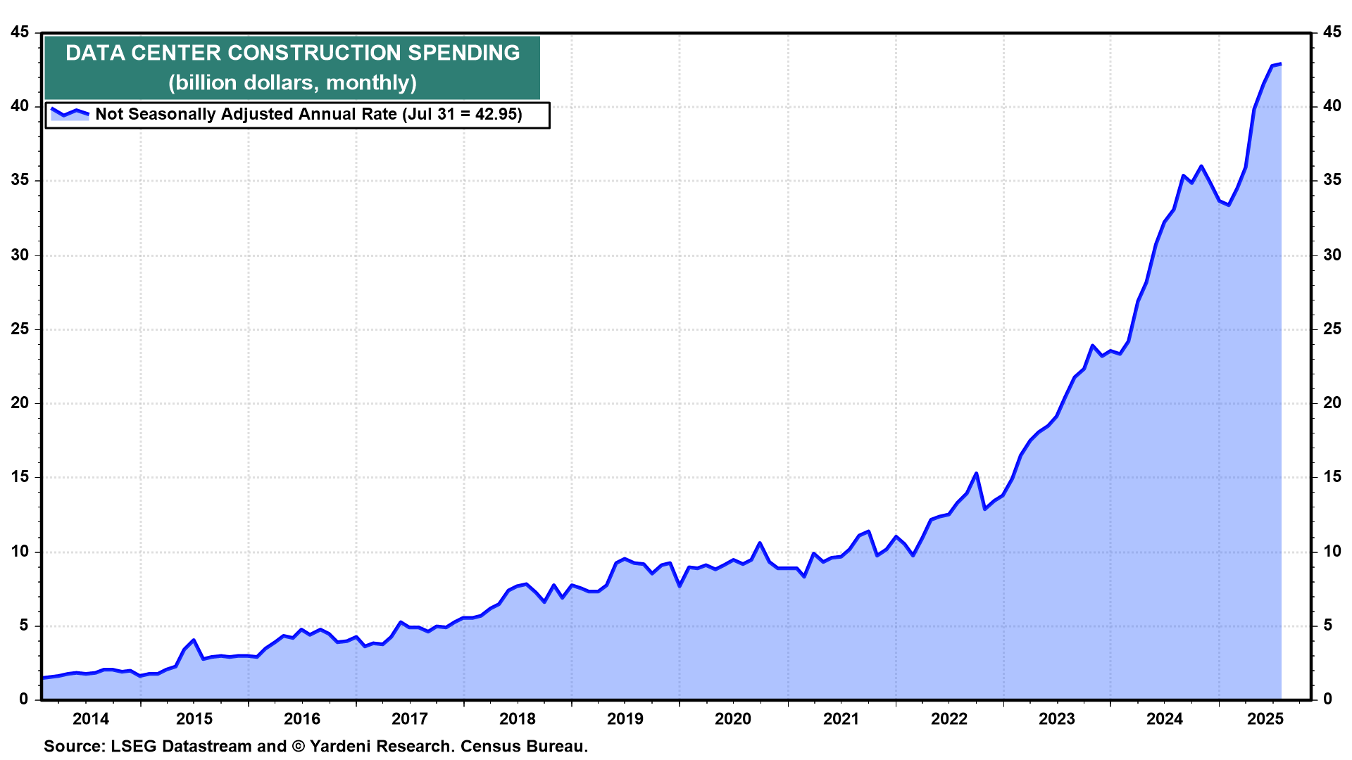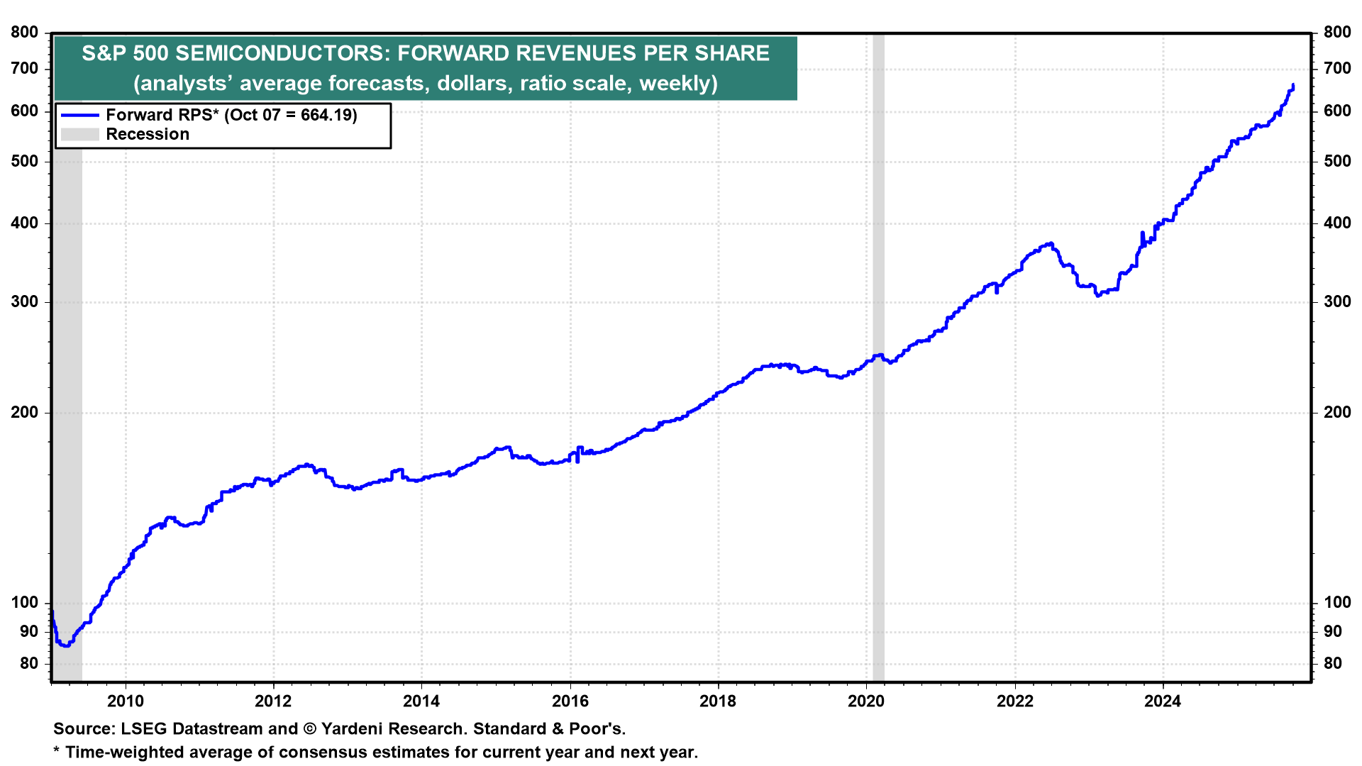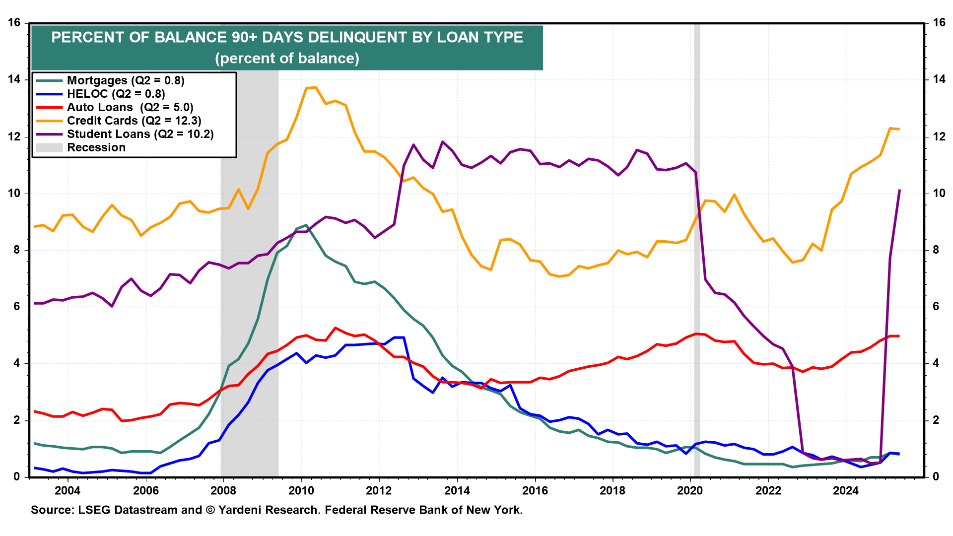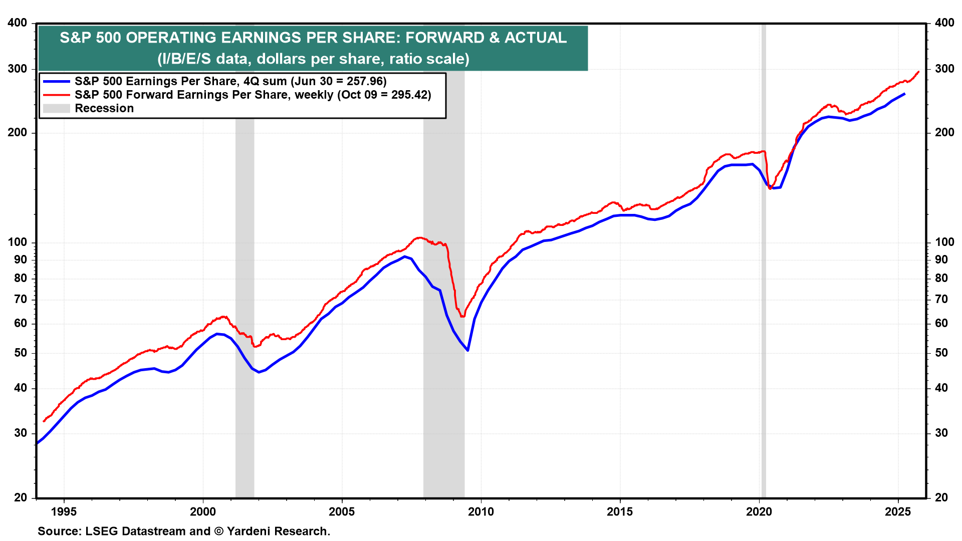 (2) Inflation’s temporary pressures. Powell acknowledged that inflation remains above the Fed’s 2.0% target, but he attributed this mostly to tariff pass-throughs that should diminish over the longer term (Fig. 6). The September Minutes similarly highlighted that the latest price pressures likely reflect temporary effects of tariff increases rather than sustained inflation.