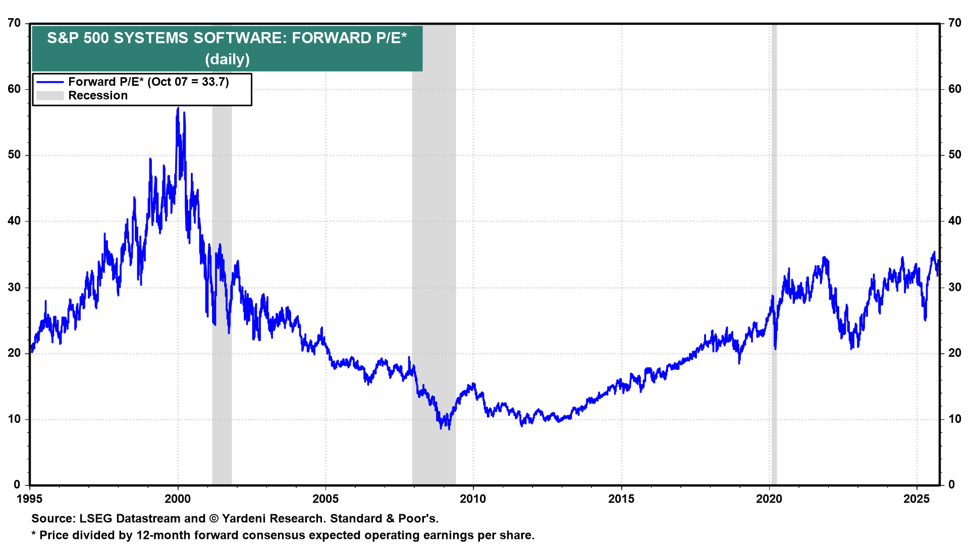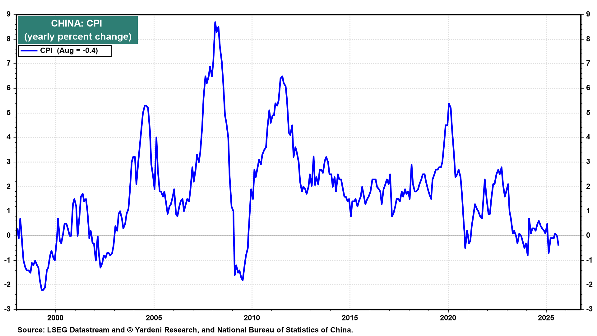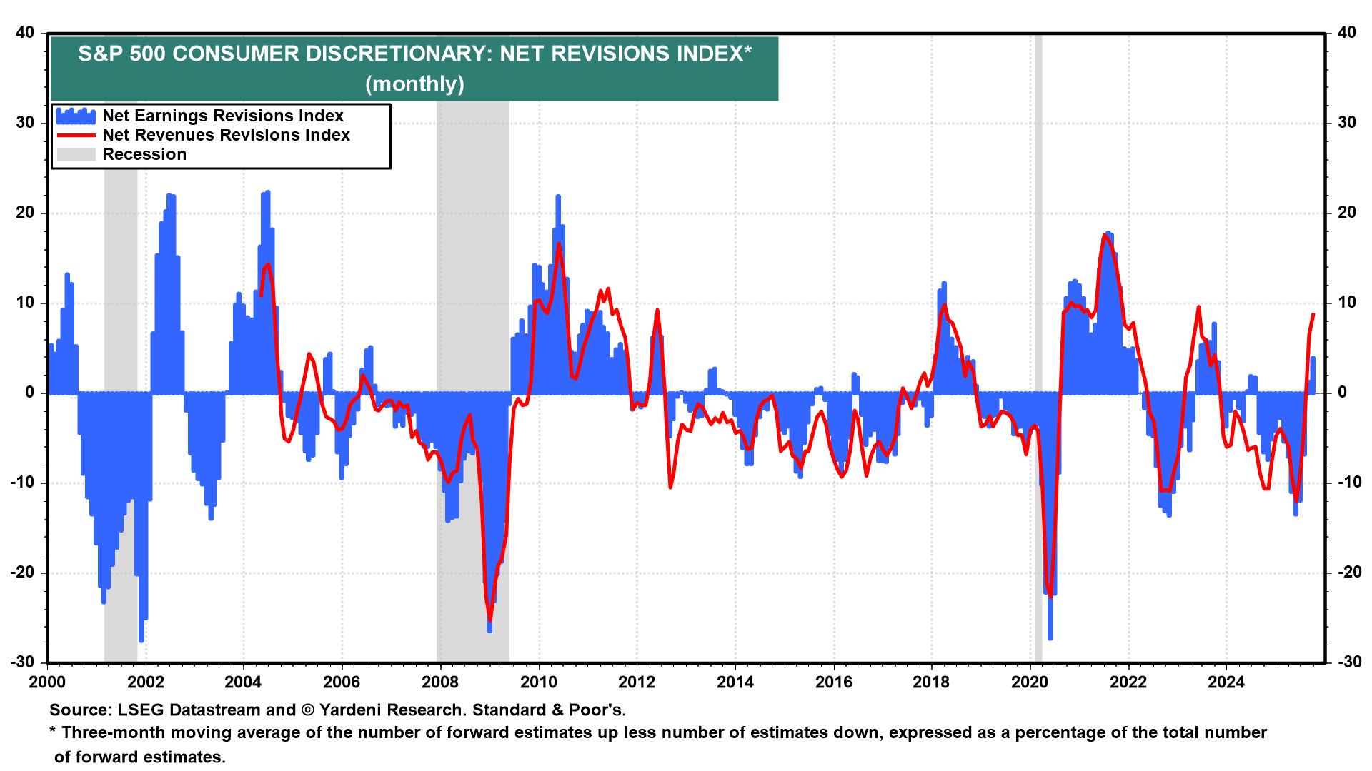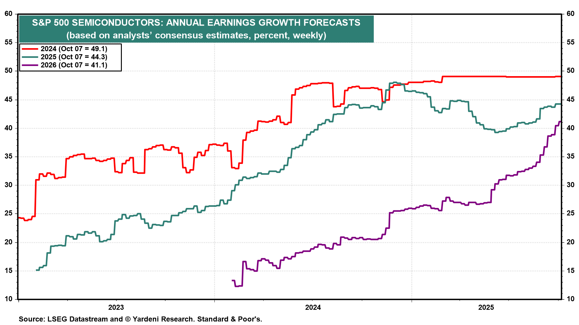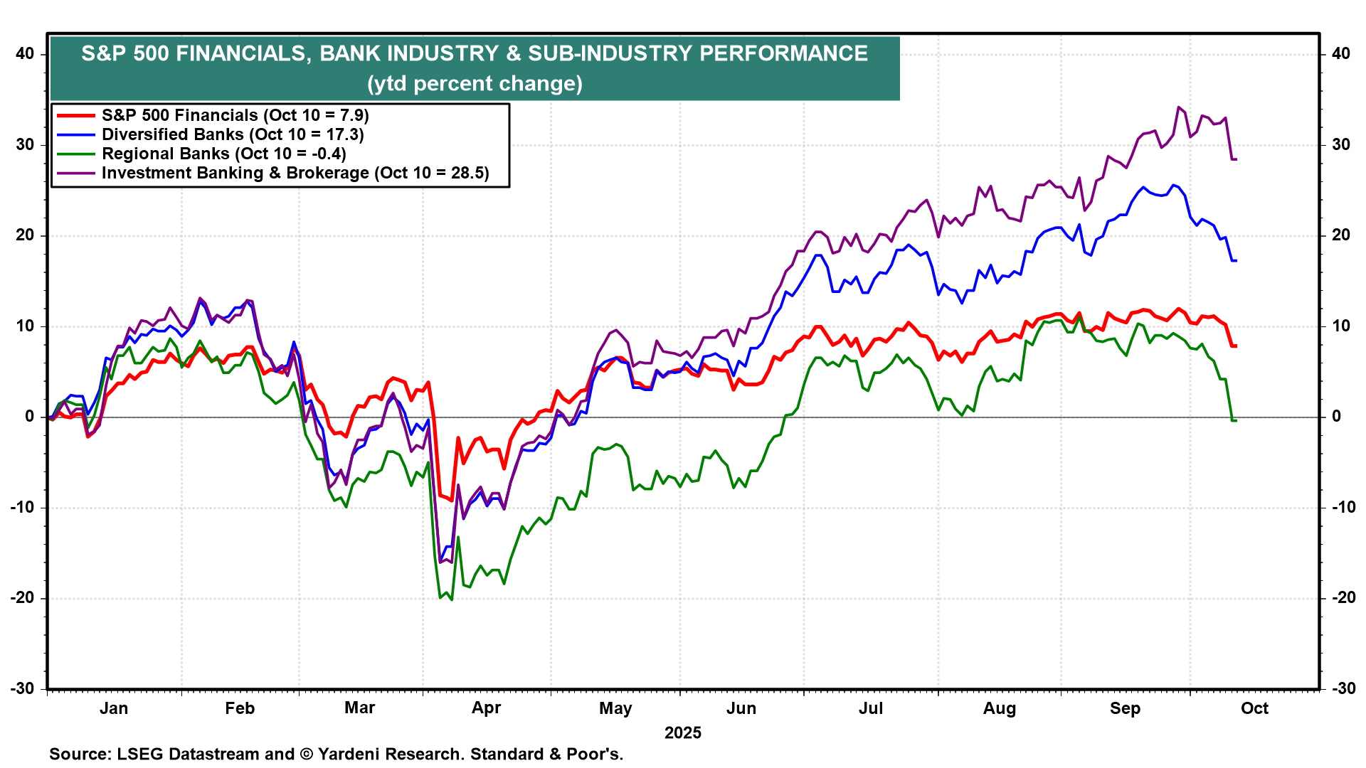 (2) Inflation’s temporary pressures. Powell acknowledged that inflation remains above the Fed’s 2.0% target, but he attributed this mostly to tariff pass-throughs that should diminish over the longer term (Fig. 6). The September Minutes similarly highlighted that the latest price pressures likely reflect temporary effects of tariff increases rather than sustained inflation.