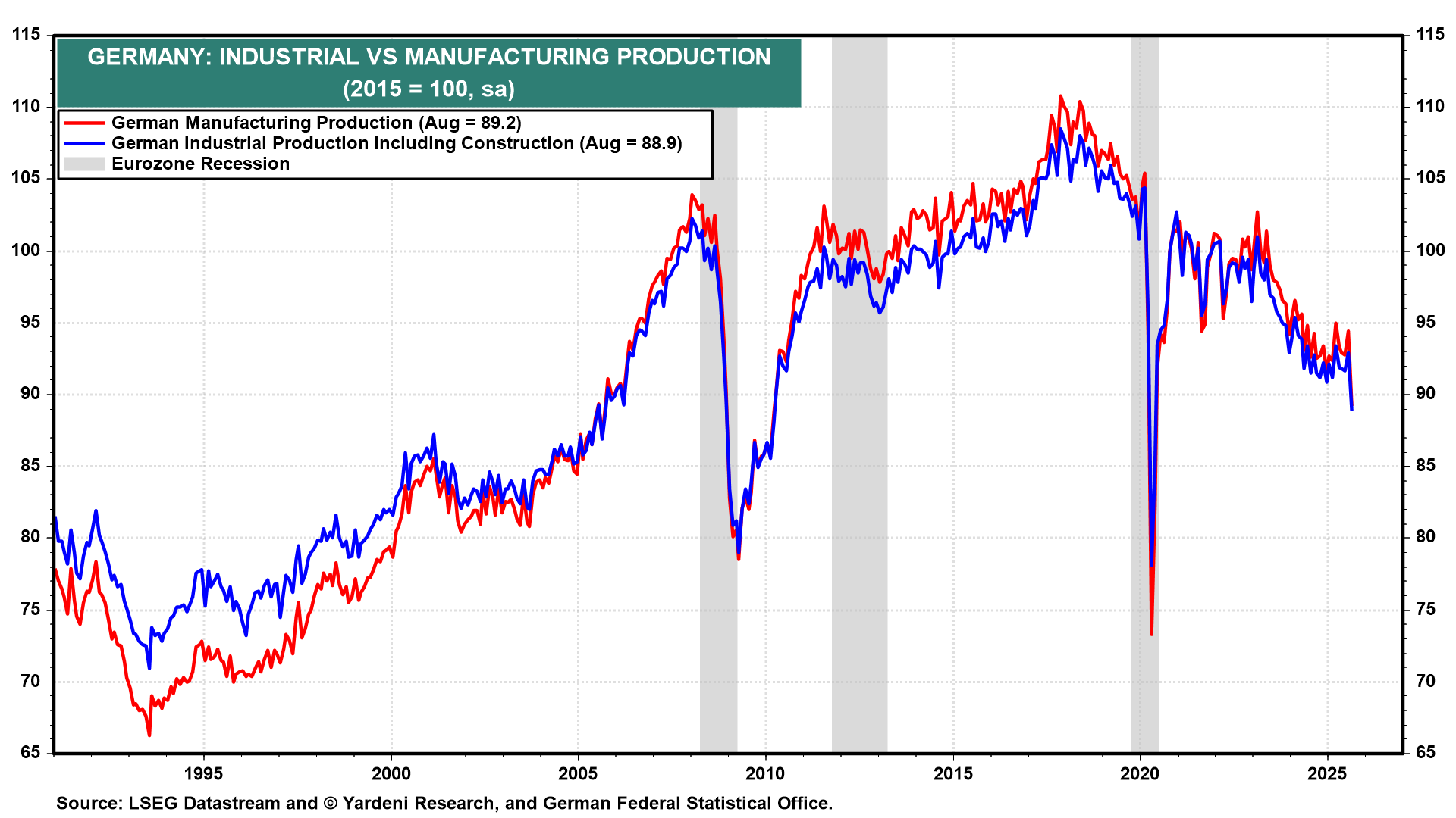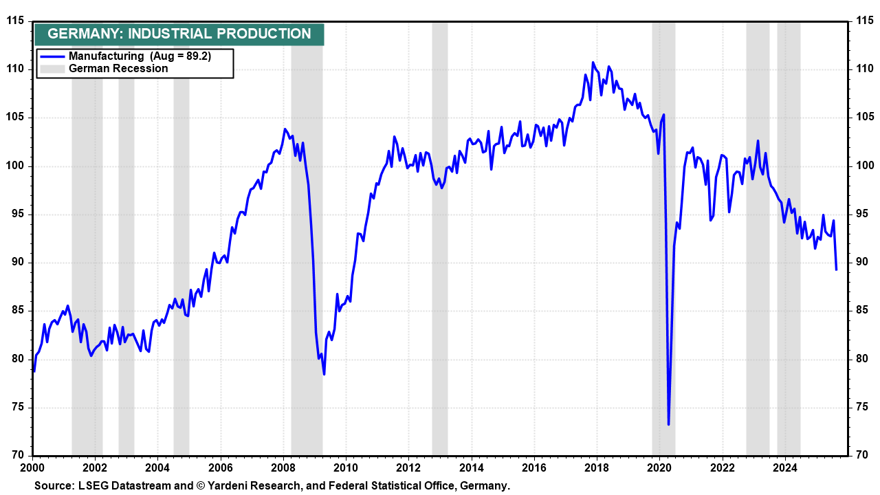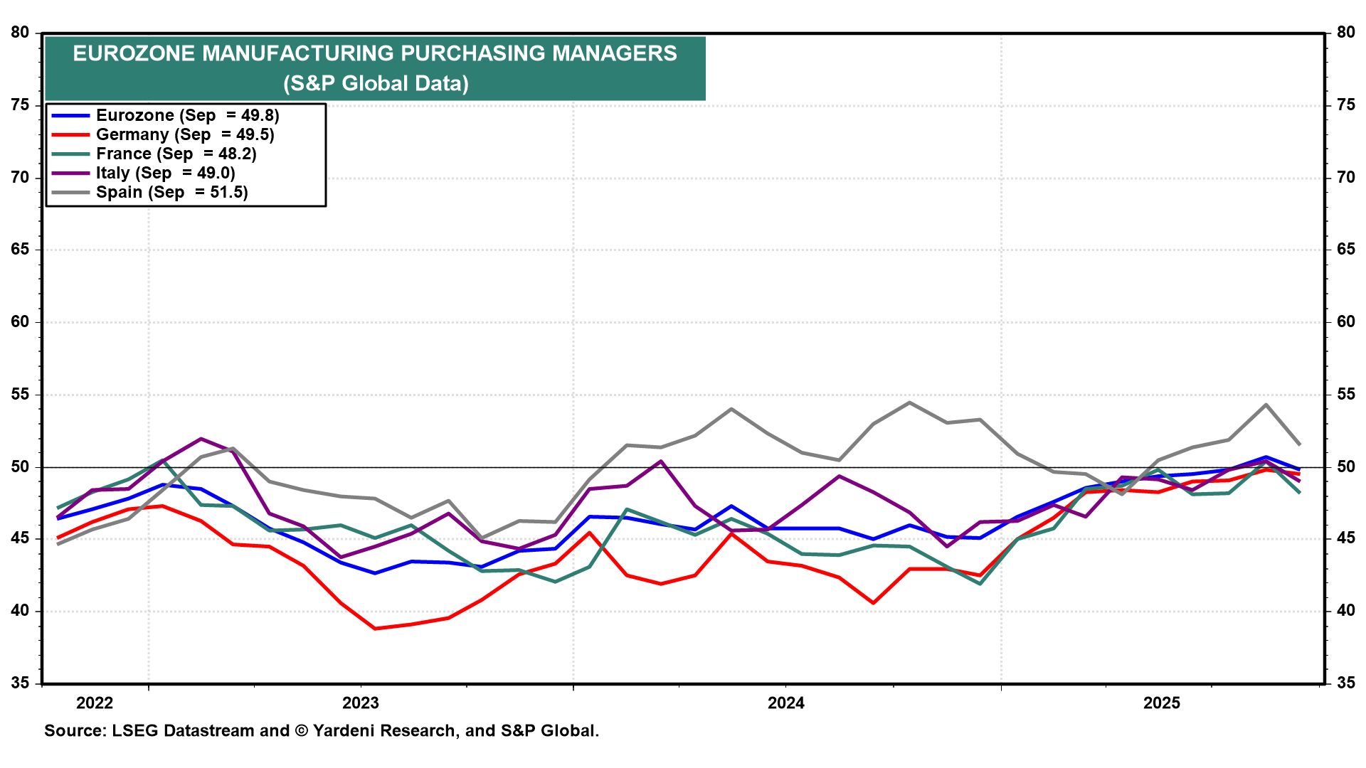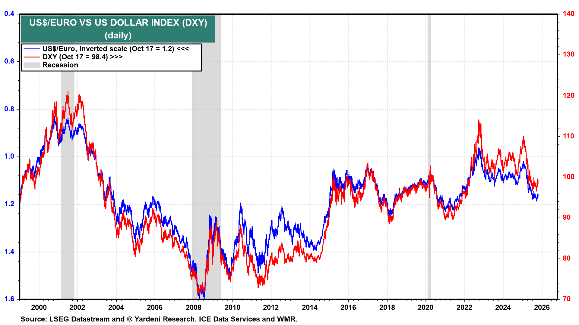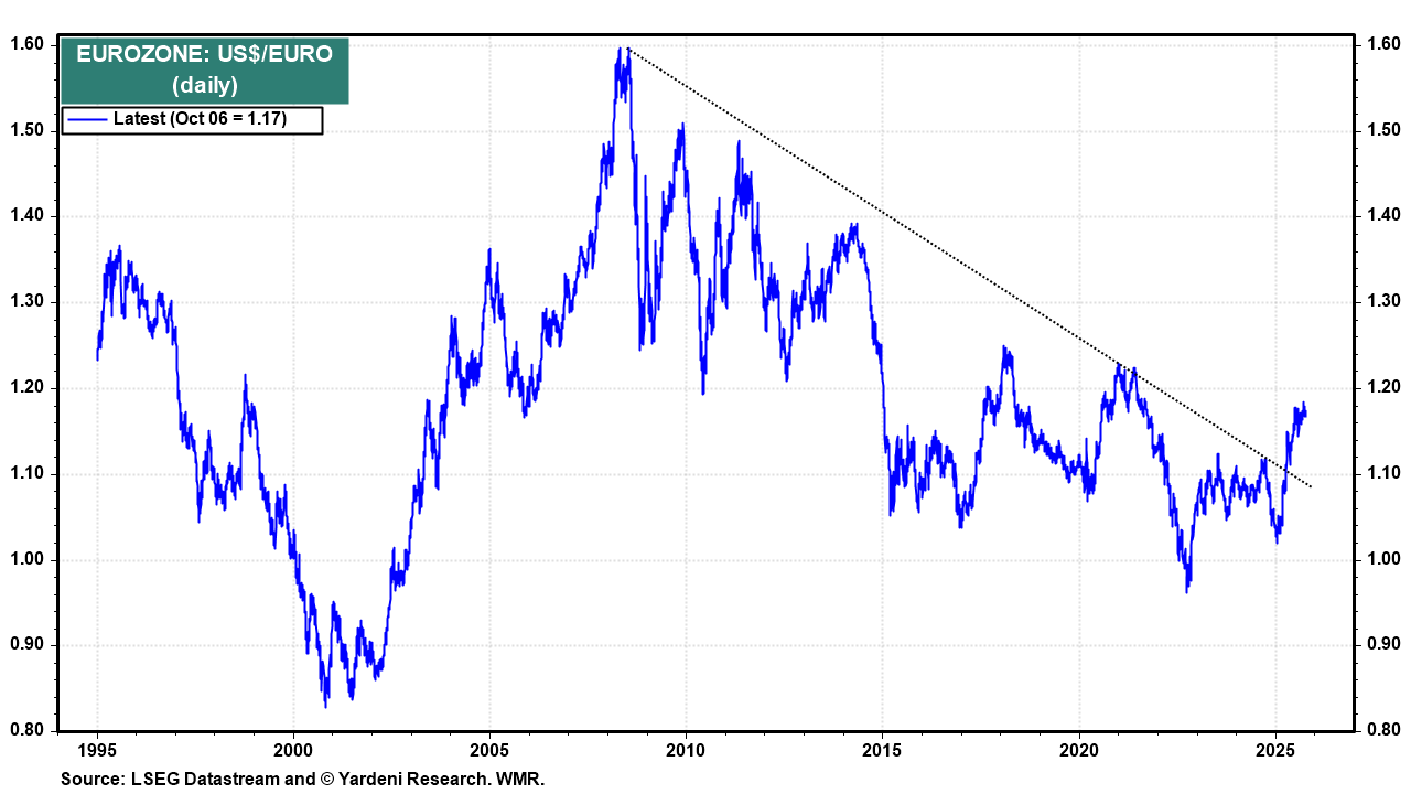 The DXY is a fixed-weight index that is weighted as follows: euro (57.6%), Japanese yen (13.6), British pound (11.9), Canadian dollar (9.1), Swedish krona (4.2), and Swiss franc (3.6). In other words, it is heavily biased toward the euro, which has been strong this year (Fig. 14). The Fed’s trade-weighted dollar index as well as the index used by MSCI are both down less than DXY ytd (Fig. 15). The durability of the euro’s strength seems fleeting to us given the fiscal crisis in France and the manufacturing crisis in Germany (Fig. 16).