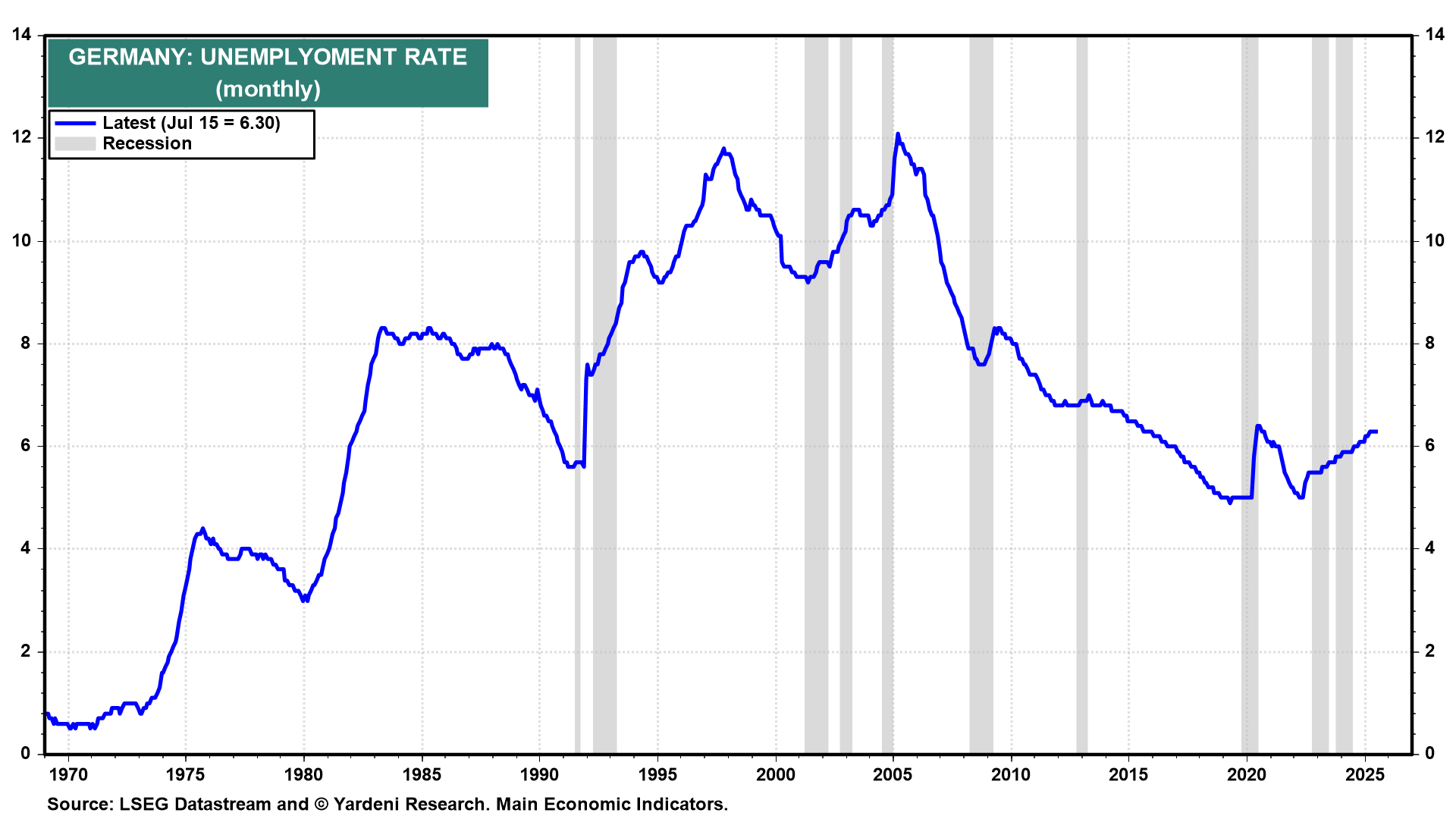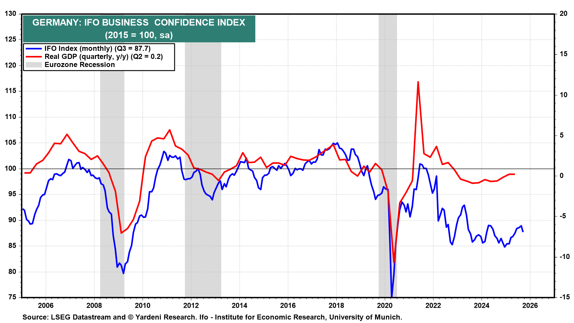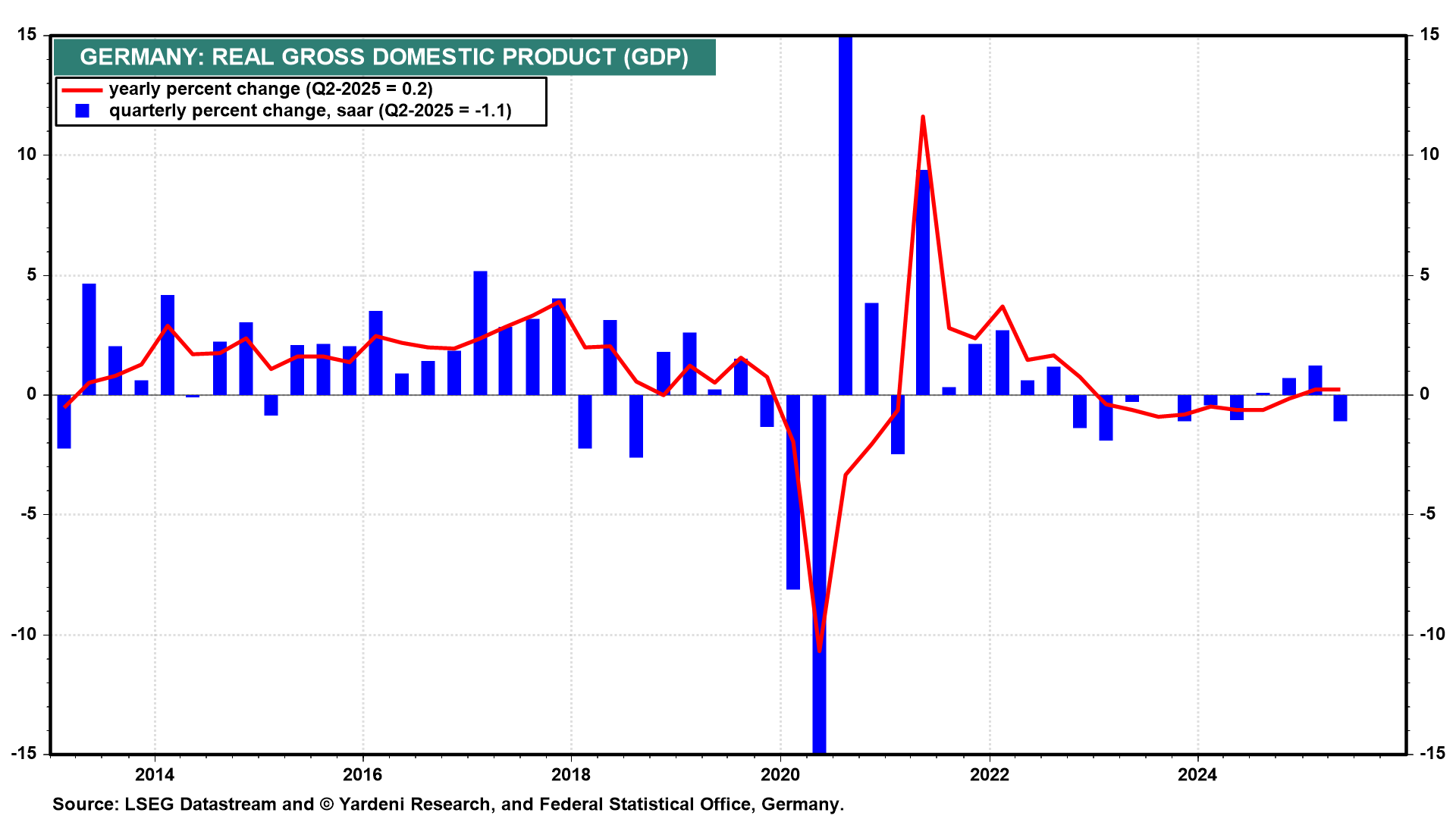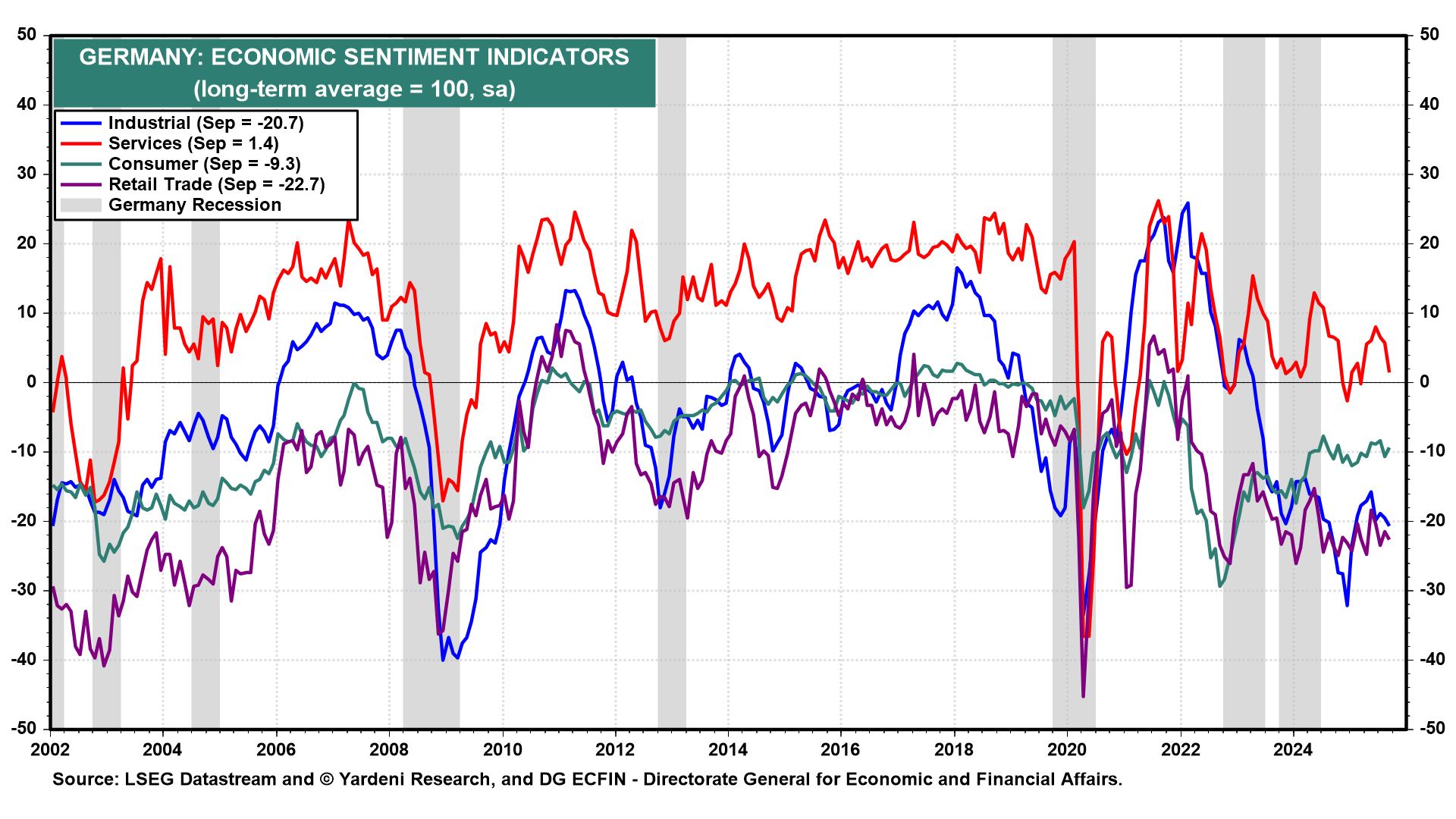 The DXY is a fixed-weight index that is weighted as follows: euro (57.6%), Japanese yen (13.6), British pound (11.9), Canadian dollar (9.1), Swedish krona (4.2), and Swiss franc (3.6). In other words, it is heavily biased toward the euro, which has been strong this year (Fig. 14). The Fed’s trade-weighted dollar index as well as the index used by MSCI are both down less than DXY ytd (Fig. 15). The durability of the euro’s strength seems fleeting to us given the fiscal crisis in France and the manufacturing crisis in Germany (Fig. 16).