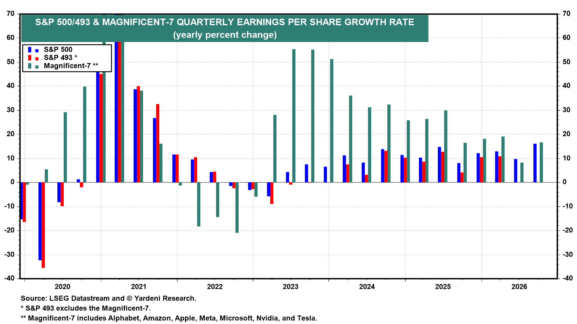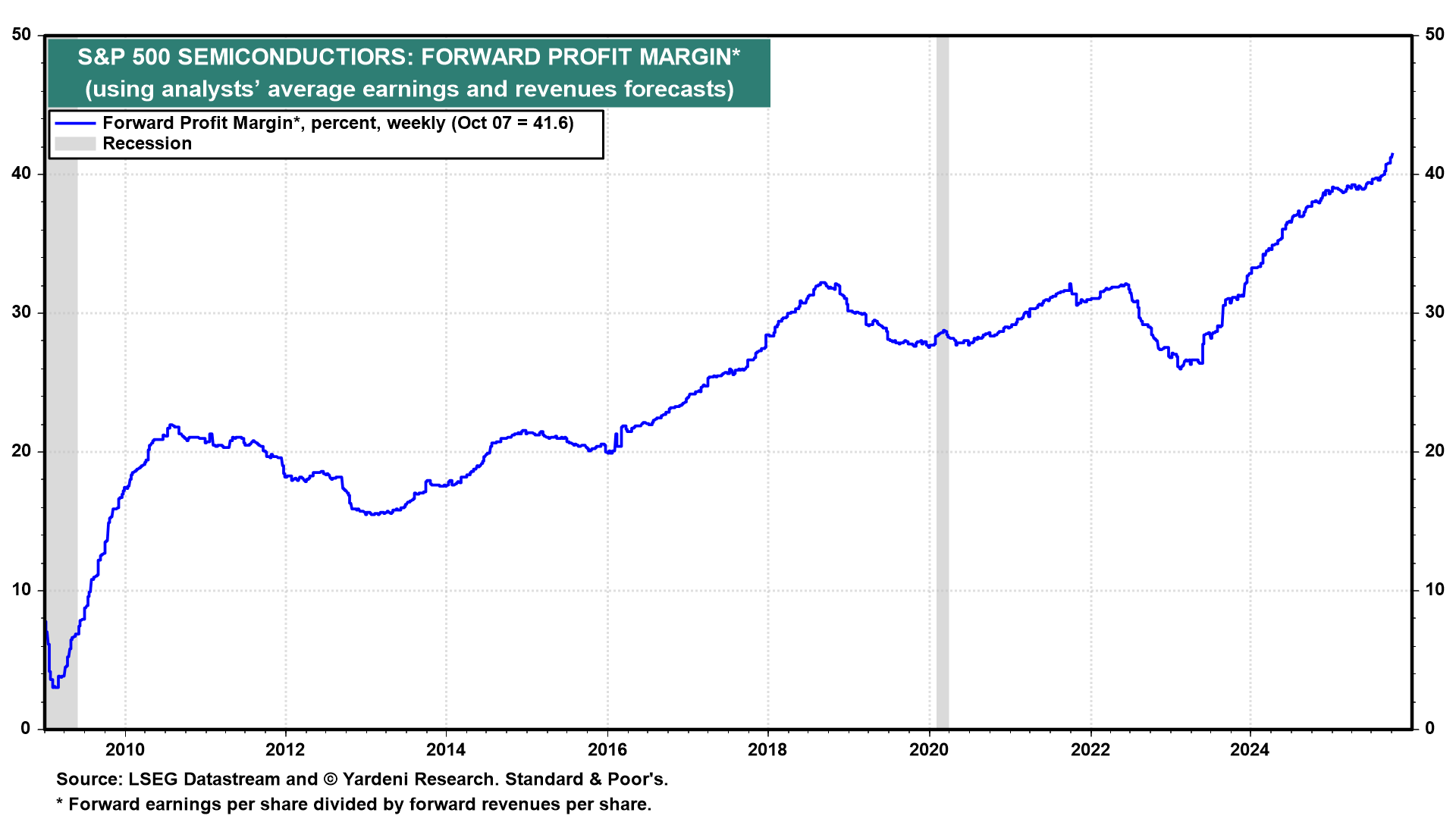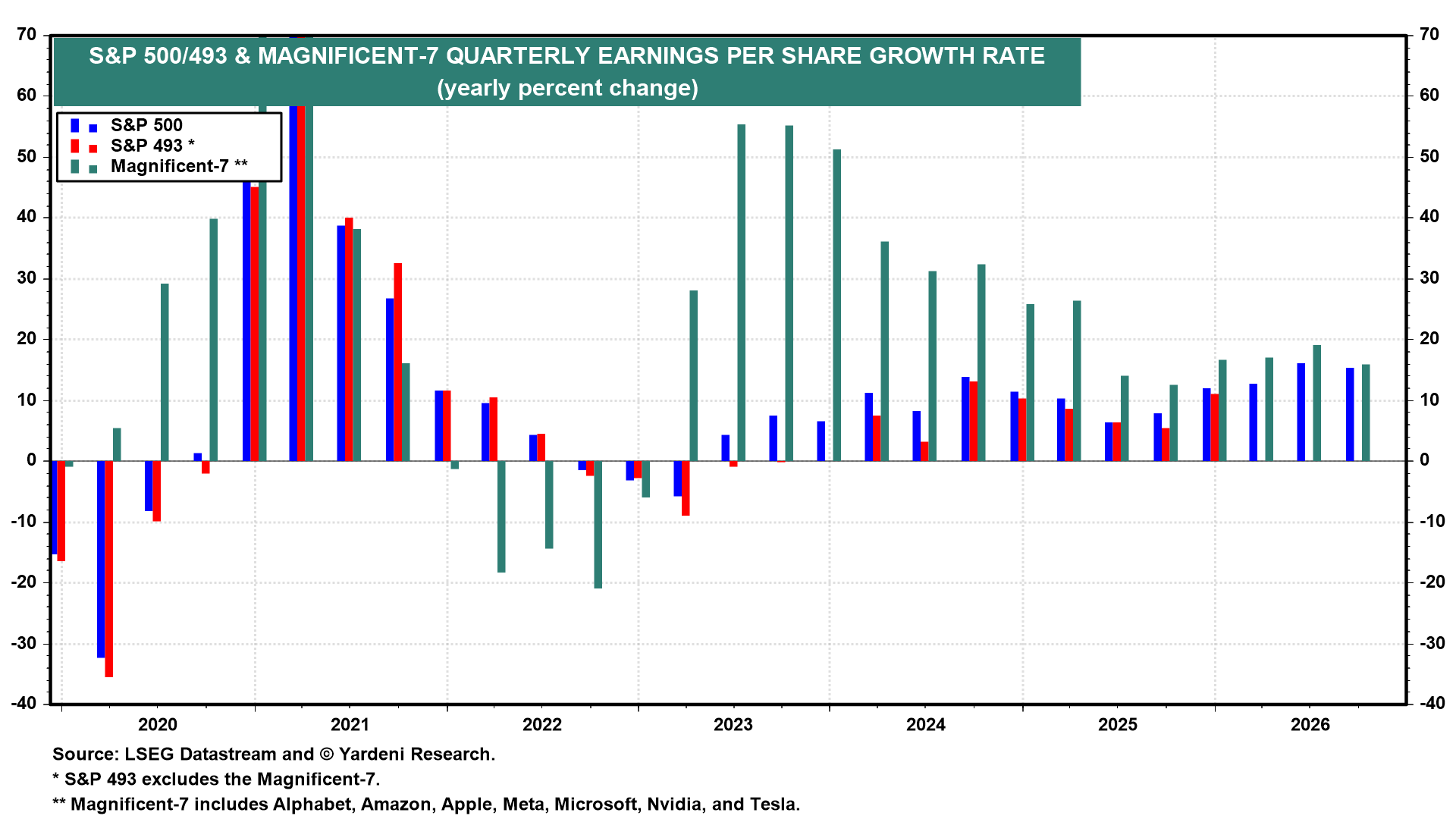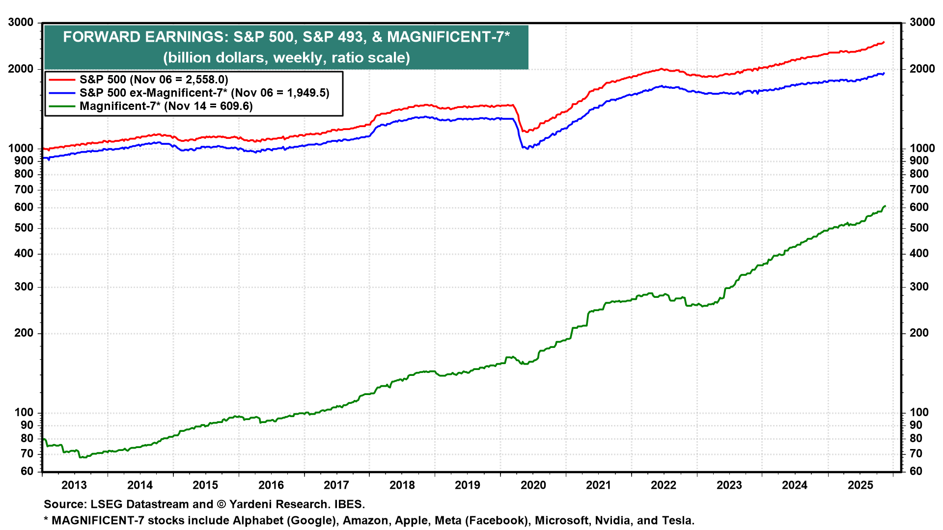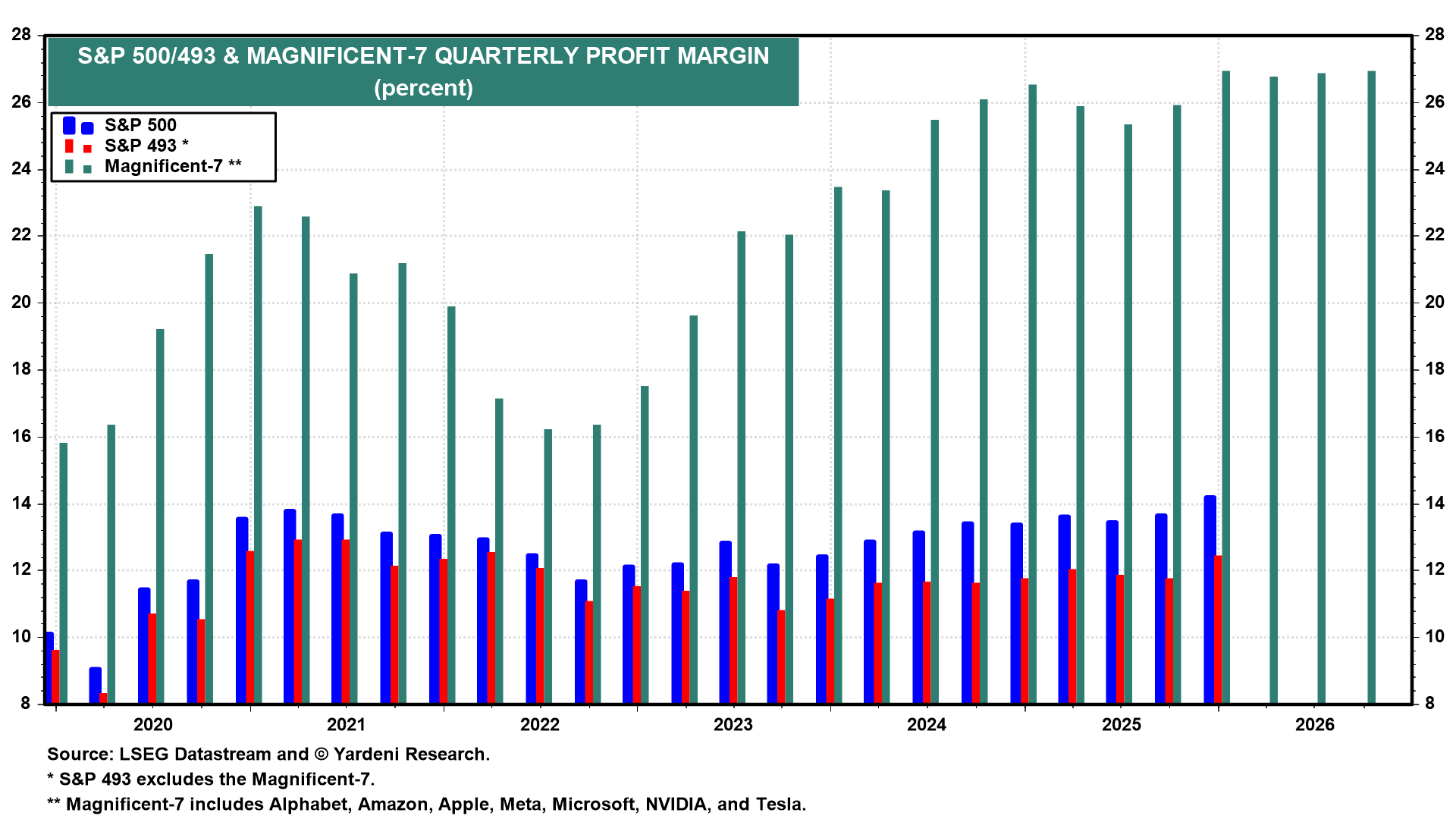 (3) Forward profit margin. The Magnificent-7’s forward profit margin expansion last year was no less than stunning: The margin started the year at a record 21.6% and finished at a new record high of 25.4%.