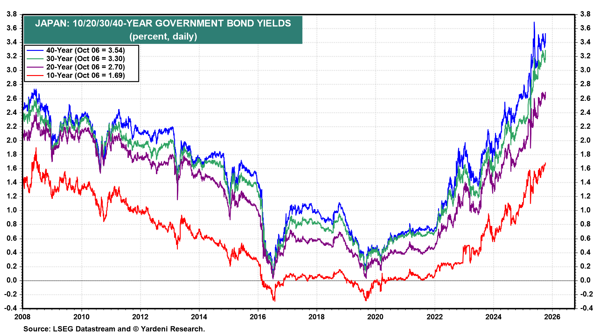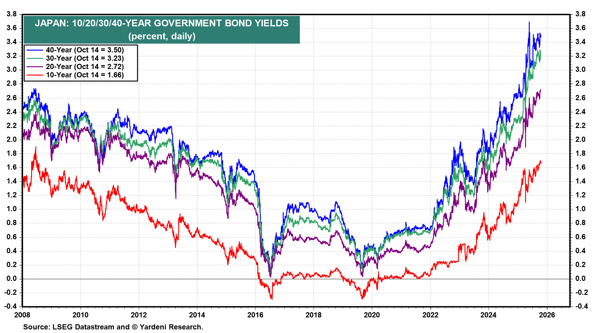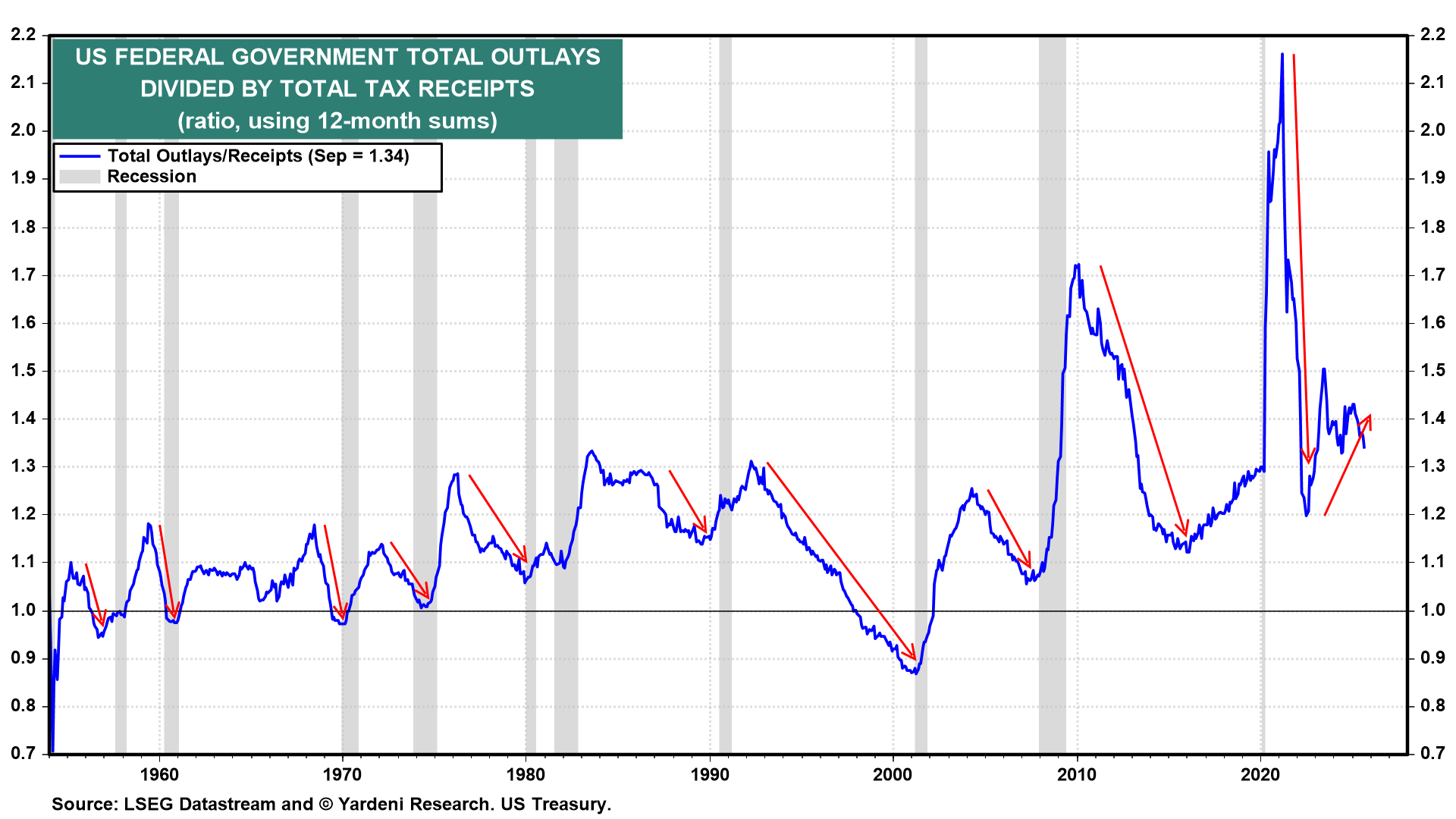 (1) The debt crisis is imminent. Almost since the start of my career on Wall Street in 1978, investors have been warned that government deficits and mounting government debt would cause a crisis. I have several alarmist books from the 1980s with such titles as The Coming Debt Bomb (1980) by James Dale Davidson, Living Beyond Our Means: America’s Debts, the World’s Burden (1986) by Peter G. Peterson, and Day of Reckoning: The Consequences of American Economic Policy Under Reagan and After (1988) by Benjamin Friedman. This year has brought us How Countries Go Broke: The Big Cycle (2025) by Ray Dalio.
