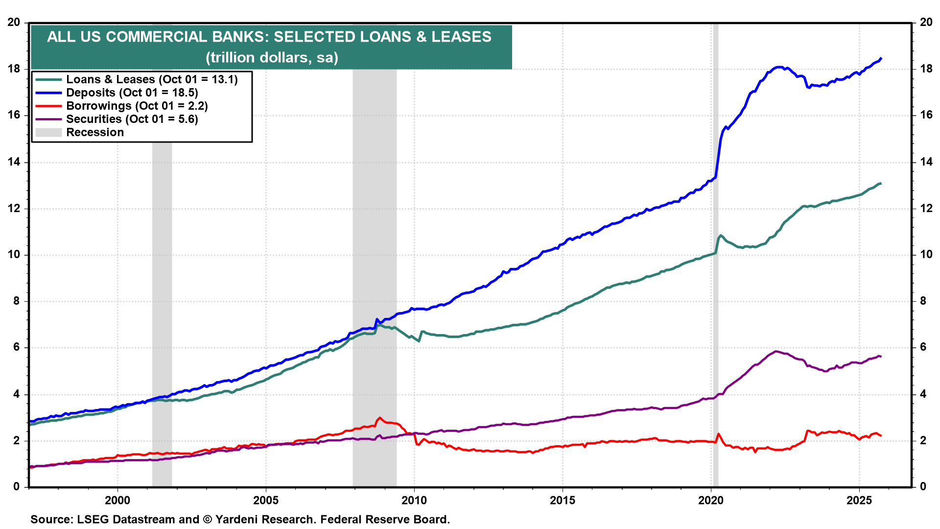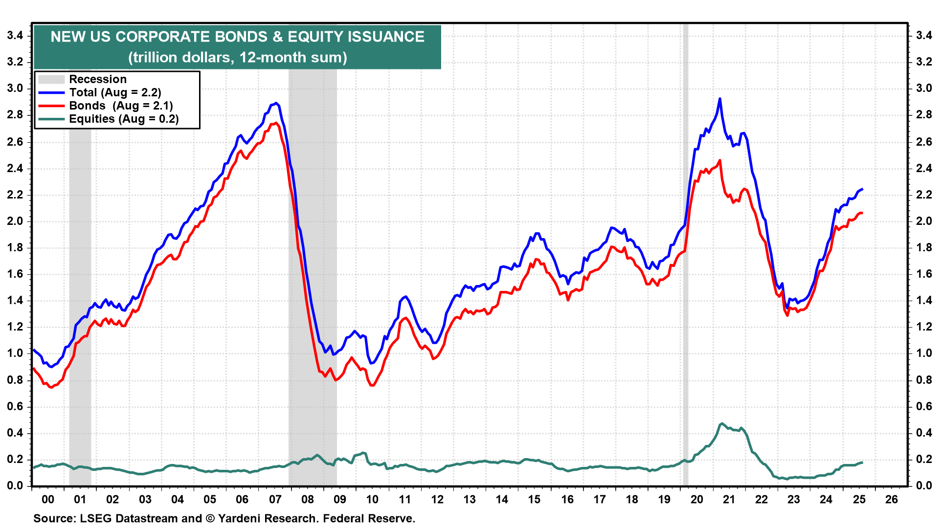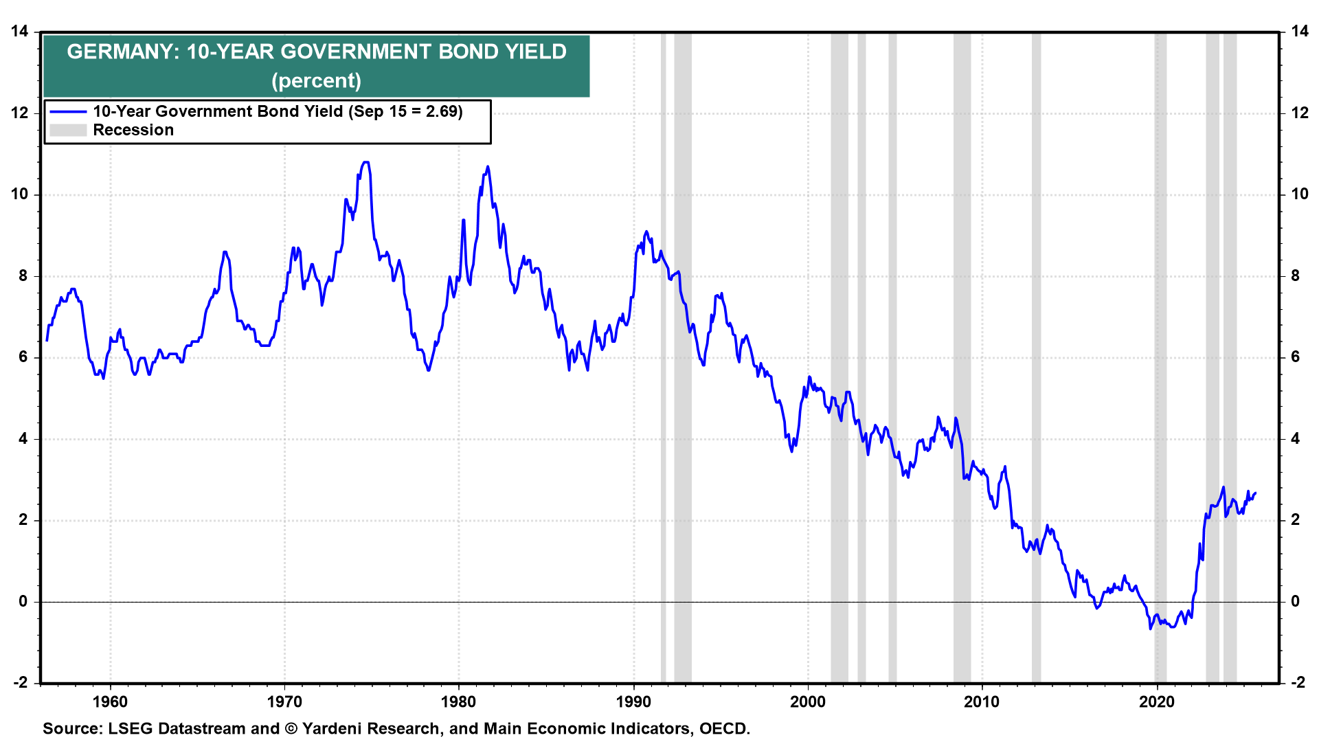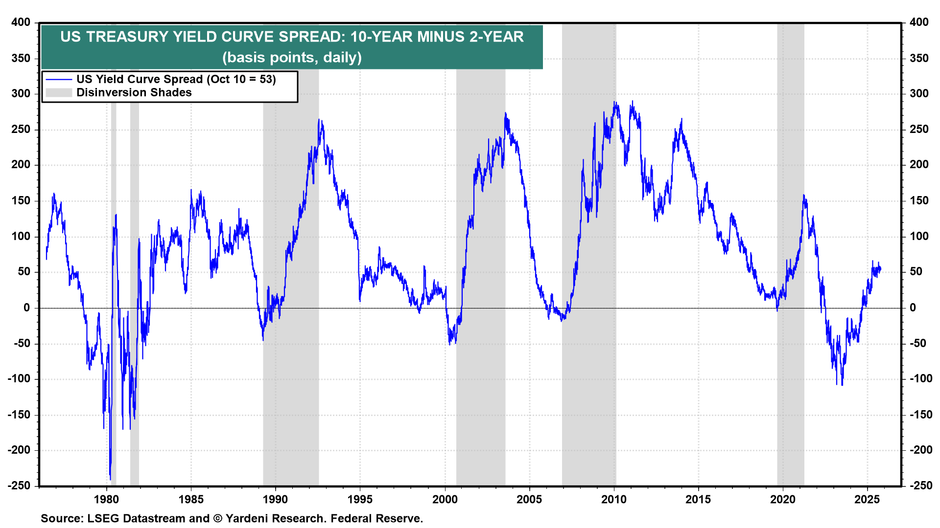 (1) The debt crisis is imminent. Almost since the start of my career on Wall Street in 1978, investors have been warned that government deficits and mounting government debt would cause a crisis. I have several alarmist books from the 1980s with such titles as The Coming Debt Bomb (1980) by James Dale Davidson, Living Beyond Our Means: America’s Debts, the World’s Burden (1986) by Peter G. Peterson, and Day of Reckoning: The Consequences of American Economic Policy Under Reagan and After (1988) by Benjamin Friedman. This year has brought us How Countries Go Broke: The Big Cycle (2025) by Ray Dalio.