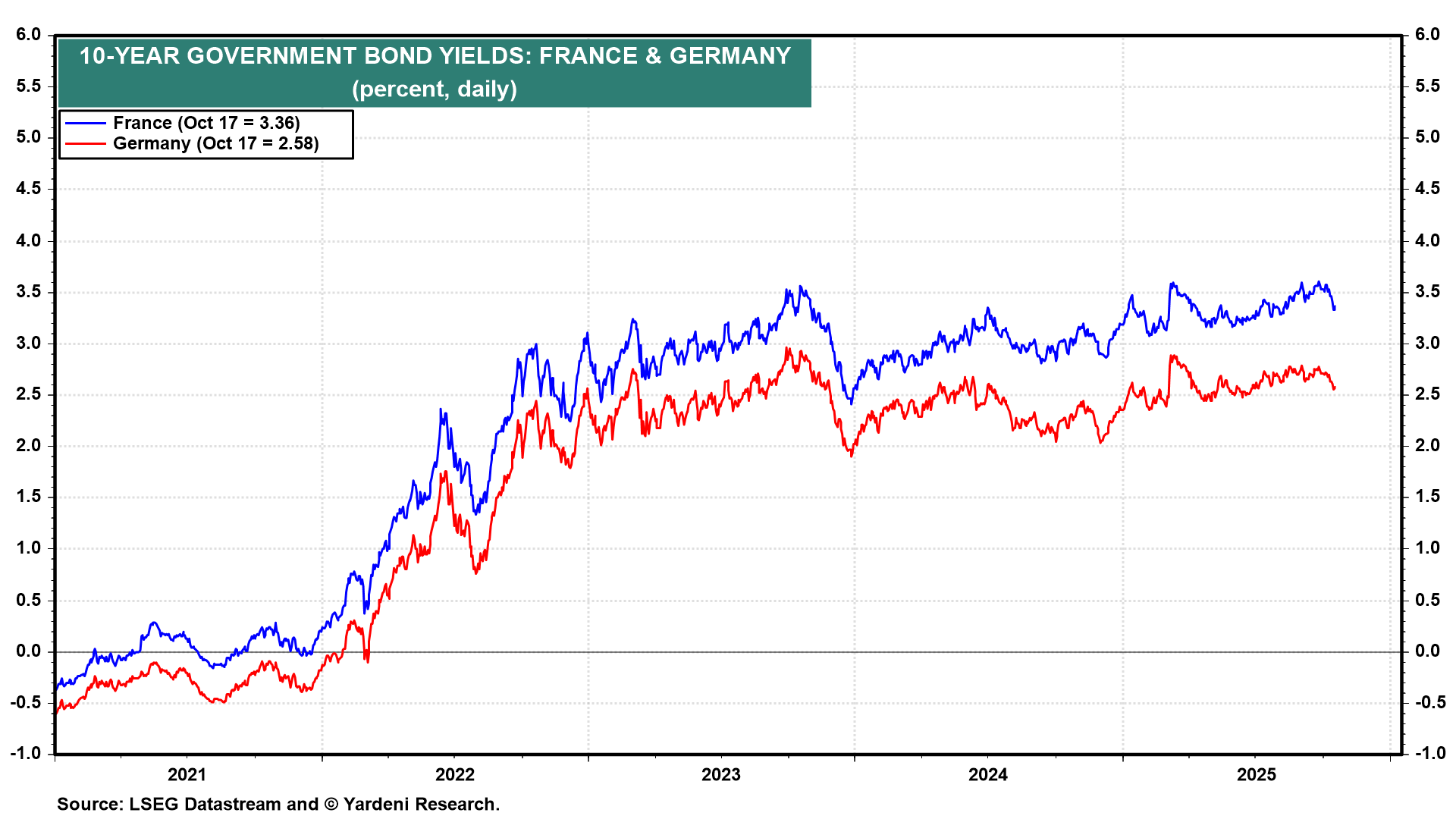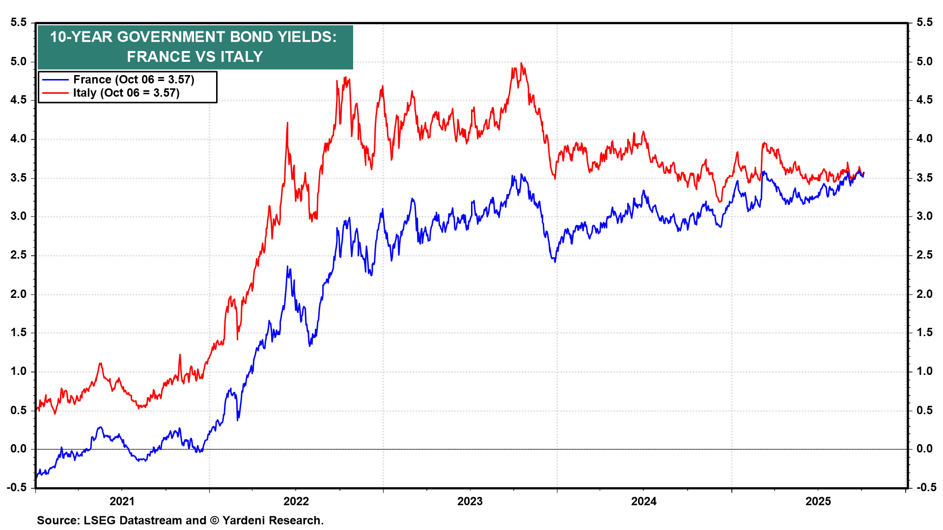So far, Dalio’s concerns about too much government debt seem to be playing out currently in France, Japan, and the UK. Their government bond yields have been rising rapidly recently in response to fiscal excesses in those countries (Fig. 4 and Fig. 5). Last week, government yields fell in France and the UK, as well as the US, as investors became concerned about credit-default risks in the capital markets (Fig. 6).