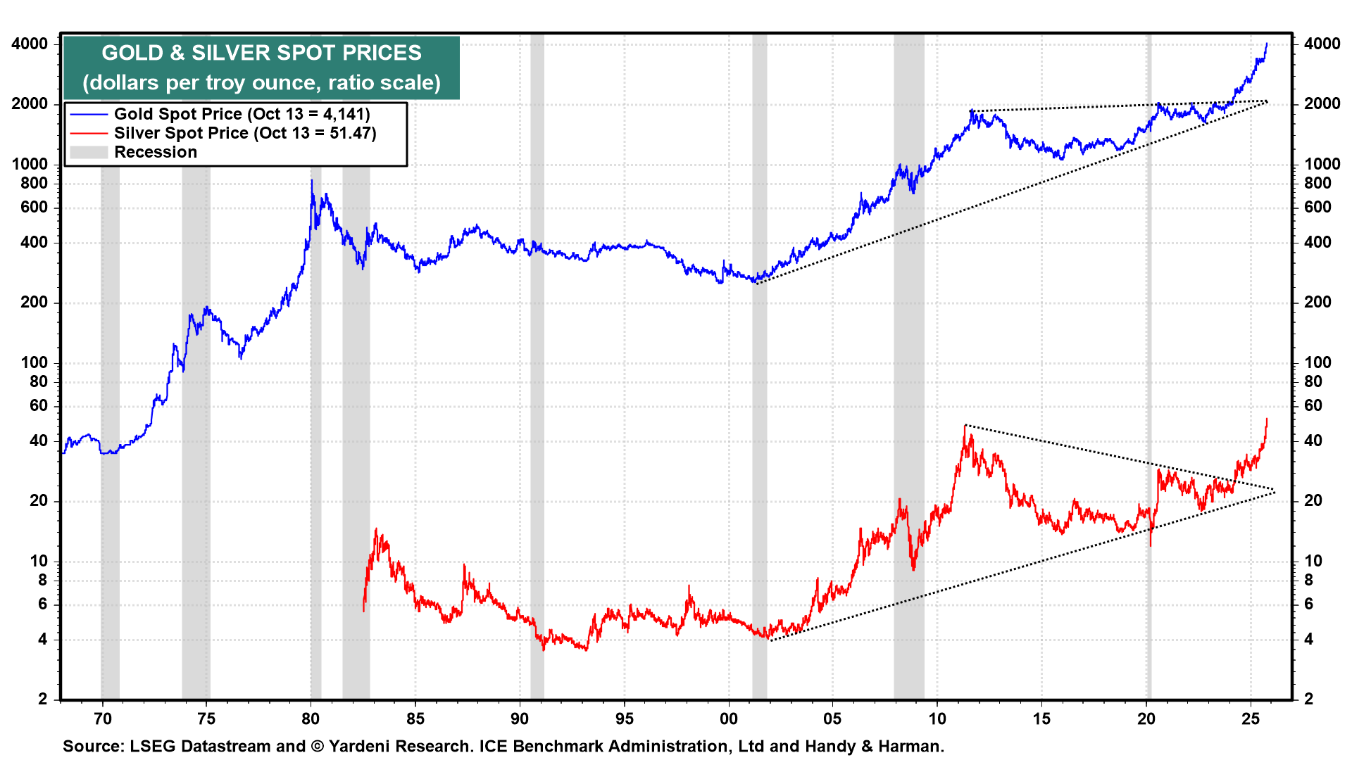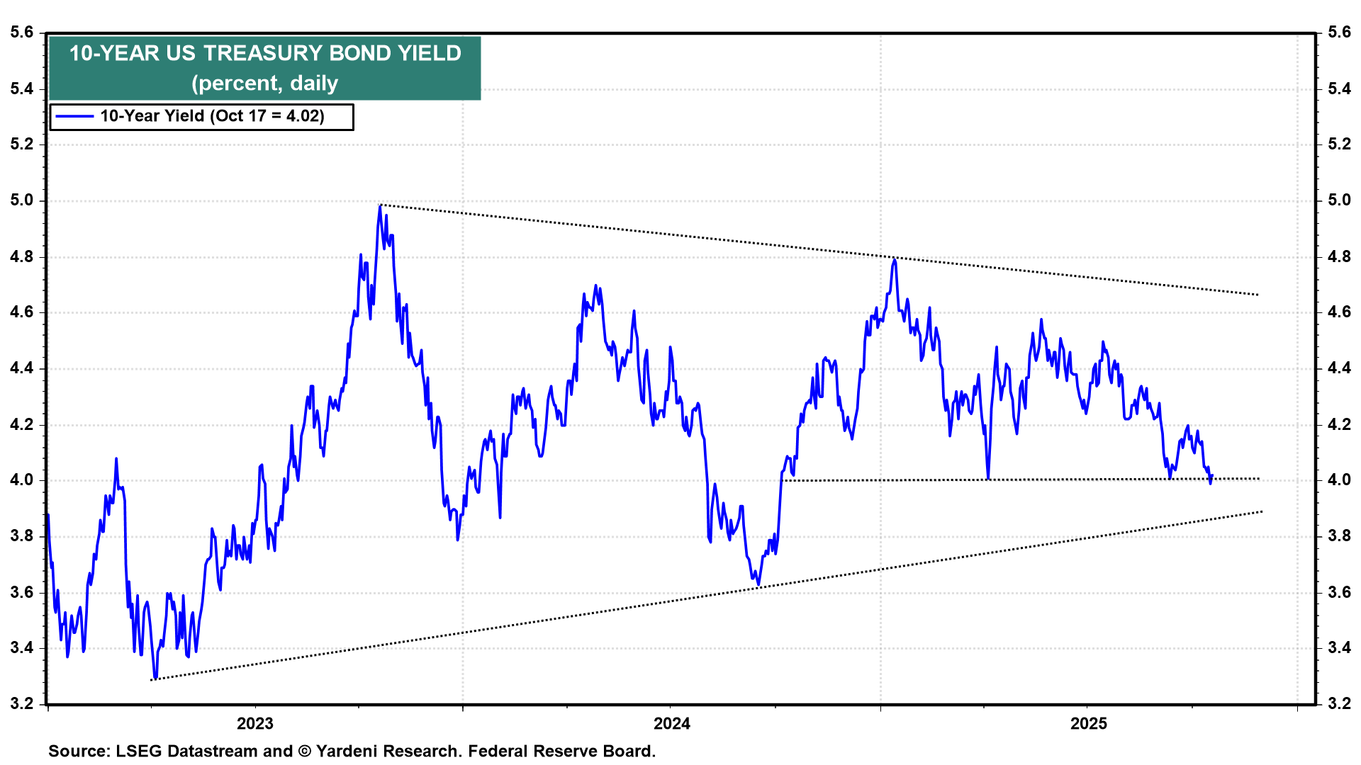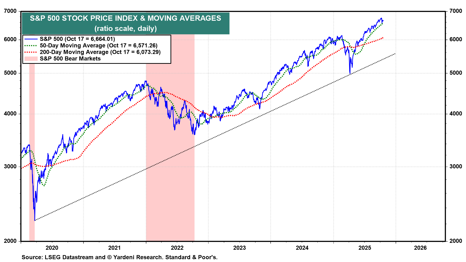 Halloween I: Panic Attacks. Time flies when we are having fun. This year has been loads of fun in the stock market if you enjoy rollercoaster rides. It has been mostly a joy ride since the pandemic started. Since then, there have been four significant (higher) lows in the S&P 500: 2237 (March 23, 2020), 3577 (October 12, 2022), 4117 (October 27, 2023), and 4982 (April 8, 2025) (Fig. 1). Yet here we are at 6664.01 on Friday, up 197% since the 2020 pandemic low. Happily, we called each of those four lows because we believed in the resilience of the economy as well as in our Roaring 2020s thesis: