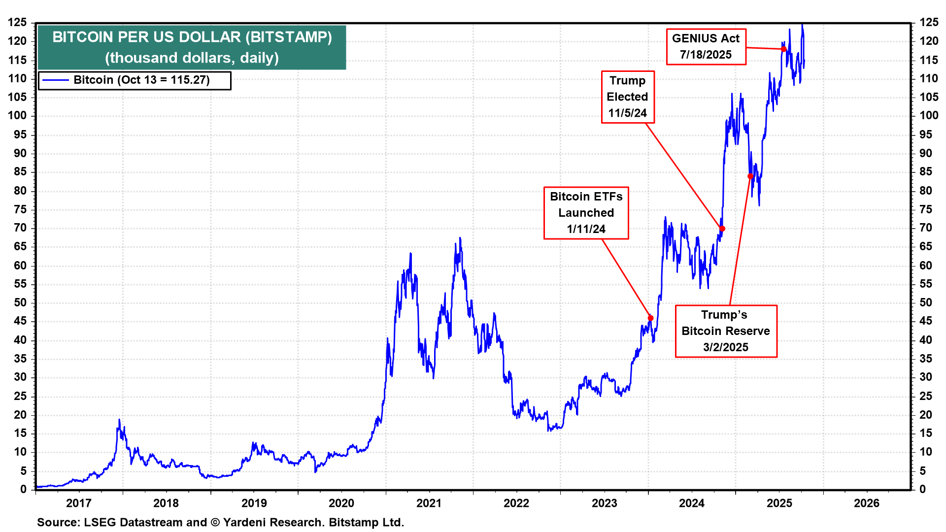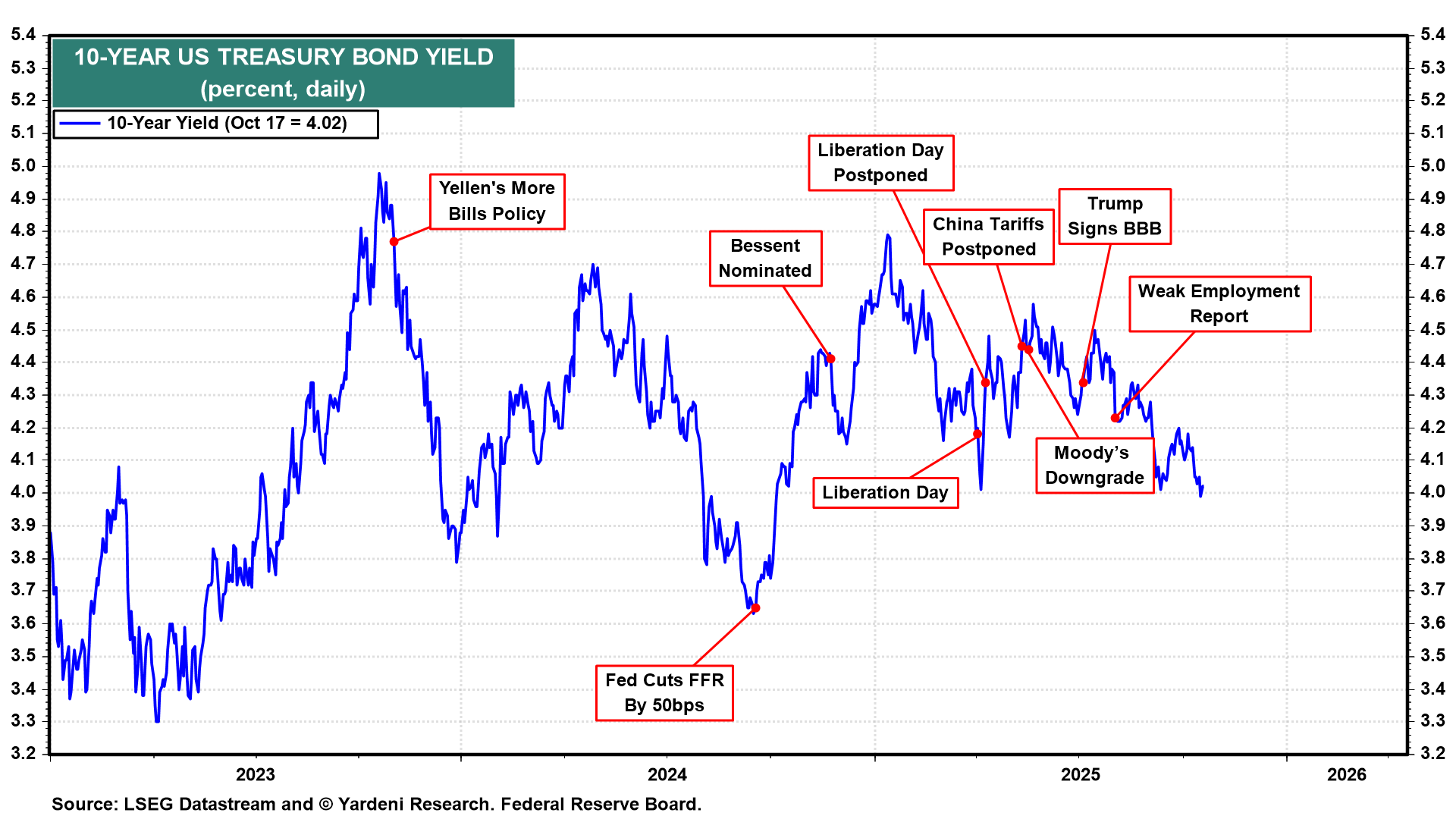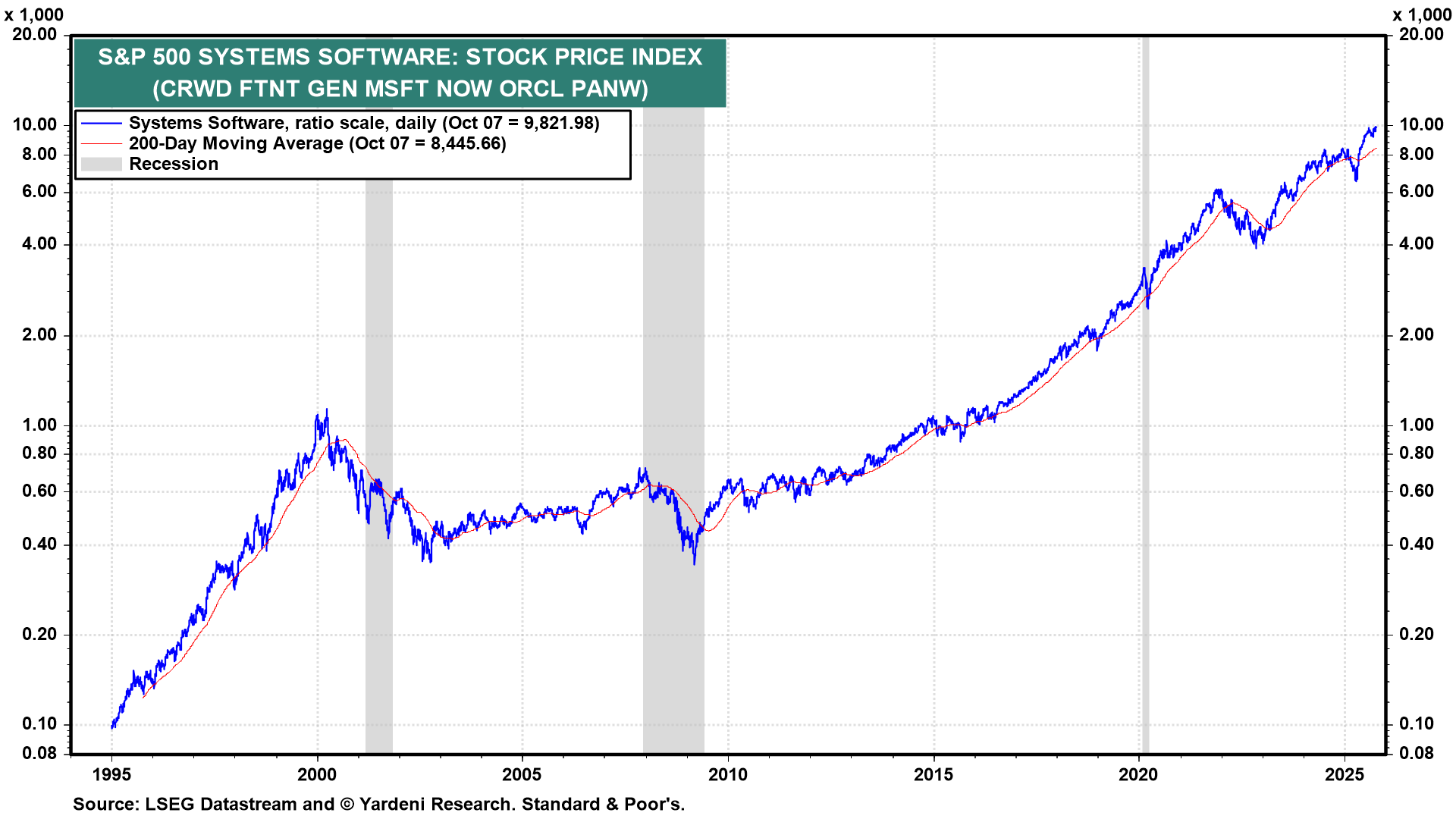 Halloween I: Panic Attacks. Time flies when we are having fun. This year has been loads of fun in the stock market if you enjoy rollercoaster rides. It has been mostly a joy ride since the pandemic started. Since then, there have been four significant (higher) lows in the S&P 500: 2237 (March 23, 2020), 3577 (October 12, 2022), 4117 (October 27, 2023), and 4982 (April 8, 2025) (Fig. 1). Yet here we are at 6664.01 on Friday, up 197% since the 2020 pandemic low. Happily, we called each of those four lows because we believed in the resilience of the economy as well as in our Roaring 2020s thesis: