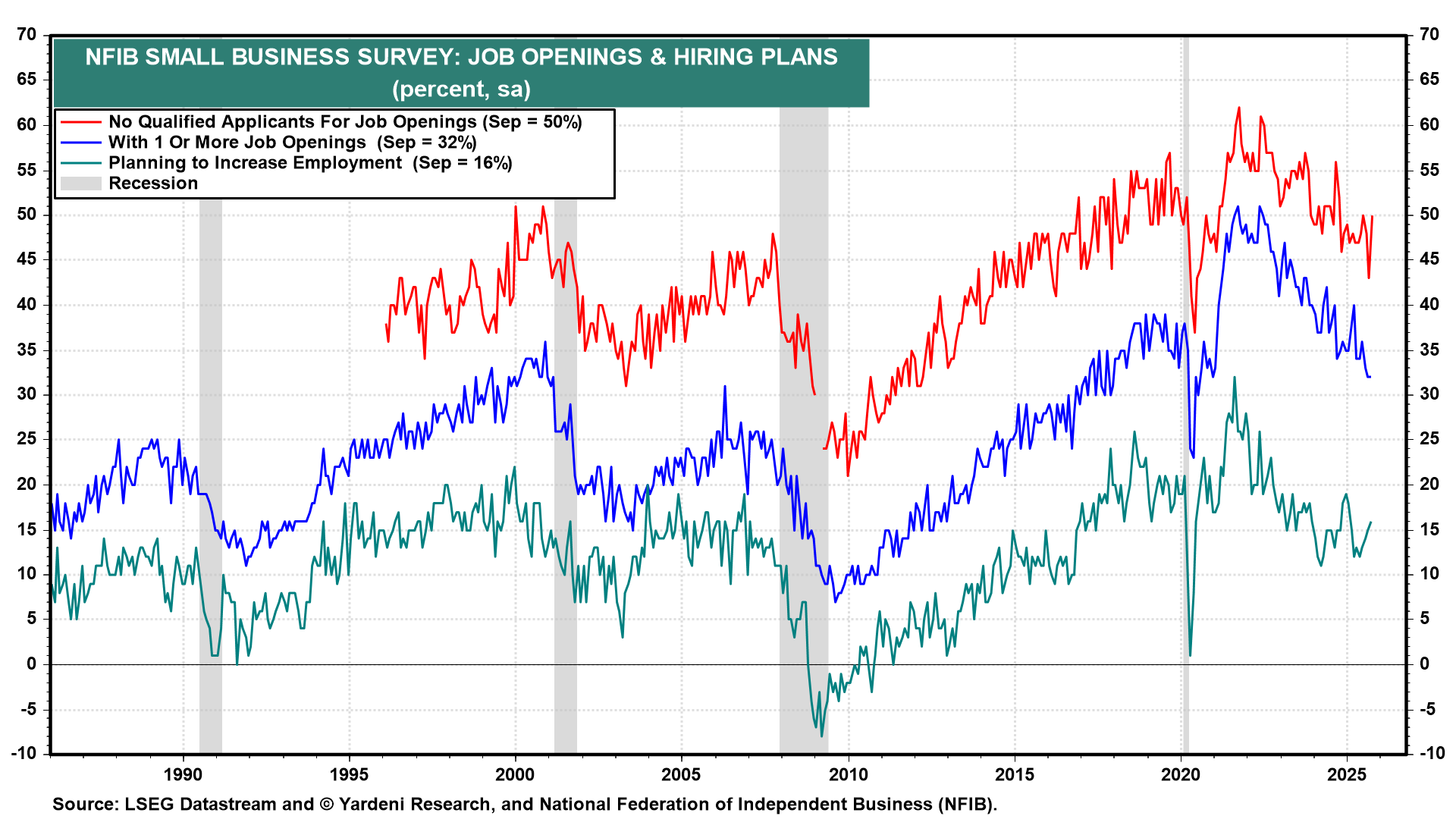 (1) Labor's warning label. Powell observed that the labor market has become “less dynamic and somewhat softer,” noting that “downside risks to employment appear to have risen.” Payroll gains, he said, have slowed sharply, though the government shutdown has delayed data that normally guides the FOMC. Powell emphasized that the job market shows low hiring and low separations, evidence of cooling without collapse (Fig. 4 and Fig. 5).