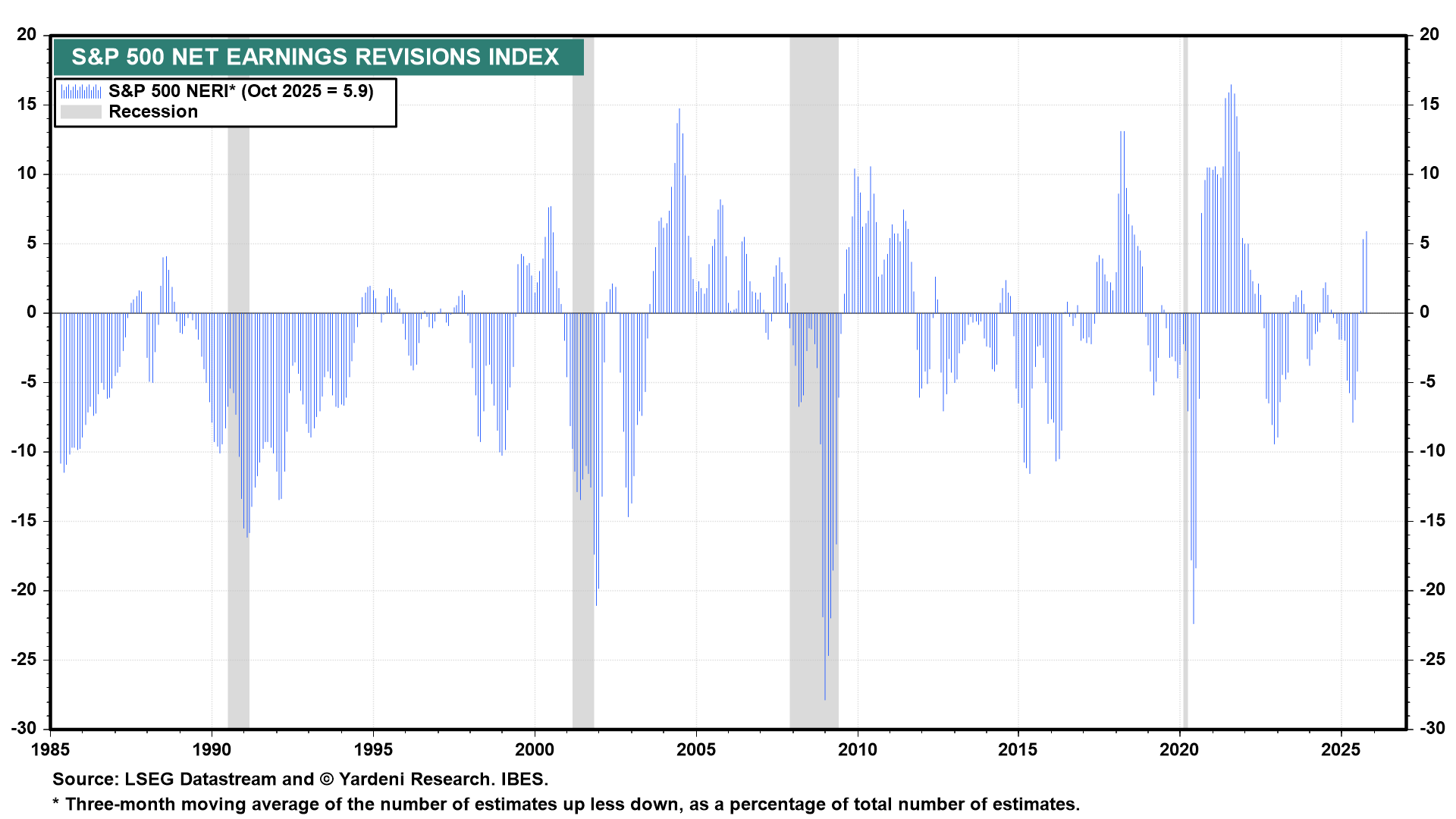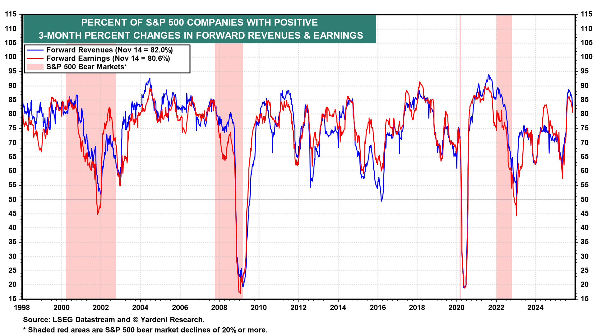 That’s why Joe recently created a breadth database covering the S&P’s three market-cap indexes. It tracks each company’s forward revenues, earnings, and profit margin, as well as their price and valuation. We like to track an index’s breadth over a 13-week period since it captures the estimate revisions analysts make over the course of a quarterly reporting cycle. Here’s what Joe found:
