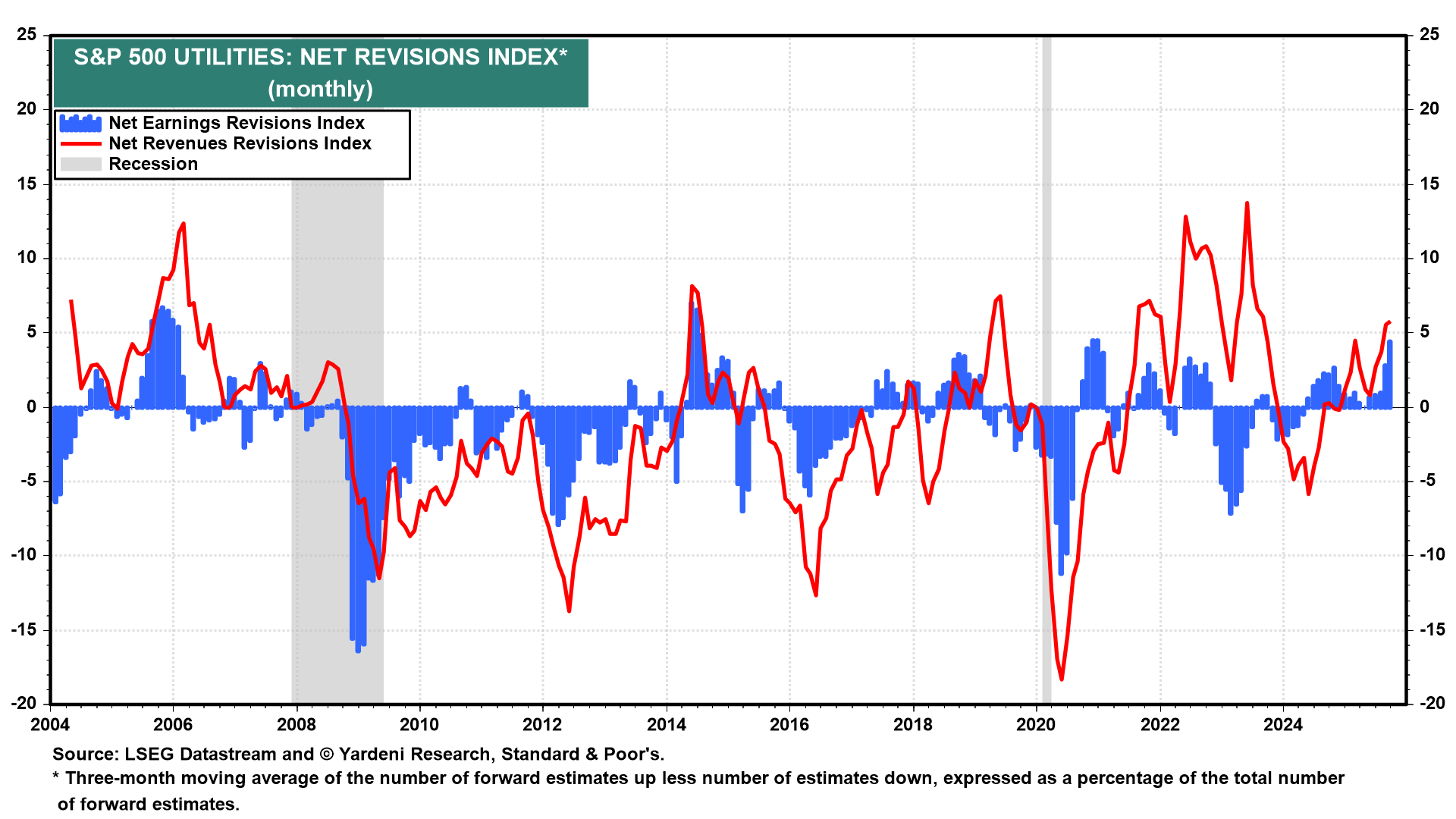 (1) The percentage of companies with rising forward earnings has weakened for the LargeCap and MidCap indexes from their two-year highs in Q3 (Fig. 26). Nearly 74% of the S&P 500 LargeCap companies have higher forward earnings over the past three months, down from 81% recently. That’s well above the current readings for MidCap (53.6%) and SmallCap (50.8). SmallCap’s measure has trailed those of both MidCap and LargeCap over the long term since 1998; but the index has been on a path to broader improvement since late 2023, when it dropped to its lowest non-crisis level since the tech meltdown of 2001.