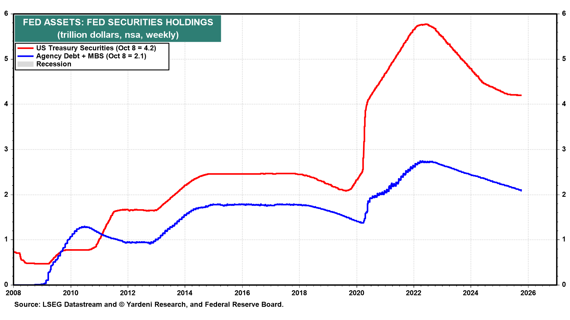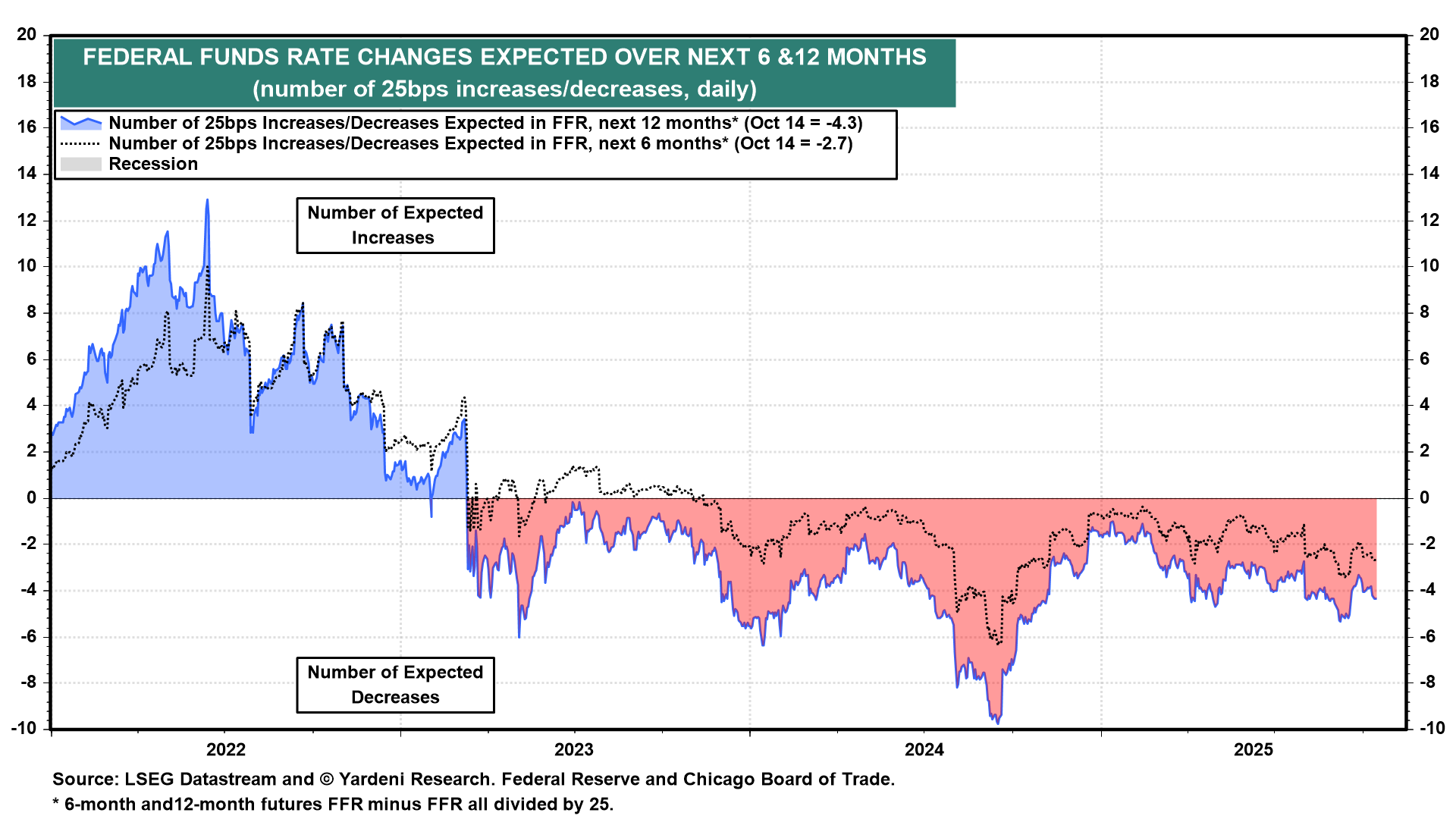 For perspective, the federal funds rate stands at 4.00%–4.25% following September’s quarter-point cut, while the Fed’s balance sheet holds about $6.3 trillion in securities—about 30% below its 2022 peak (Fig. 1 and Fig. 2). The financial markets are pricing in about two additional cuts over the next six months, consistent with Powell’s speech and the Fed’s rate path forecasts (Fig. 3).