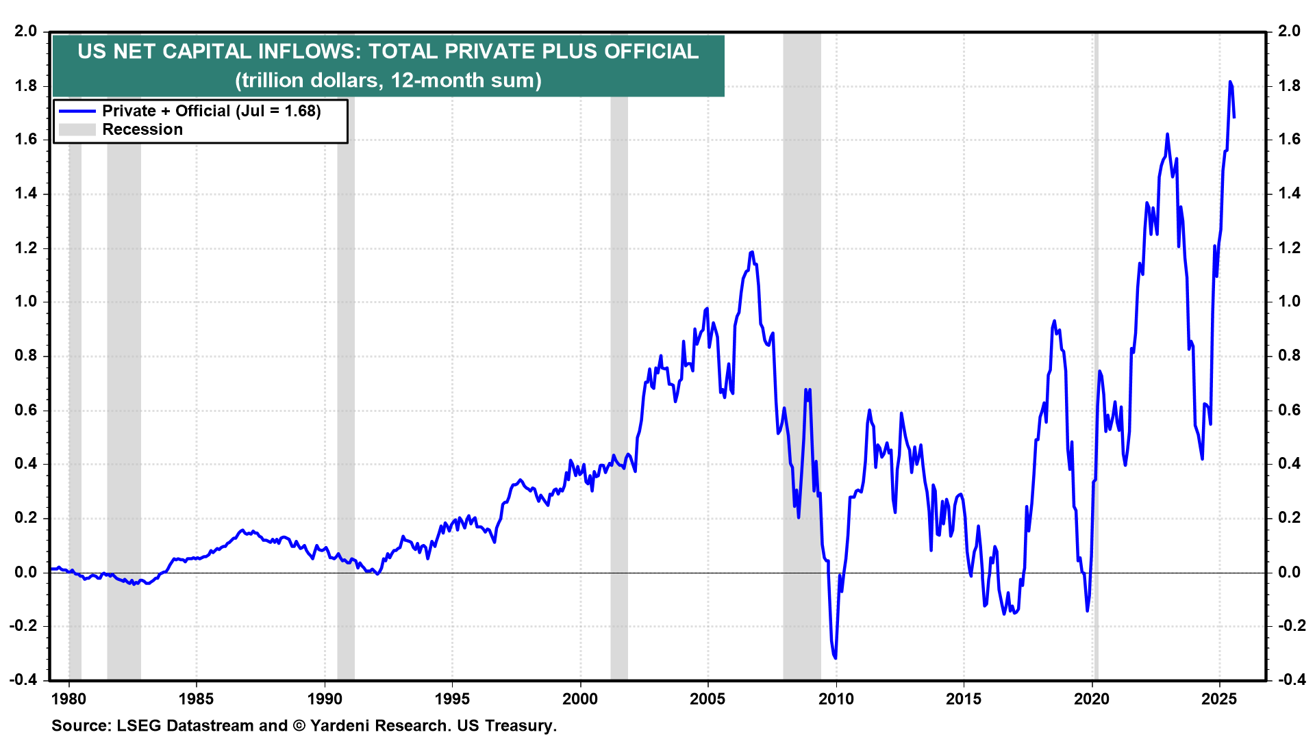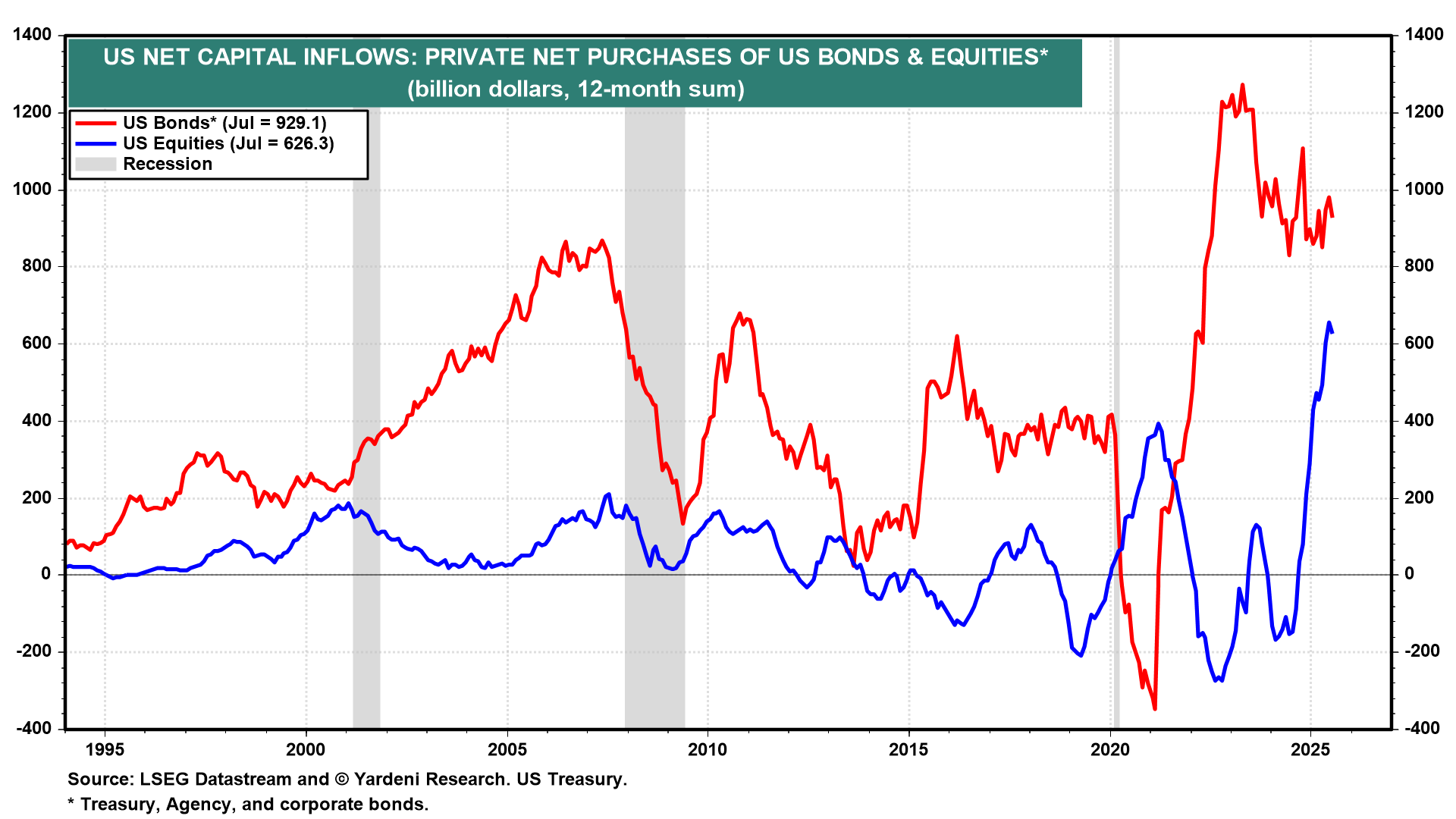 According to this narrative, global investors are bailing out of the US capital markets. This claim isn’t supported by the monthly data compiled by the US Treasury, which show that over the past 12-months through July, US net capital inflows totaled a near-record $1.7 trillion (Fig. 12). Private net capital purchases of US bonds and US stocks totaled $929 billion and $626 billion over this period (Fig. 13).