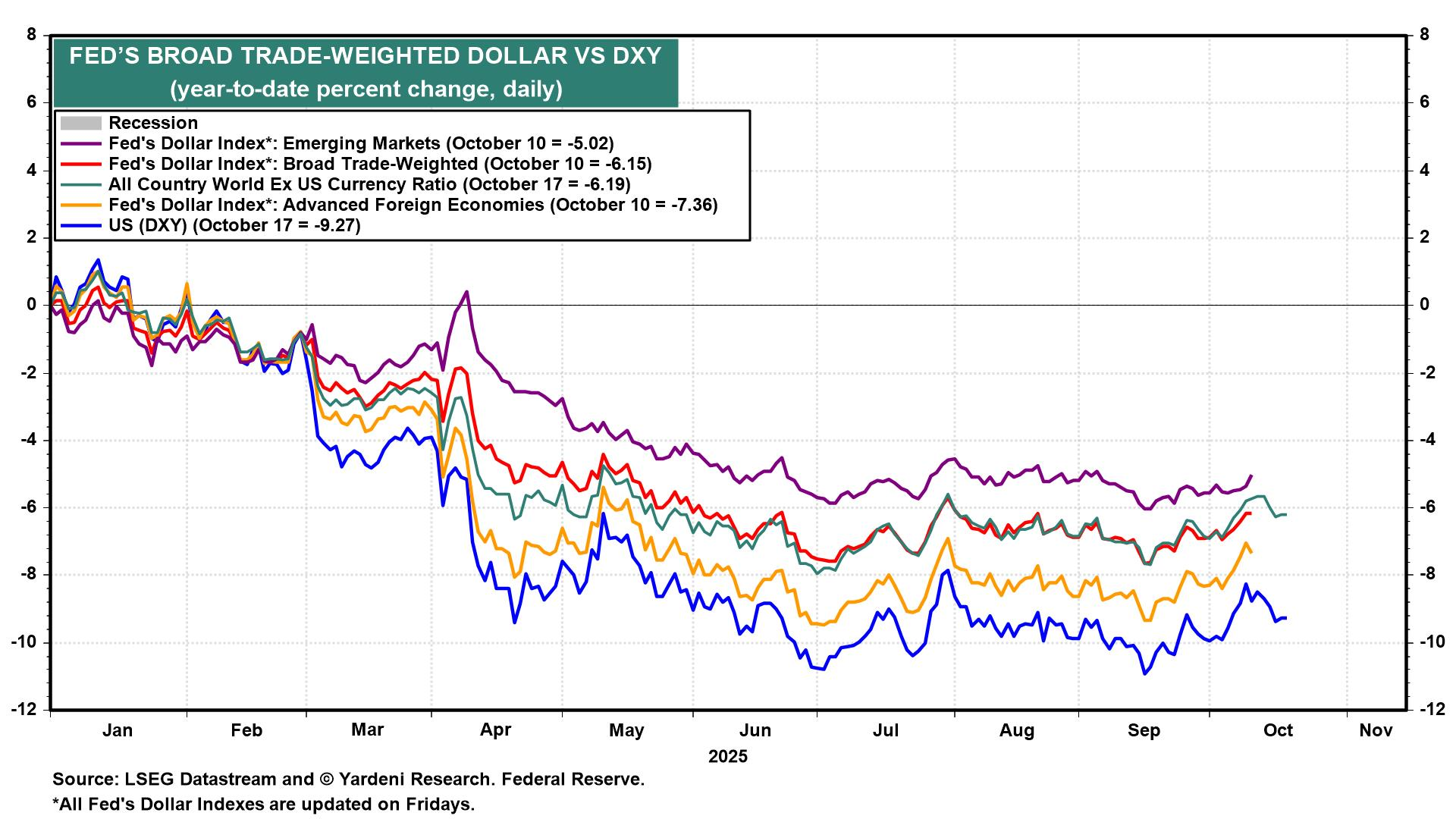 (2) Dollar debasement is underway. Another related doomsday scenario posits that Washington’s fiscal excesses are debasing the dollar, which has been falling this year, according to the DXY dollar index, and is likely to continue to fall (Fig. 11).