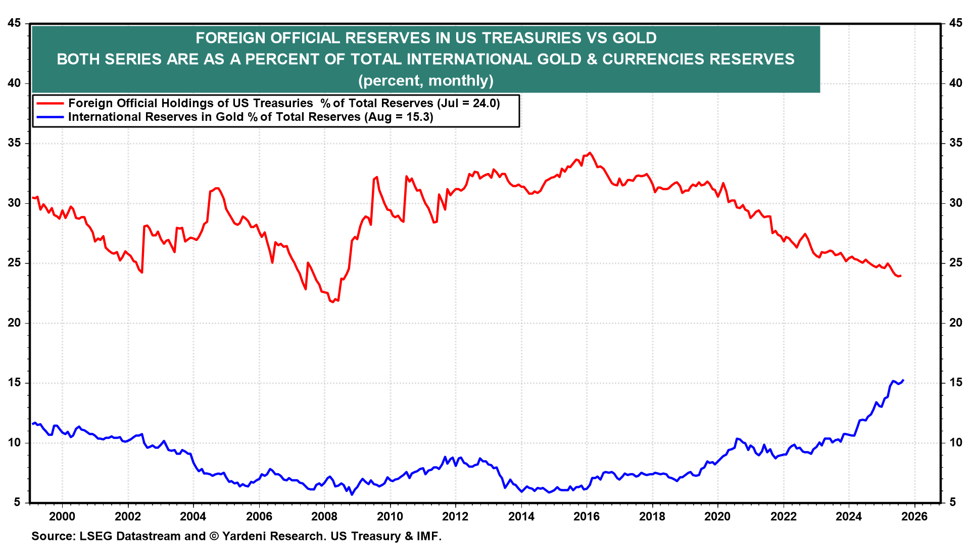 Social media posts have been showing that central banks’ gold reserves now exceed their US Treasury holdings. That’s mostly because of the appreciation of gold. The International Monetary Fund’s data, which include the “national valuation” of gold, show that foreign governments’ total official holdings of US Treasuries currently account for 24.0% of their total reserves, while gold accounts for 15.3%, which is up from about 10% at the end of 2023 (Fig. 17).