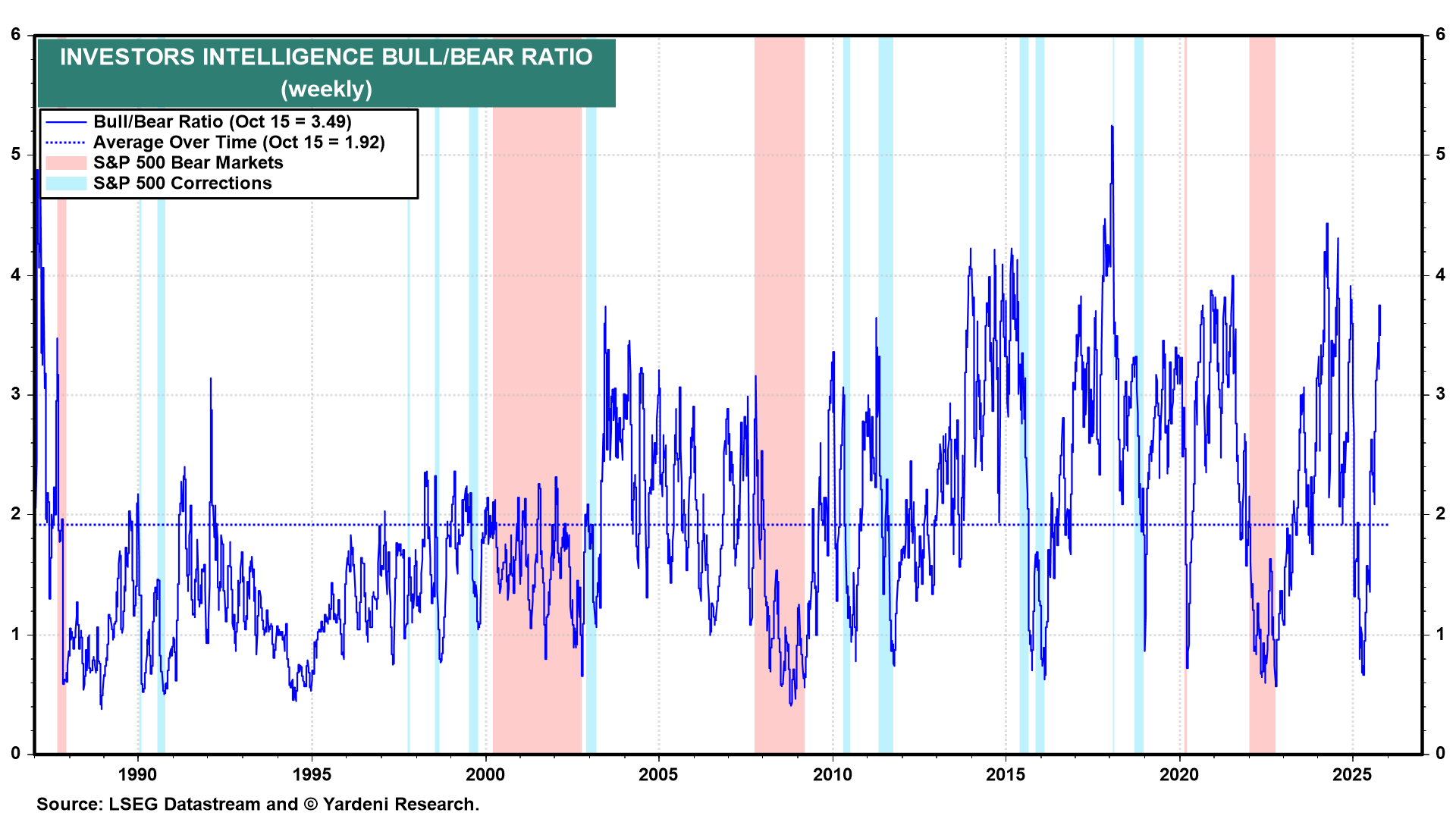 Our faith in the resilience of the US economy helped us to call the bottoms in the stock market noted above. So did a distant family member. We don’t speak very often to one another. But he invariably calls me at market bottoms, saying: “Eddie, it’s been a while since we talked. Eddie, do you think I should get out of the stock market here?” Invariably, his panic attacks coincide with readings of the Investors Intelligence Bull/Bear Ratio below 1.0 (Fig. 3).