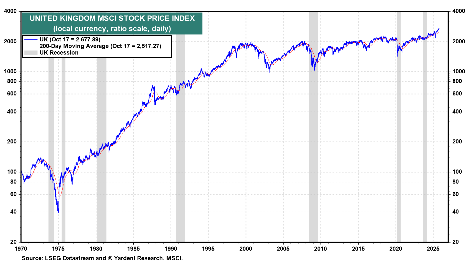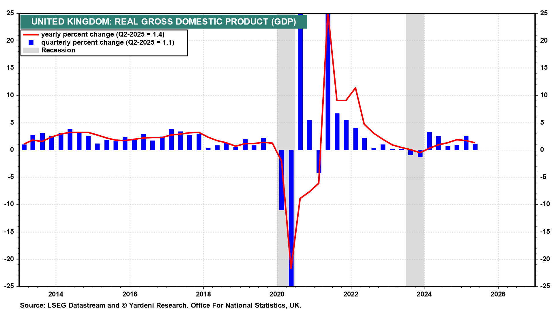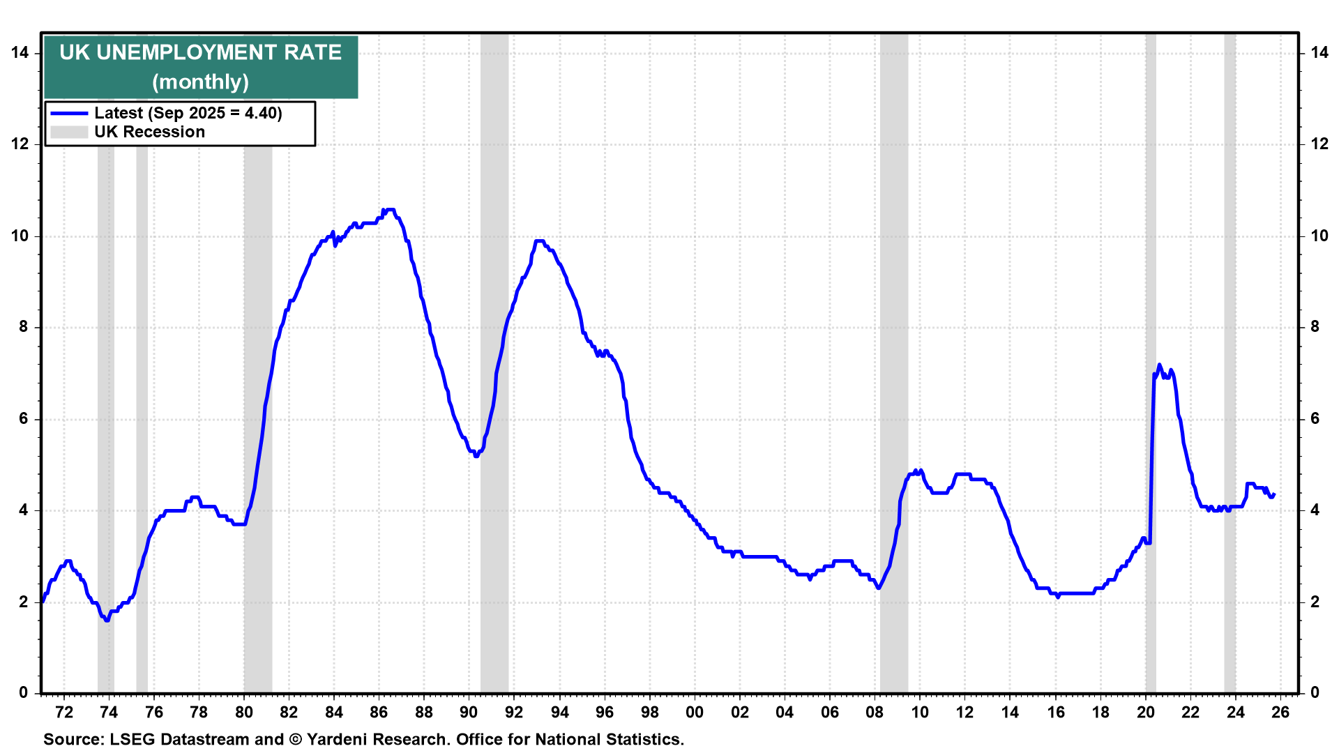 The International Monetary Fund (IMF), for example, predicts the UK will have the highest inflation rate and weakest growth in living standards among the Group of Seven nations this year and next. Domestic demand is weak, fueling recession talk. Real GDP expanded just 1.4% y/y during Q3-2025 (Fig. 2). The jobless rate jumped to 4.8% in the three months through August, the highest since May 2021 amid Covid-19 quarantines. The monthly unemployment rate for September stood at 4.4% y/y (Fig. 3).