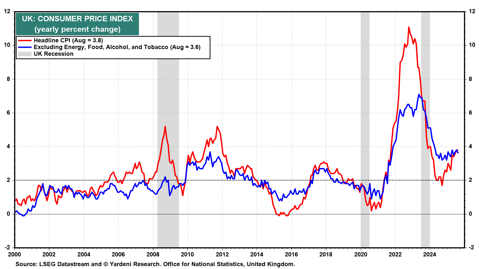 What’s worse, the Bank of England (BOE) “may have braked too hard” to cap post-pandemic inflation and price risks following Russia’s invasion of Ukraine, said central bank policymaker Alan Taylor. Last week, Taylor reiterated his view that the BOE should pick up the pace on rate cuts. The UK headline CPI rose 3.8% during August (Fig. 4).