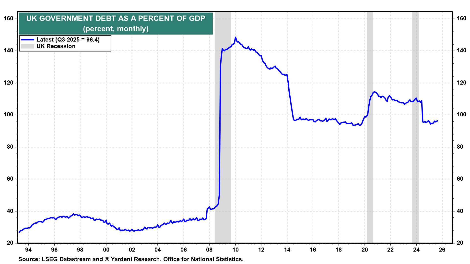 (4) Elevated borrowing costs. Chadh argued that parliament should take steps to get the ratio closer to 90%, pointing to a July report from the Office for Budget Responsibility (OBR). It warned of a “sudden stop” in London’s ability to access the bond market. “Debt,” OBR said, has “continued to rise and borrowing remained elevated because governments have reversed plans to consolidate the public finances. Planned tax rises have been reversed, and, more significantly, planned spending reductions have been abandoned.”