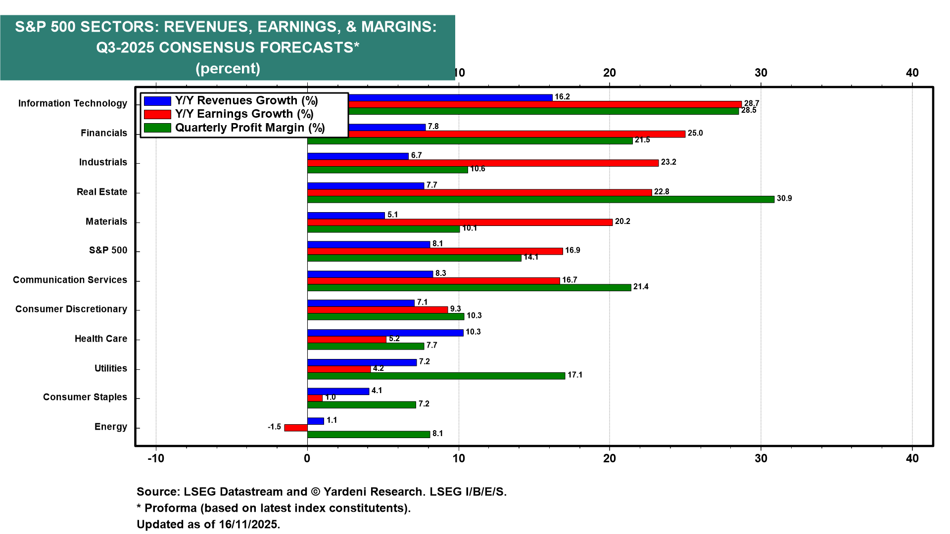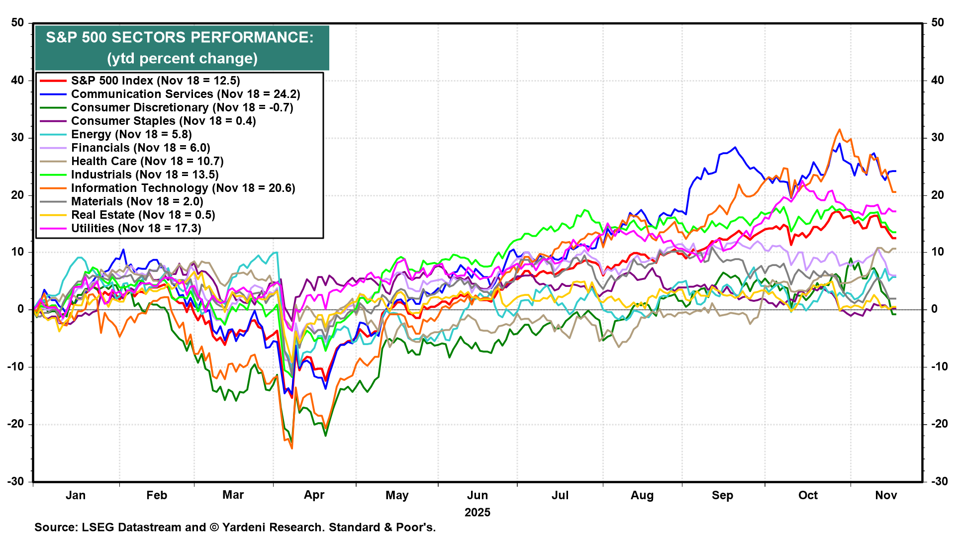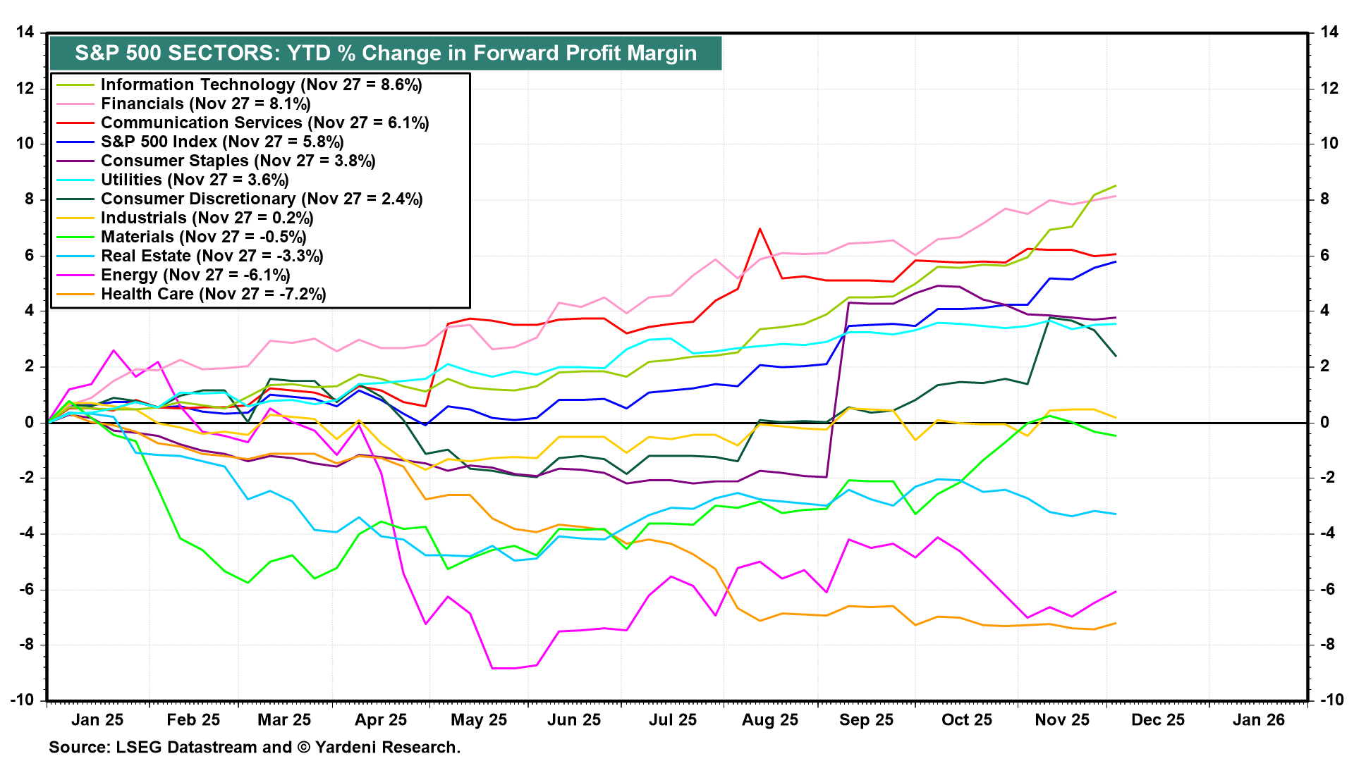 The S&P 500’s forward earnings has risen 11.9% ytd—well above its usual 8.0%-9.0% by early December—powered by three sectors: Information Technology (26.8%), Communication Services (15.2), and Financials (14.6) (Fig. 6). The other eight sectors lag the S&P 500, but only Energy’s forward earnings is actually down ytd.