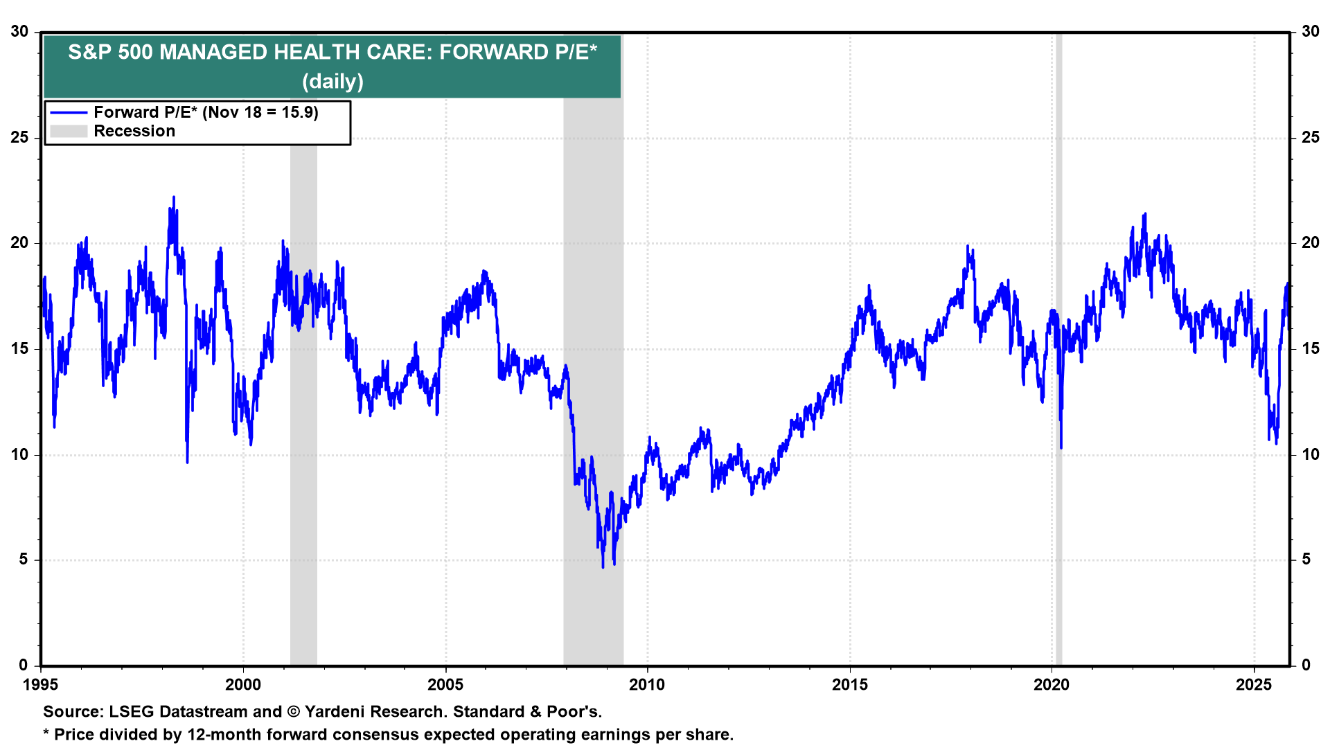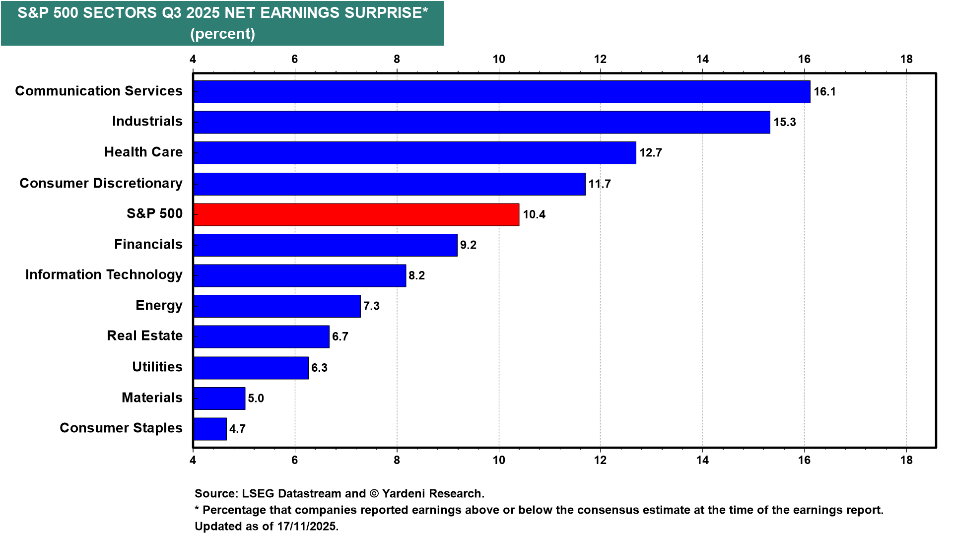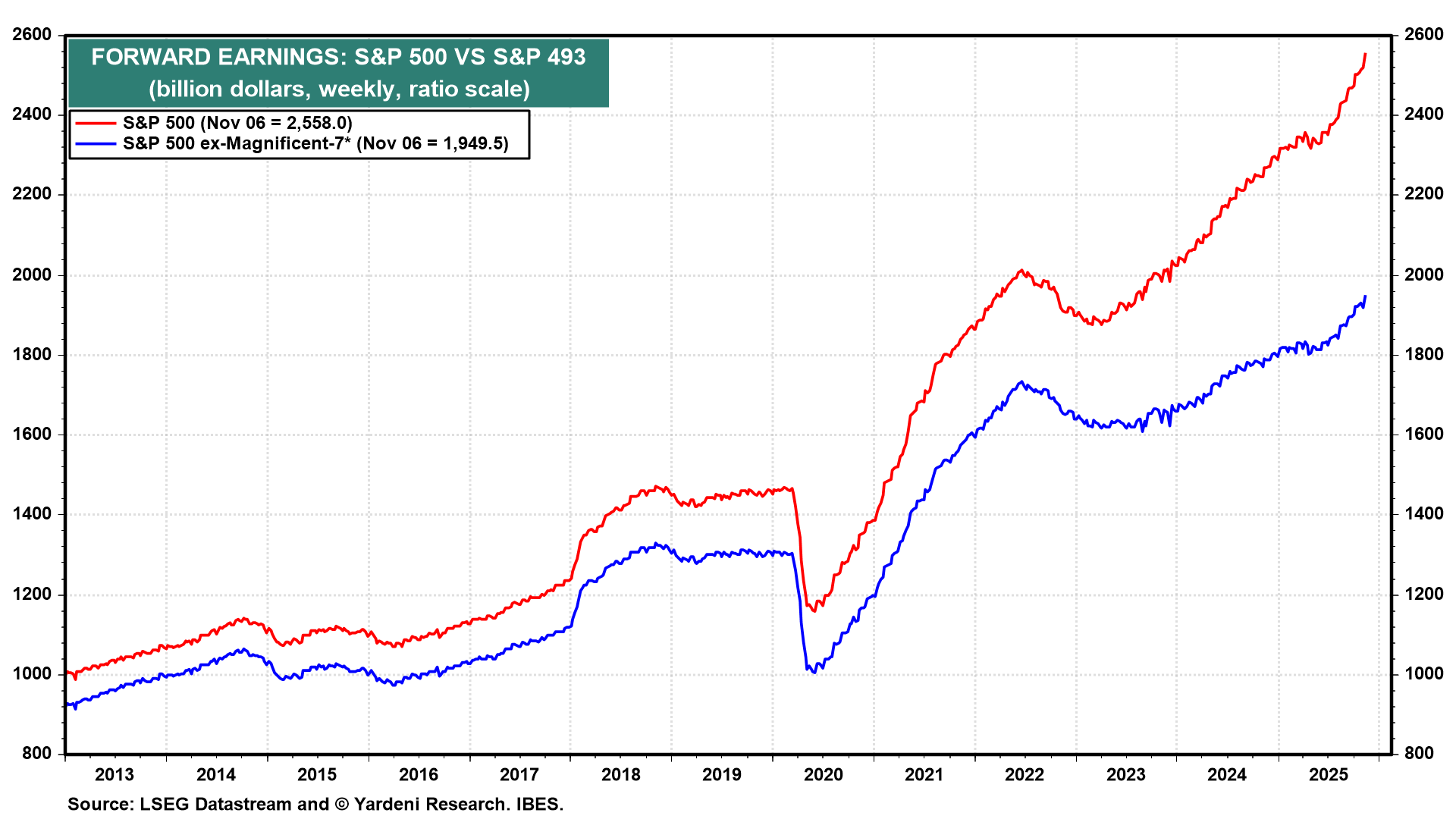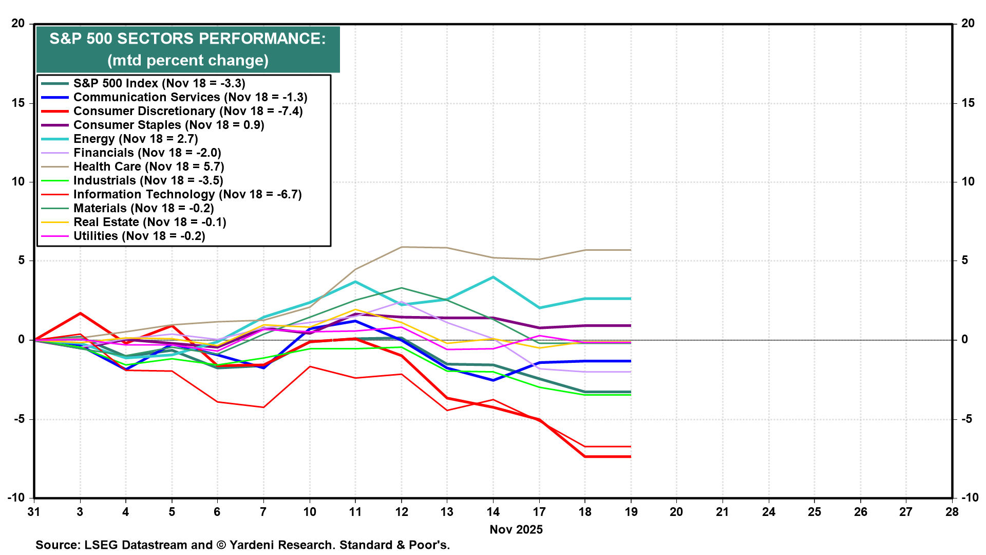 The S&P 500’s forward earnings has risen 11.9% ytd—well above its usual 8.0%-9.0% by early December—powered by three sectors: Information Technology (26.8%), Communication Services (15.2), and Financials (14.6) (Fig. 6). The other eight sectors lag the S&P 500, but only Energy’s forward earnings is actually down ytd.