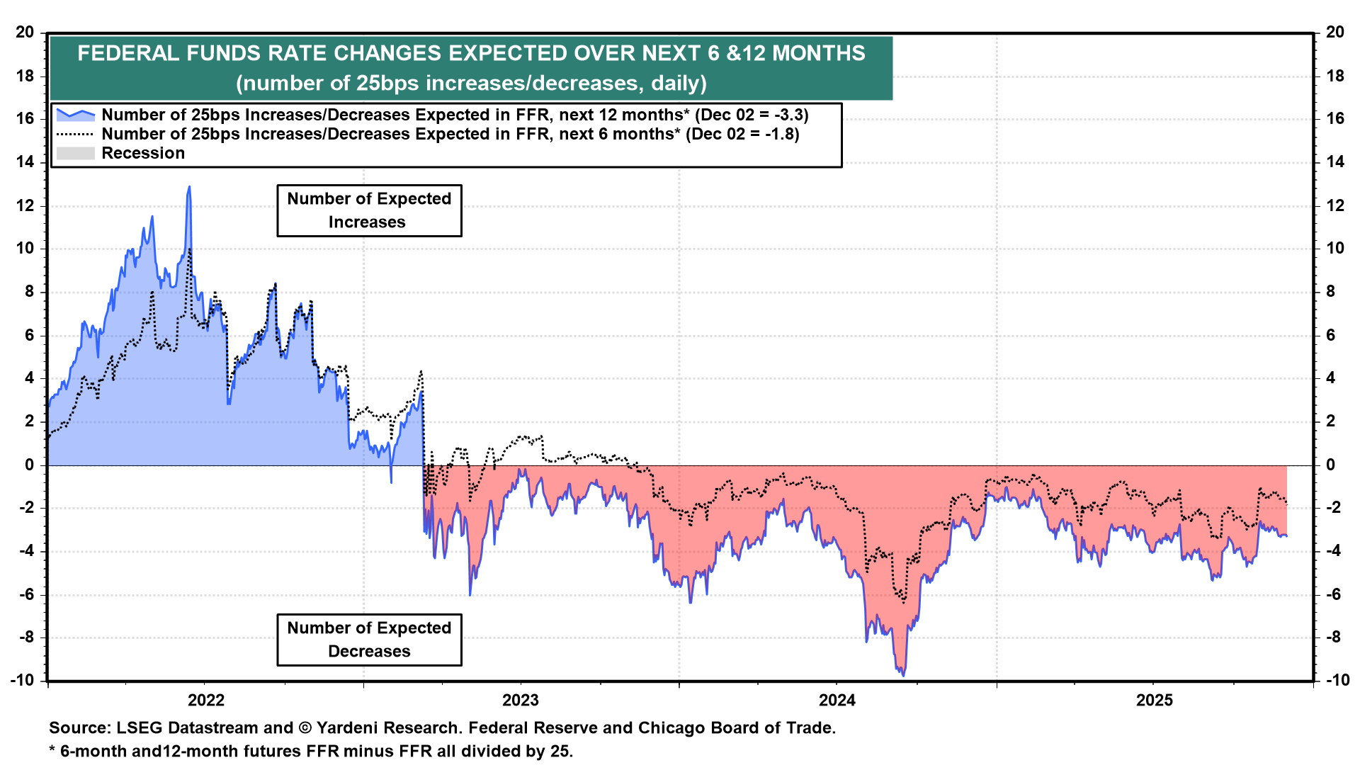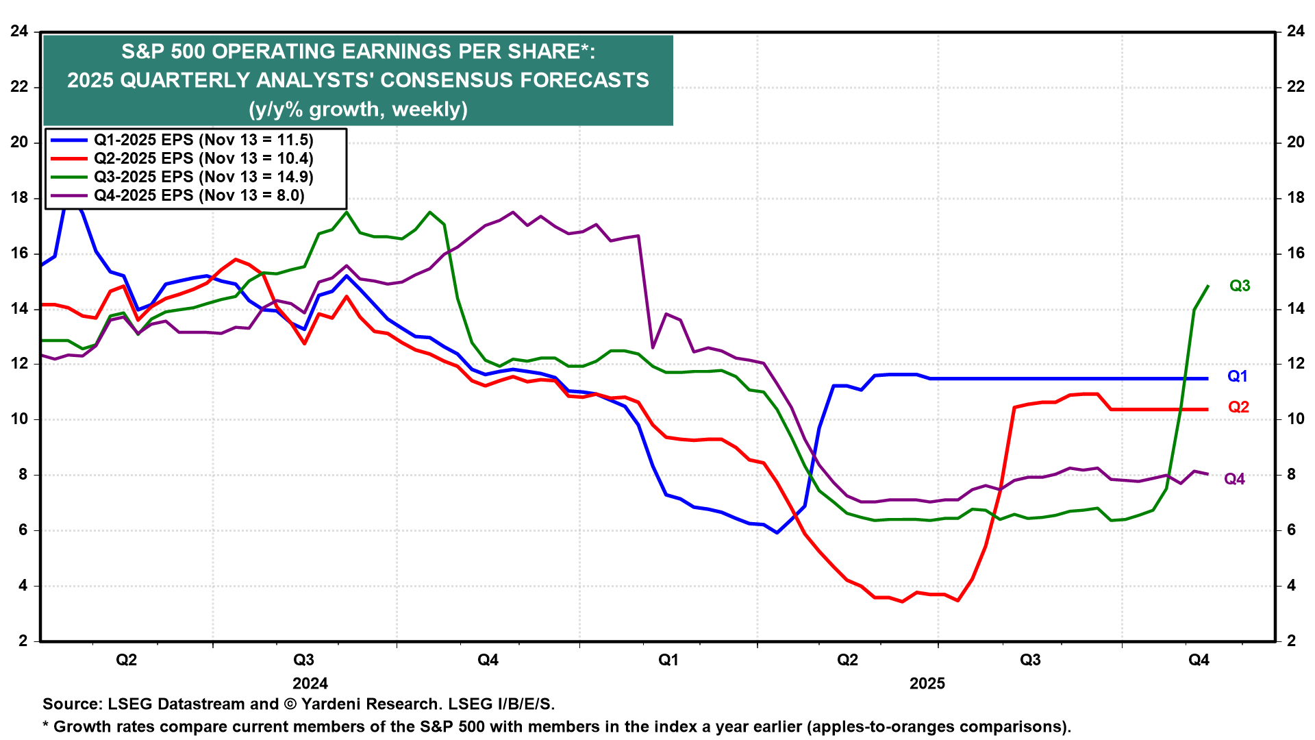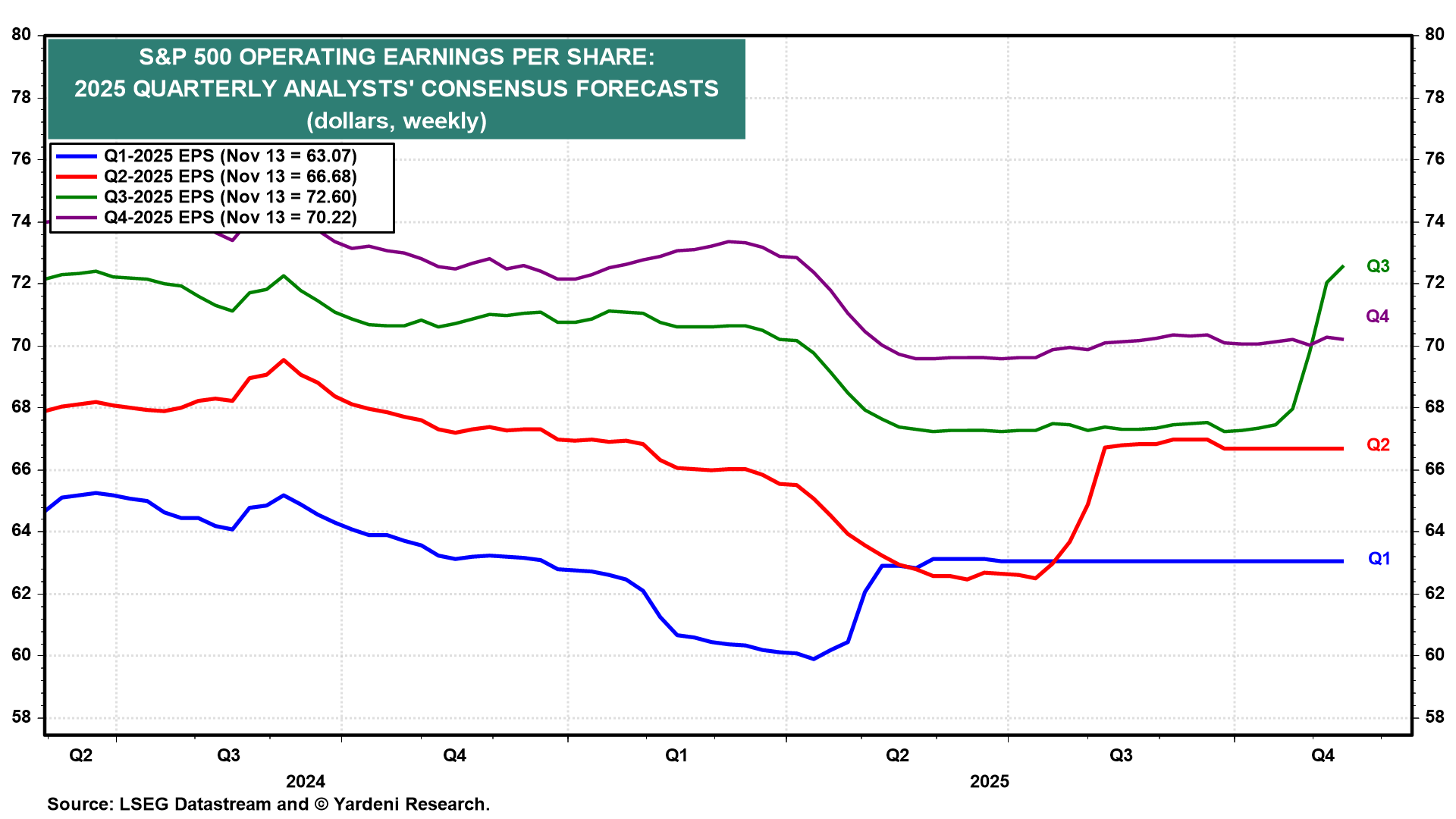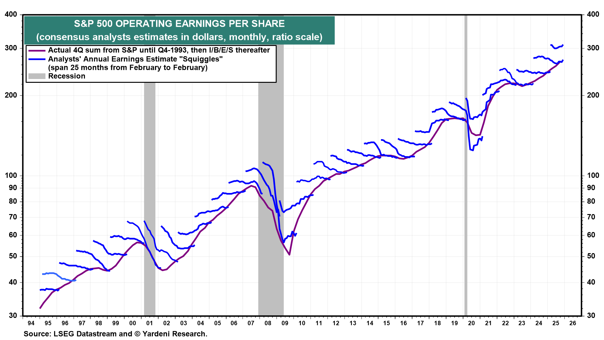 Strategy: Will 2026 Be a Year of Rising Estimates? Year-end is a good time to take stock of how the analysts following S&P 500 companies have adjusted next year’s per-share forecasts so far this year. Analysts typically lower their annual consensus forecasts as a year progresses (only eight years in the past 30 were exceptions) (Fig. 2). This year looks like no exception, but Joe’s data suggest that 2026 could be a year of rising estimates for S&P 500 companies in aggregate. That’s because most of the S&P 500’s 11 sectors have improved or stabilized estimates since the Q2 earnings reporting season ended in July.