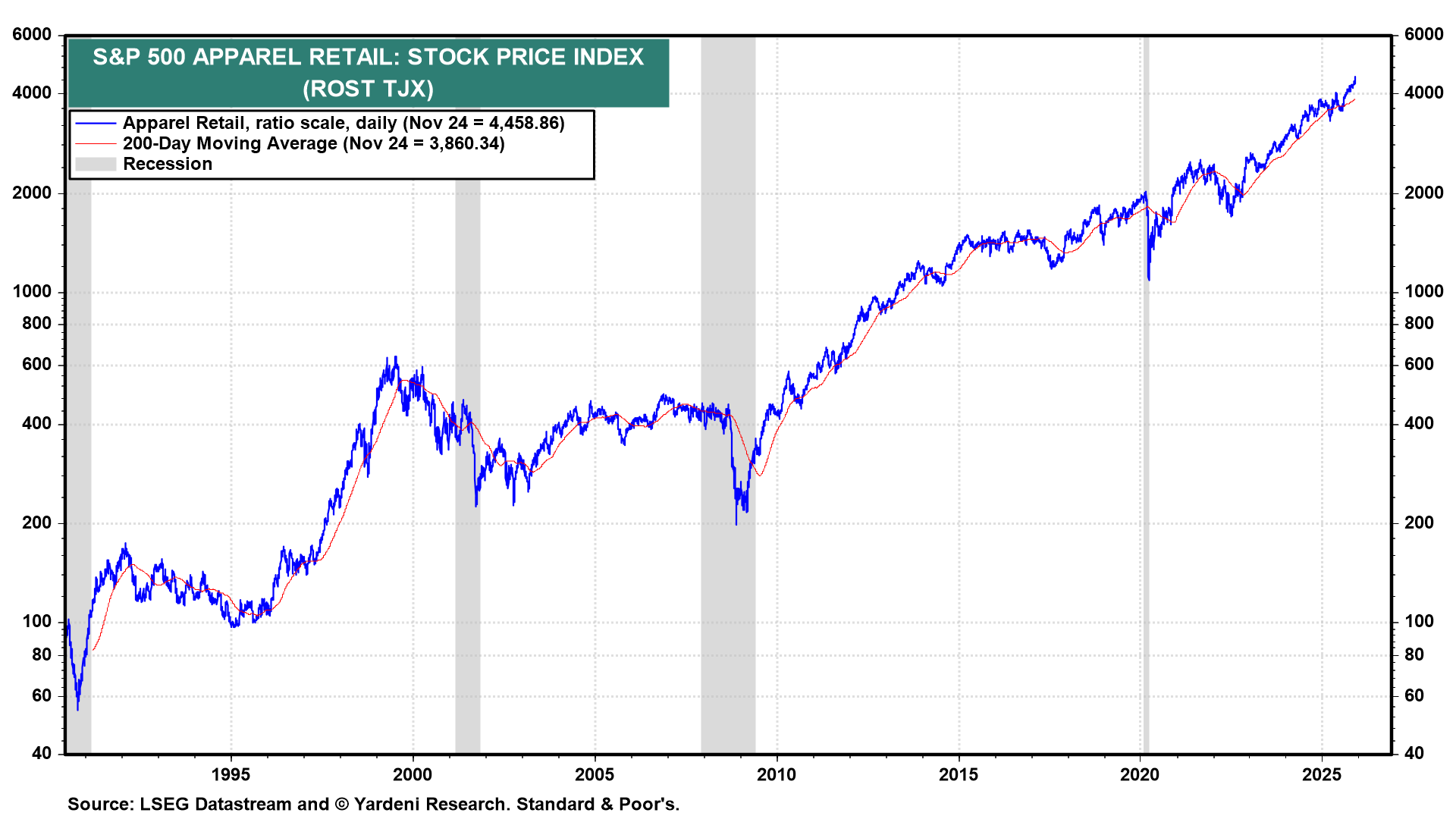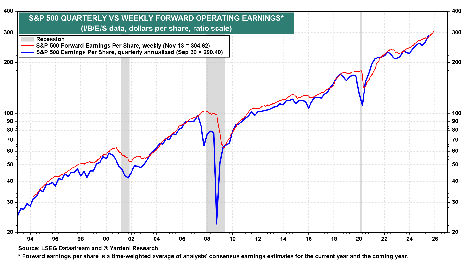 Executive Summary: The holiday selling season is off to a merry start for retailers. By most accounts, consumers gobbled up the post-Thanksgiving sales last weekend with more gusto than last year. … Also: Does the recent downdraft in the price of bitcoin suggest another cyrpto winter? Jackie parses the issues that bitcoin investors are wrestling with at this juncture, including two big headwinds and one helpful tailwind, courtesy of Uncle Sam. … And: Joe’s analysis suggests that 2026 may be a rare year in which analysts’ estimates for S&P 500 companies aren’t whittled down as the months pass.