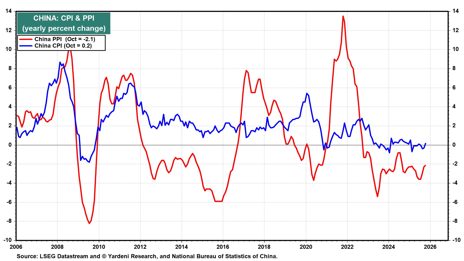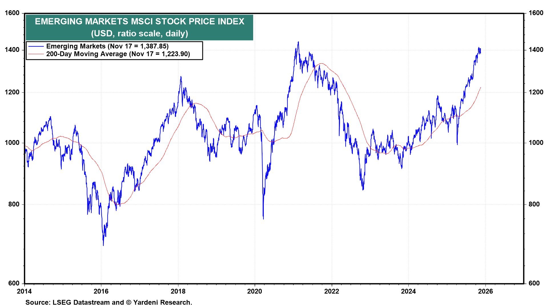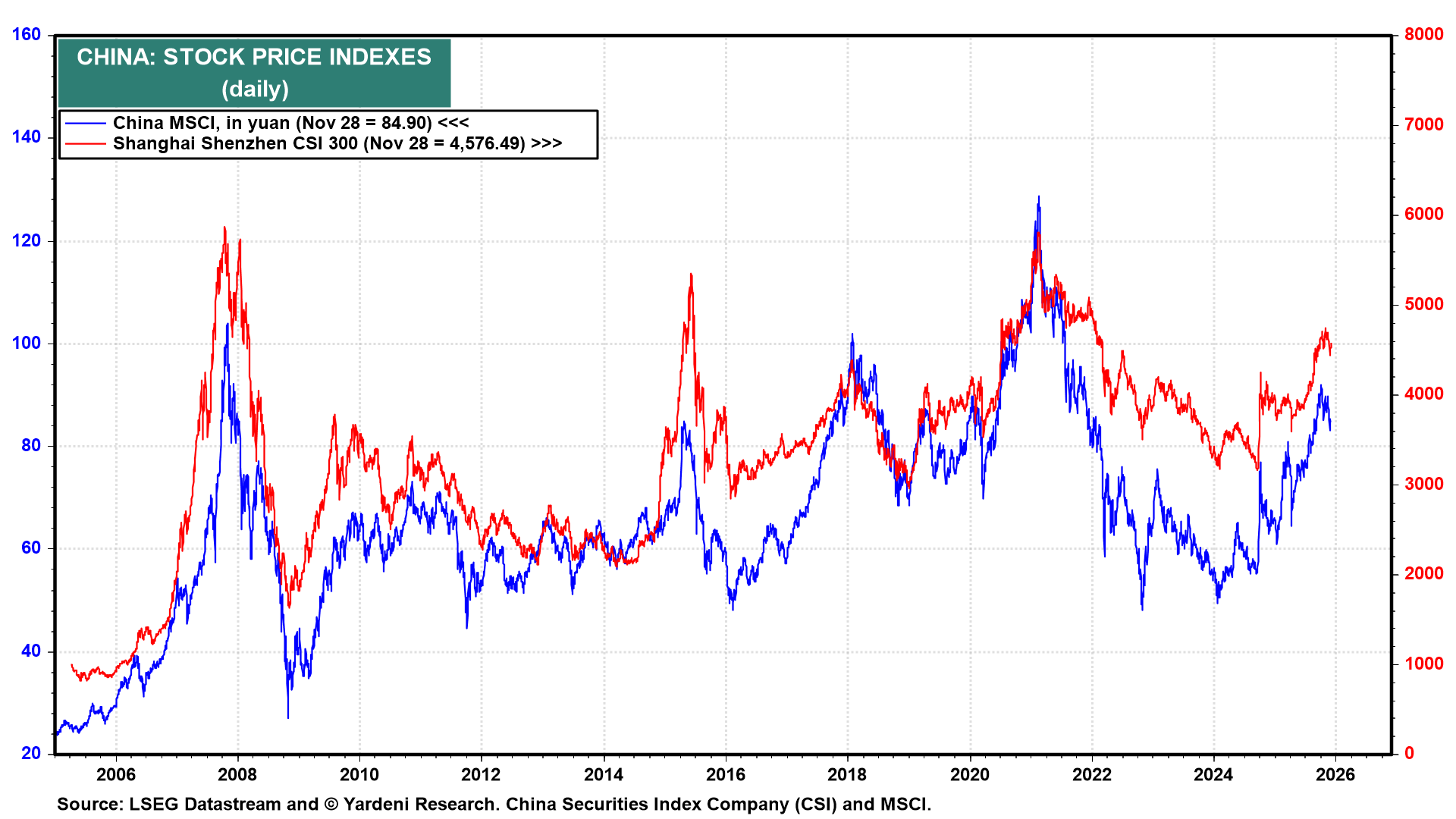 Even China’s economy could be about to surprise to the upside. In yesterday’s Morning Briefing, we discussed Goldman Sachs’ expectation that GDP in Asia’s biggest economy could accelerate to 6% in 2026 from around 5% this year (Fig. 9).