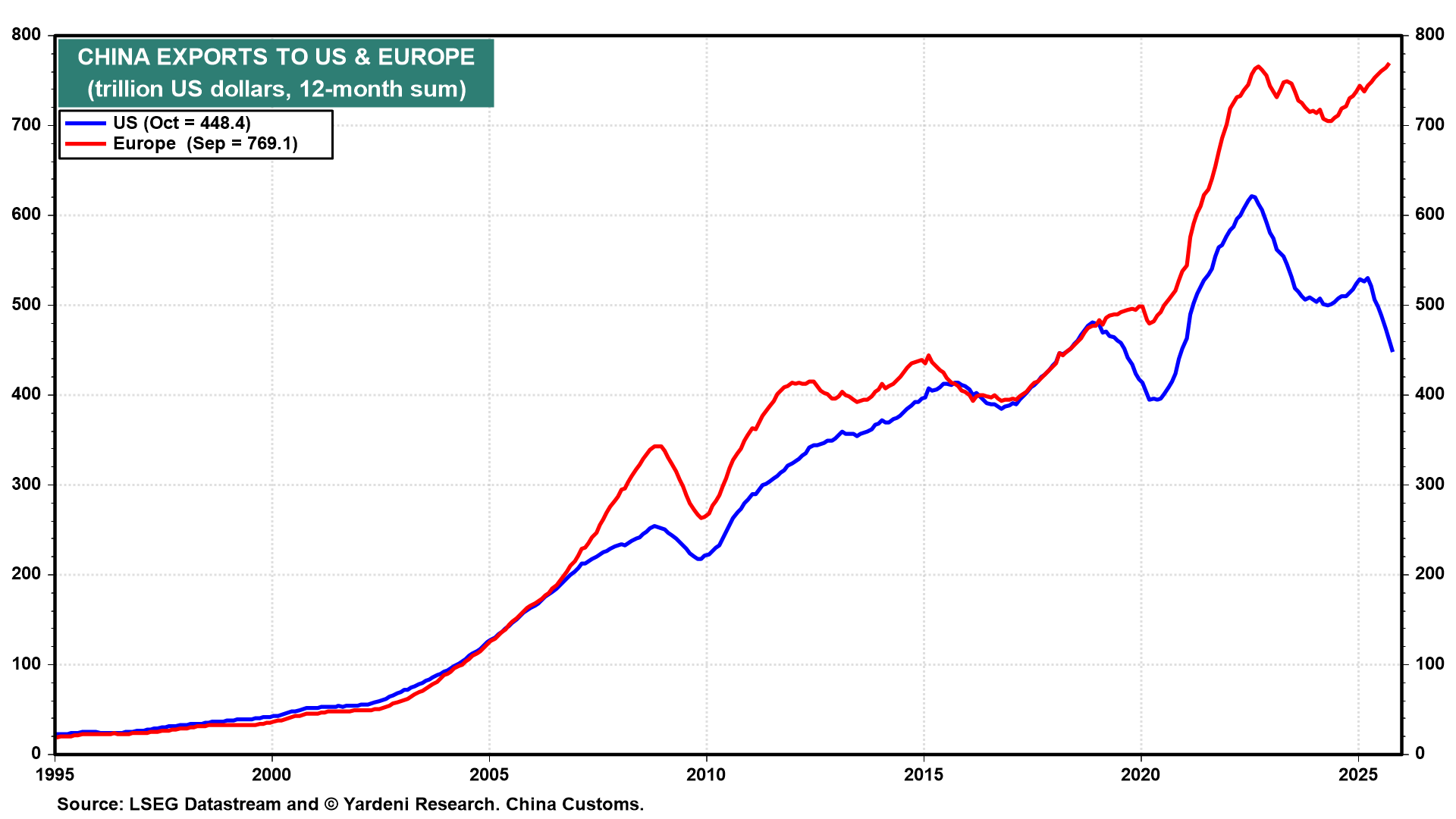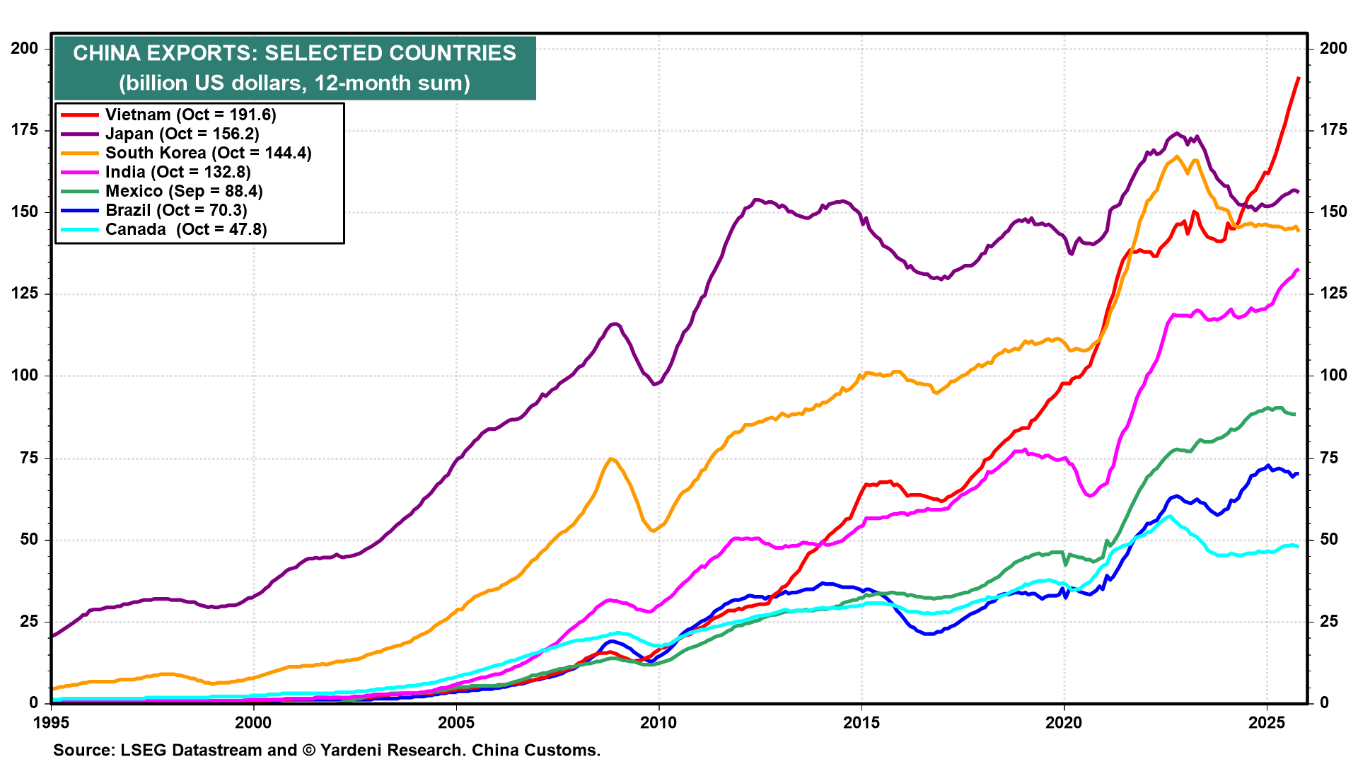 External demand is helping China overcome a giant property crisis that’s generating deflation, weak household demand, high youth unemployment, and onerous local government debt. This success owes to Xi’s efforts since the Trump 1.0 era to reduce China’s reliance on the US consumer. Today, Southwest Asia and Europe are the main markets that drive China Inc.