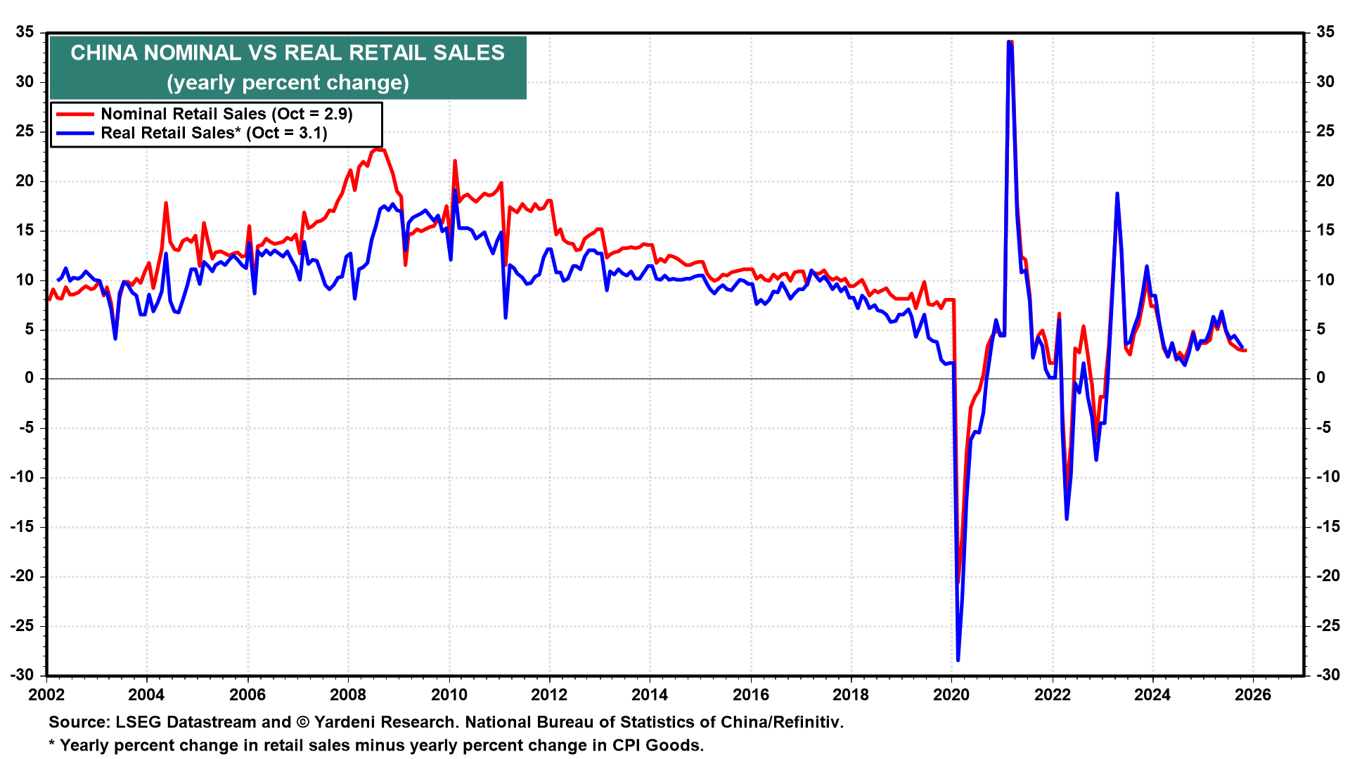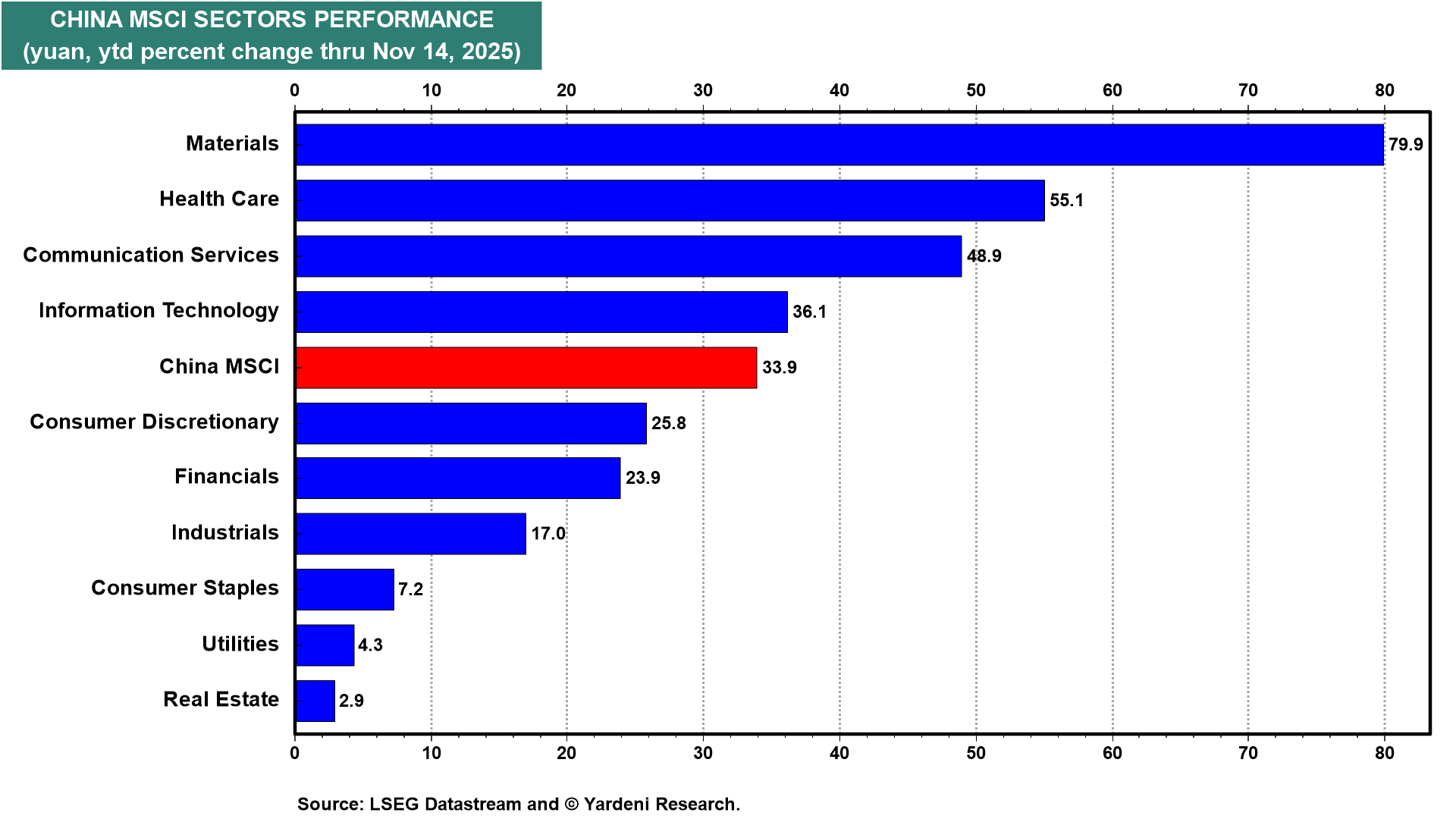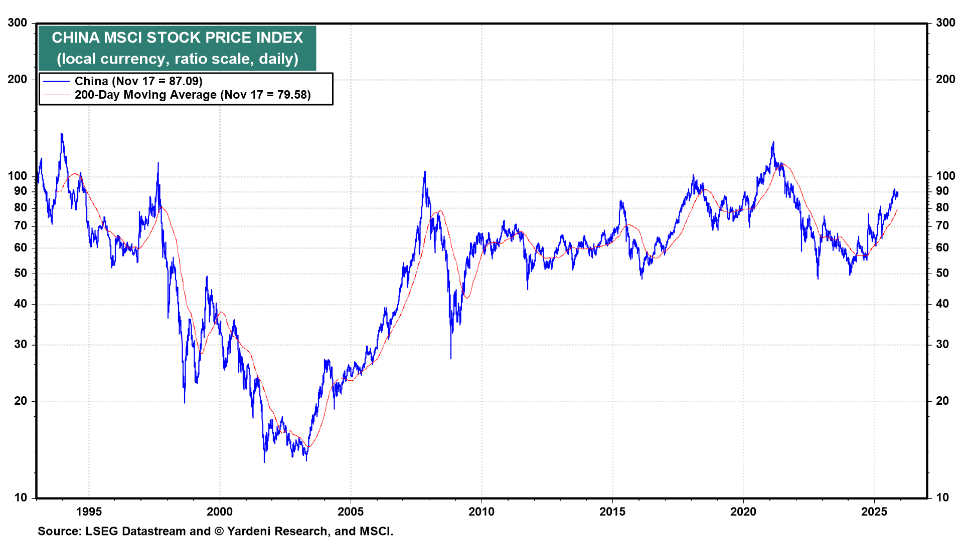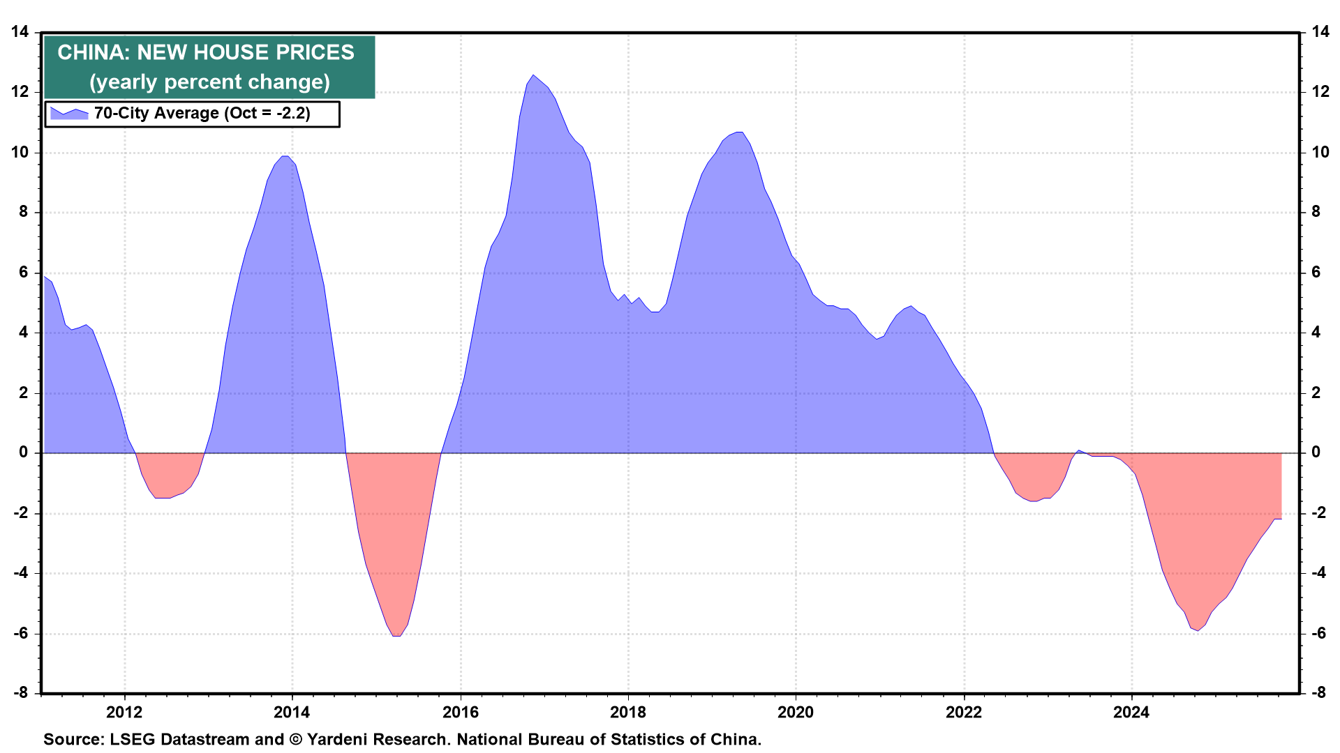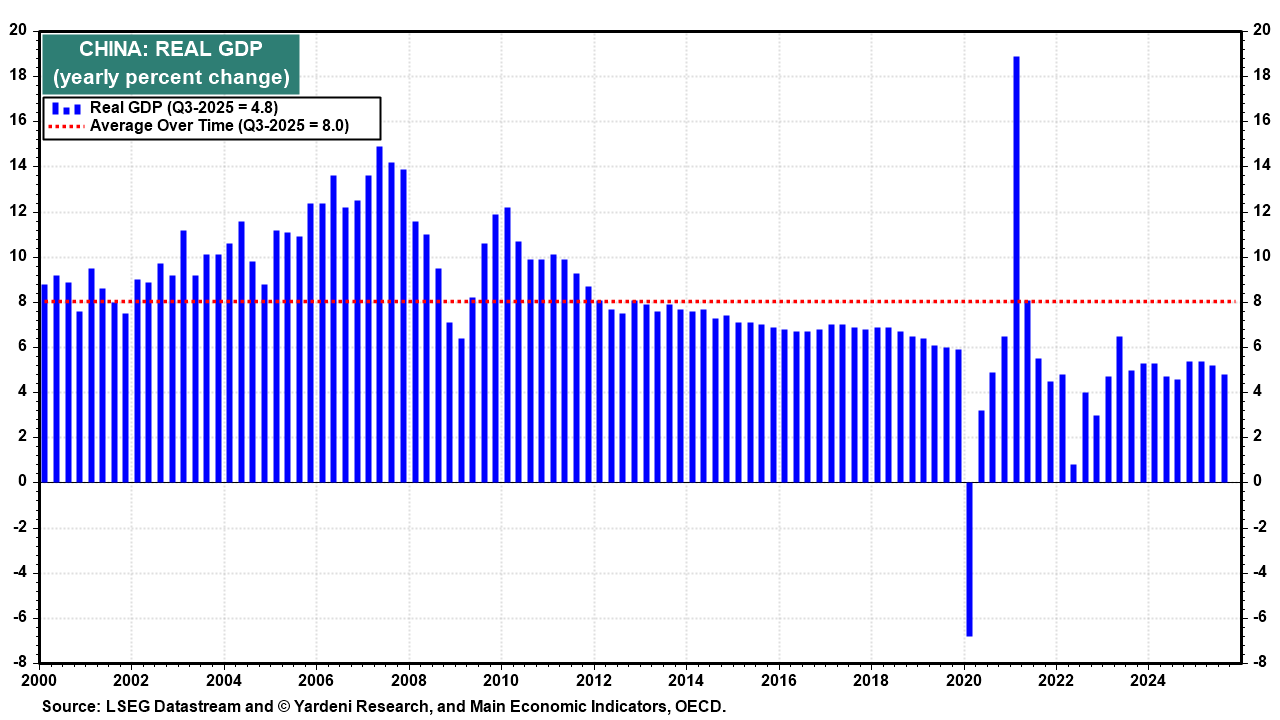 It’s great in that Goldman economists Andrew Tilton and Hui Shan argue that GDP growth in Asia’s biggest economy could accelerate to 6% y/y for the “next few years.” That’s faster than the government’s “around 5%” GDP target for this year and double the 2.0%-3.0% range that many economists project for 2026 as US tariffs slam China’s export engine (Fig. 1).