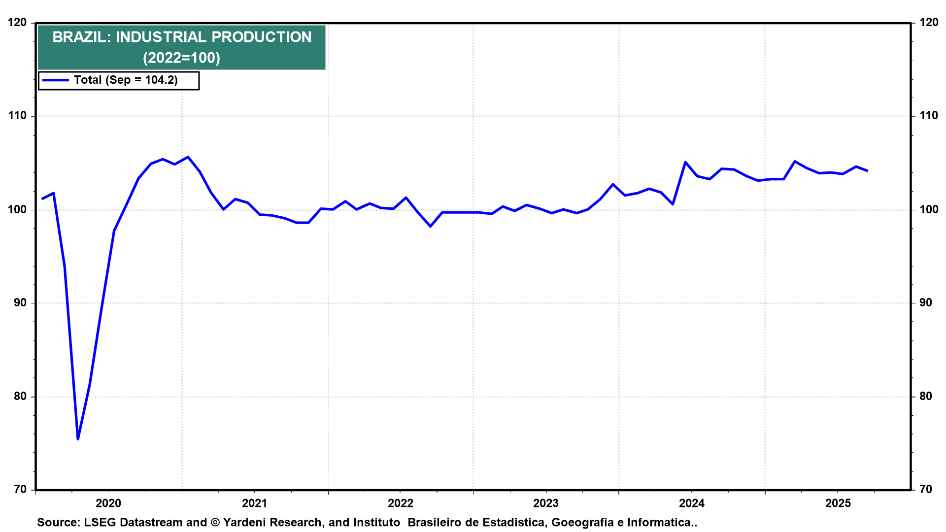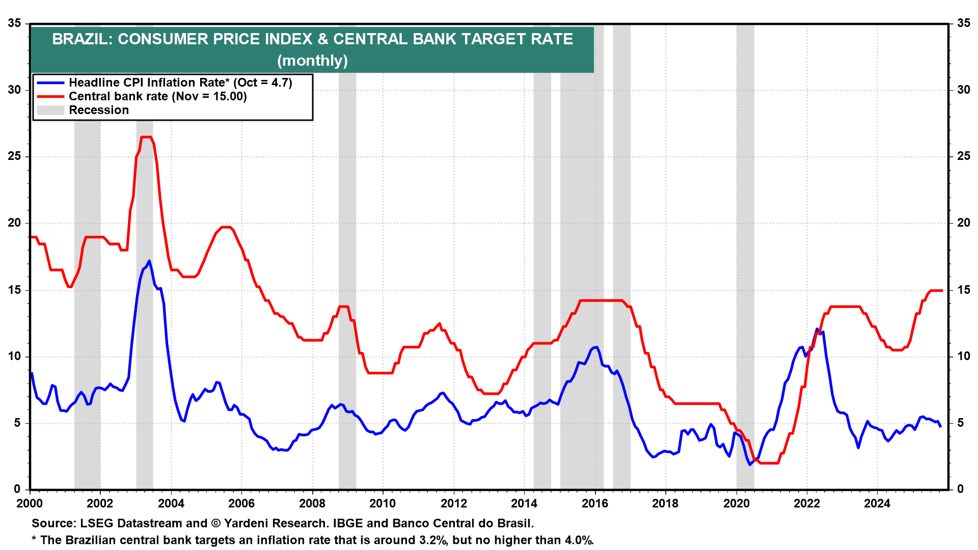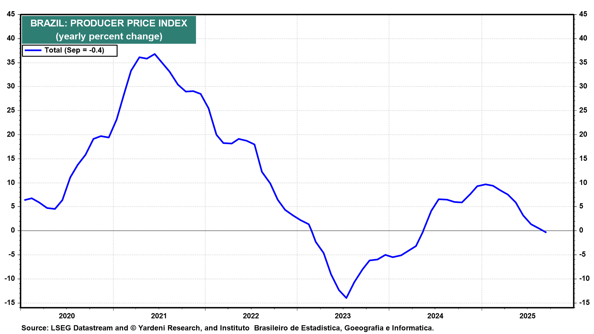 (2) Brazil’s central bank is intentionally stunting economic growth. Record grain harvests and strong domestic consumption caused the IBC-Br, an indicator of economic activity in Brazil, to soar to a record high during October 2024 (Fig. 18). Brazil’s unemployment rate fell to 6.1%, the lowest on record, for the three months ended November 2024, supported by strong fiscal spending.