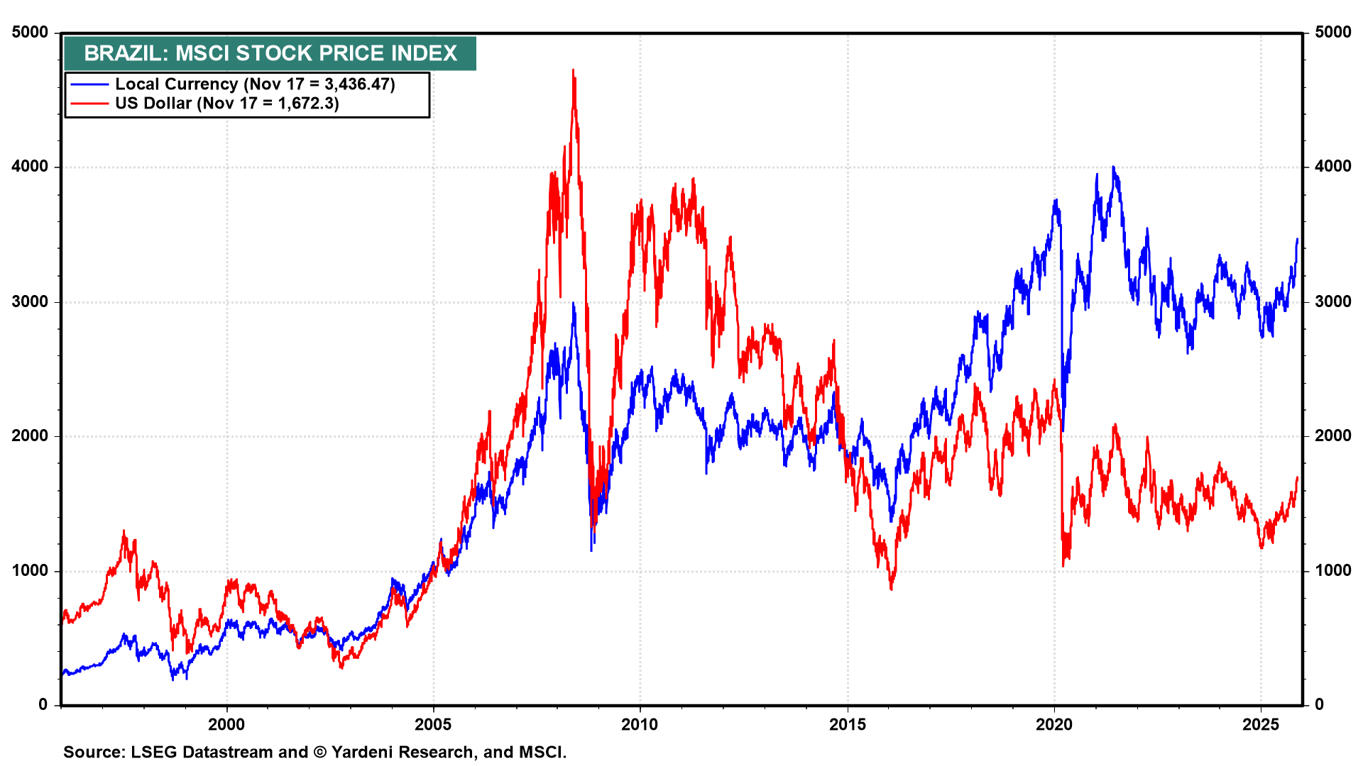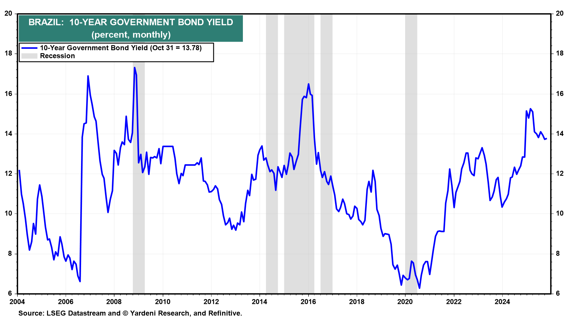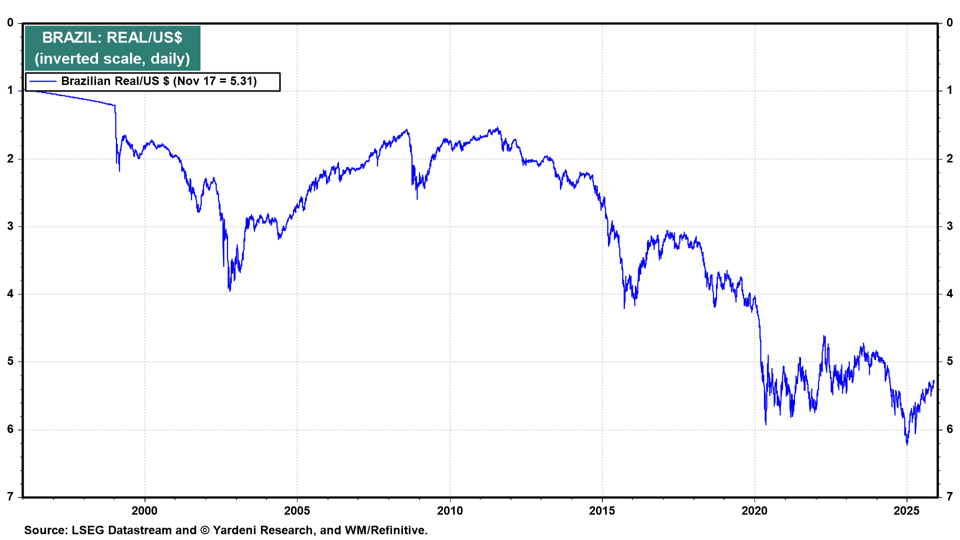 (2) Brazil’s central bank is intentionally stunting economic growth. Record grain harvests and strong domestic consumption caused the IBC-Br, an indicator of economic activity in Brazil, to soar to a record high during October 2024 (Fig. 18). Brazil’s unemployment rate fell to 6.1%, the lowest on record, for the three months ended November 2024, supported by strong fiscal spending.