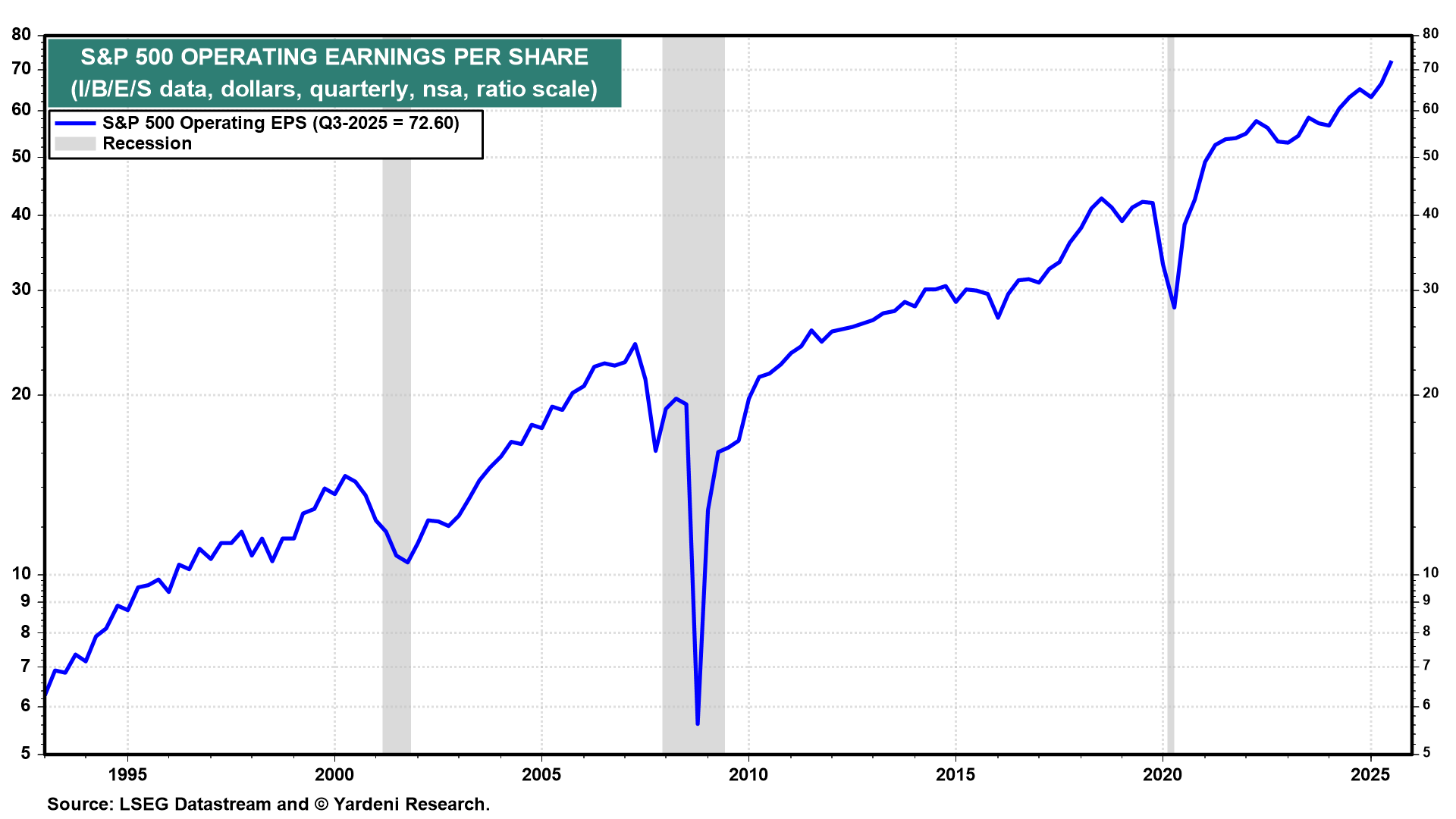 The strain on power and compute isn’t a red flag but evidence of demand and momentum. Electricity costs continue to move higher, reflecting both rising demand from data centers and the strain on power-supply infrastructure (Fig. 4). Meanwhile, S&P 500 operating earnings have consistently recovered through multiple cycles, and we expect them to continue to trend higher (Fig. 5).
