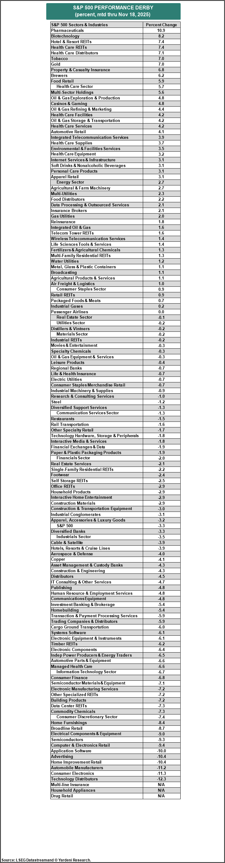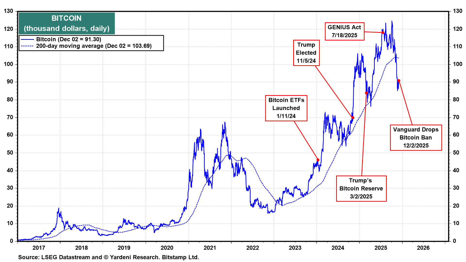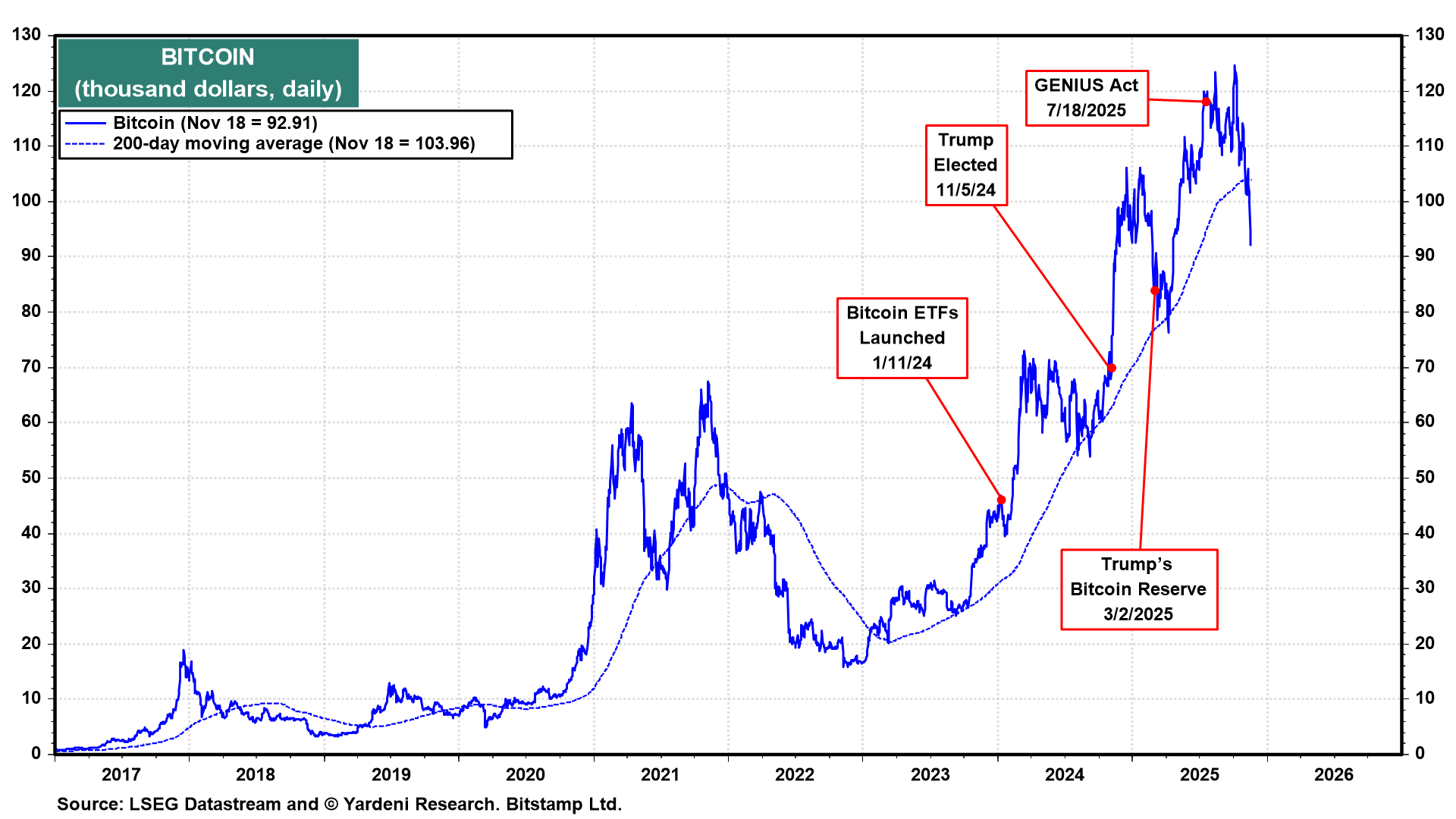 (2) Index threat. While leverage may have accelerated the bitcoin downdraft, some investors believe that MSCI got the ball rolling. The index company announced on October 10 that it was considering excluding from its indexes companies that hold more than half of their assets in crypto. The “consultation period” ends on December 31, and a decision is expected by January 15. If implemented, crypto treasury stocks, like Saylor’s Strategy, could be removed from MSCI indexes in February. The change could affect issuers holding more than $135 billion in digital assets and 5% of all bitcoin.