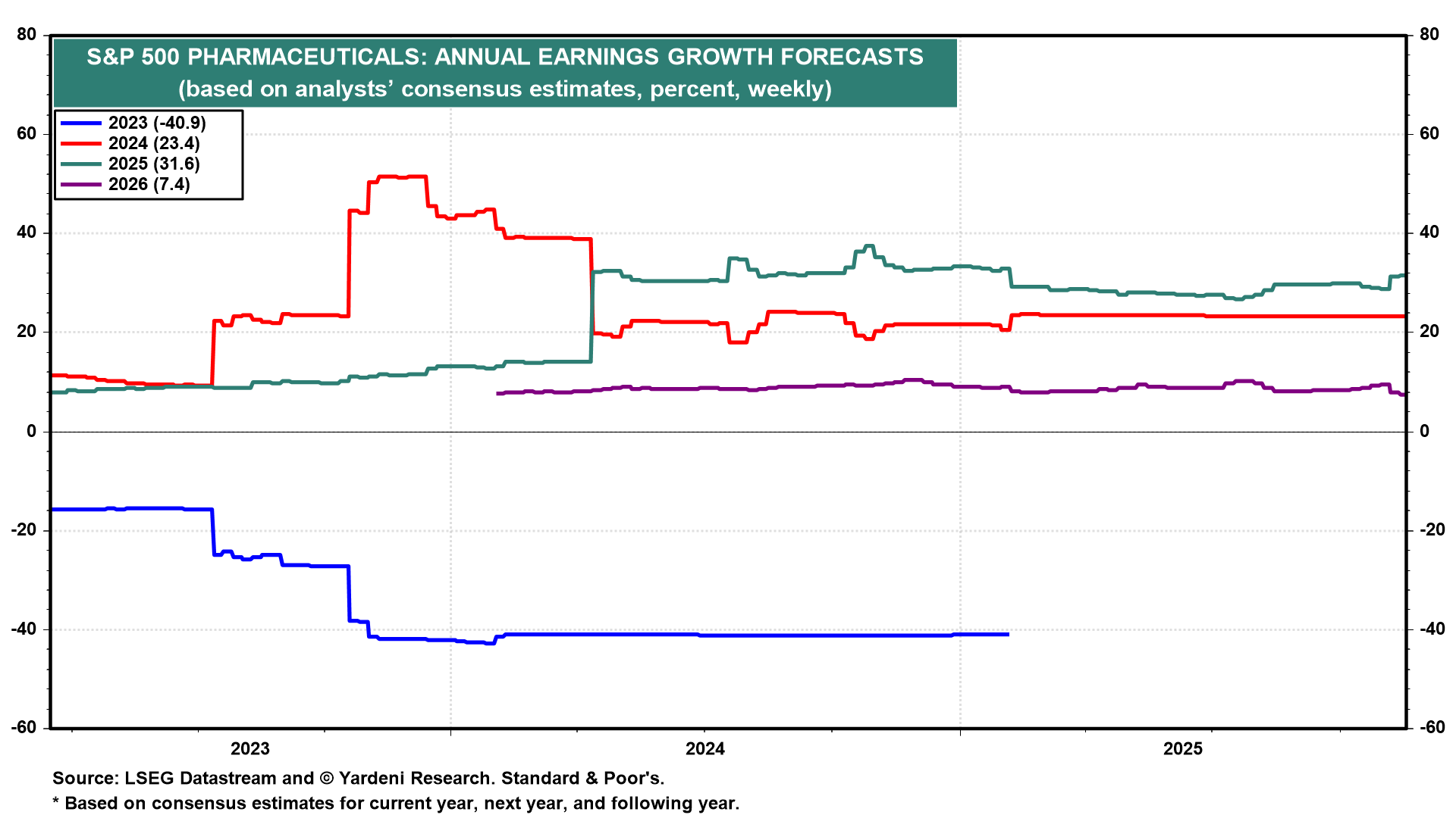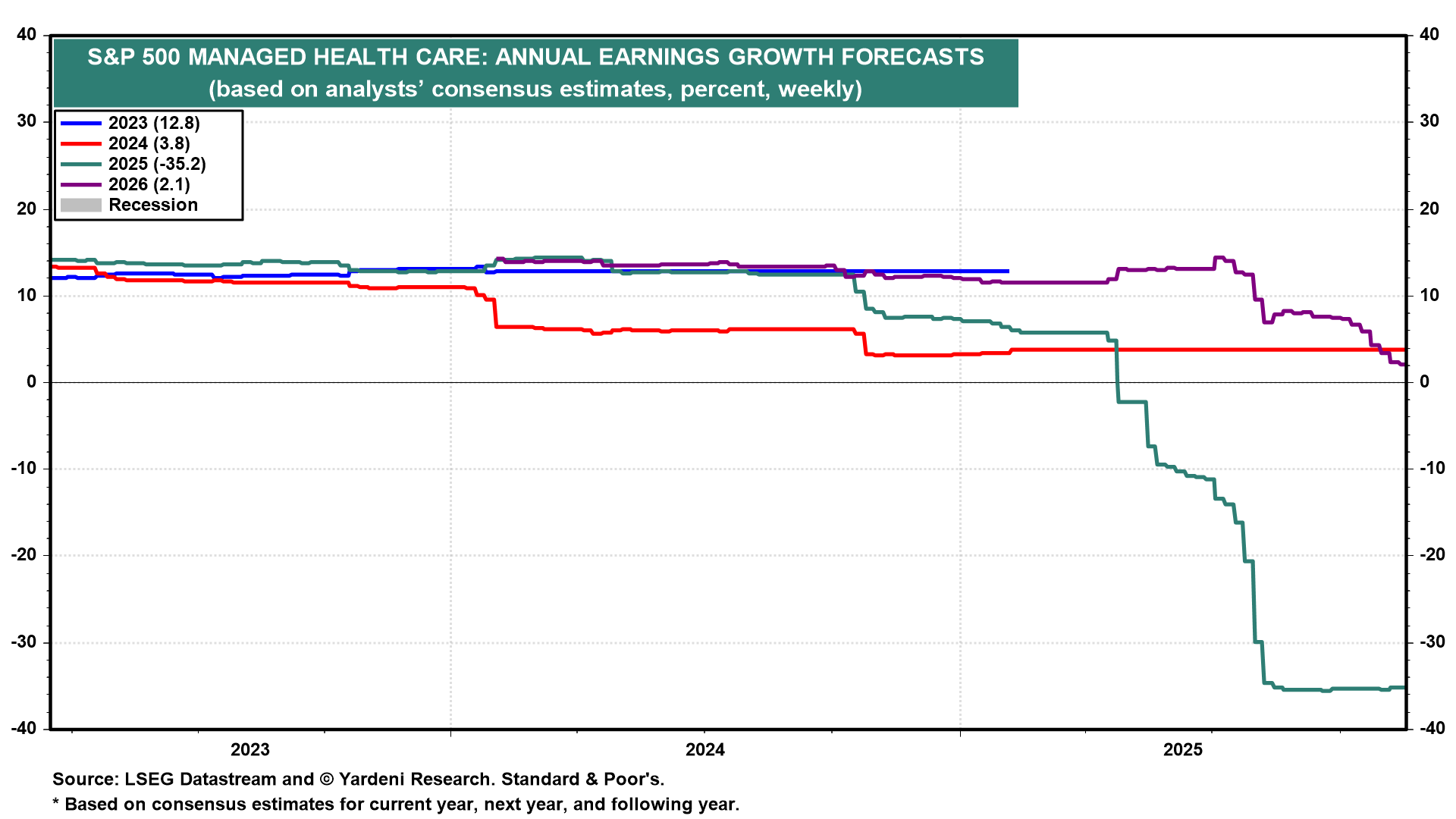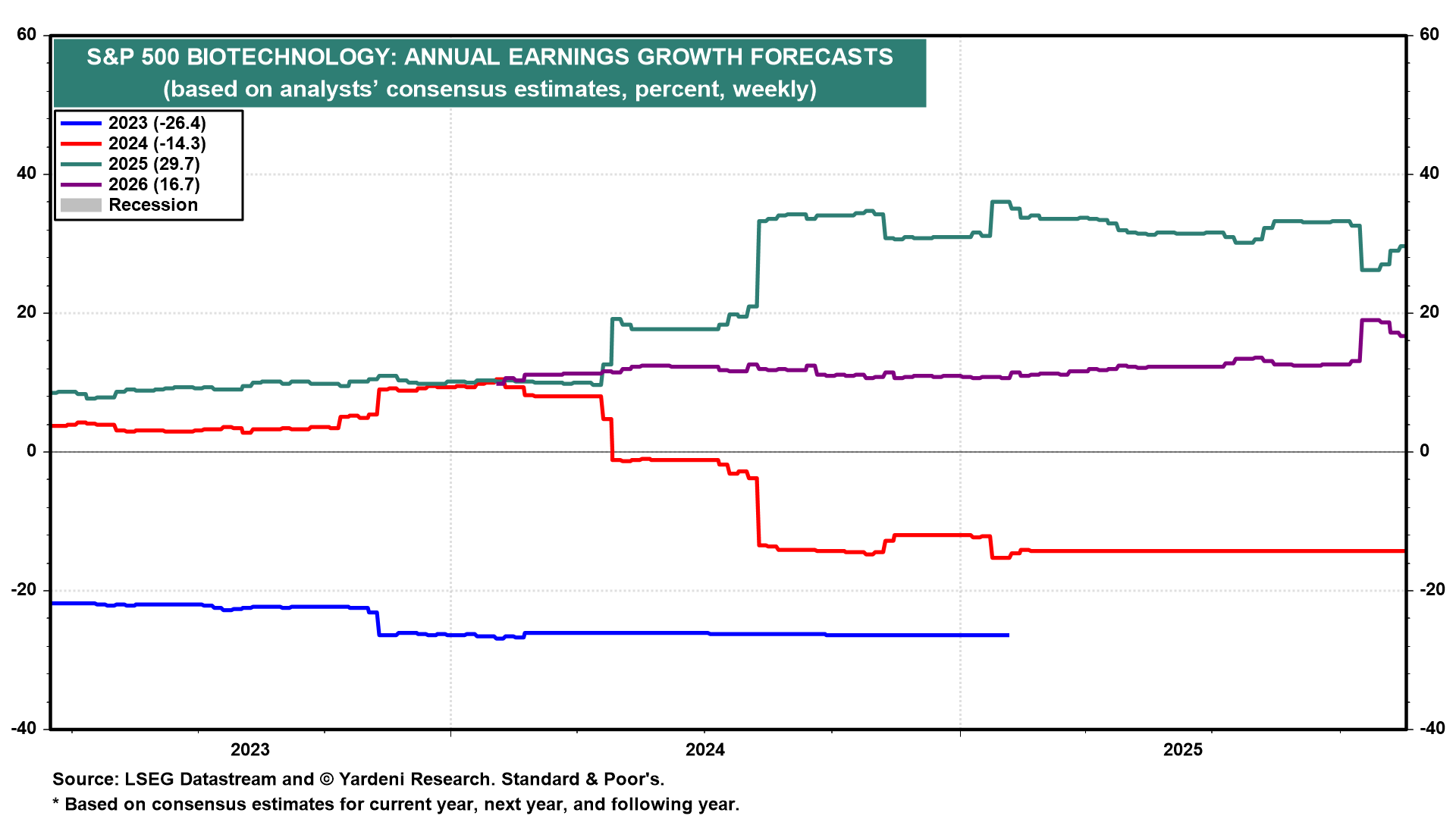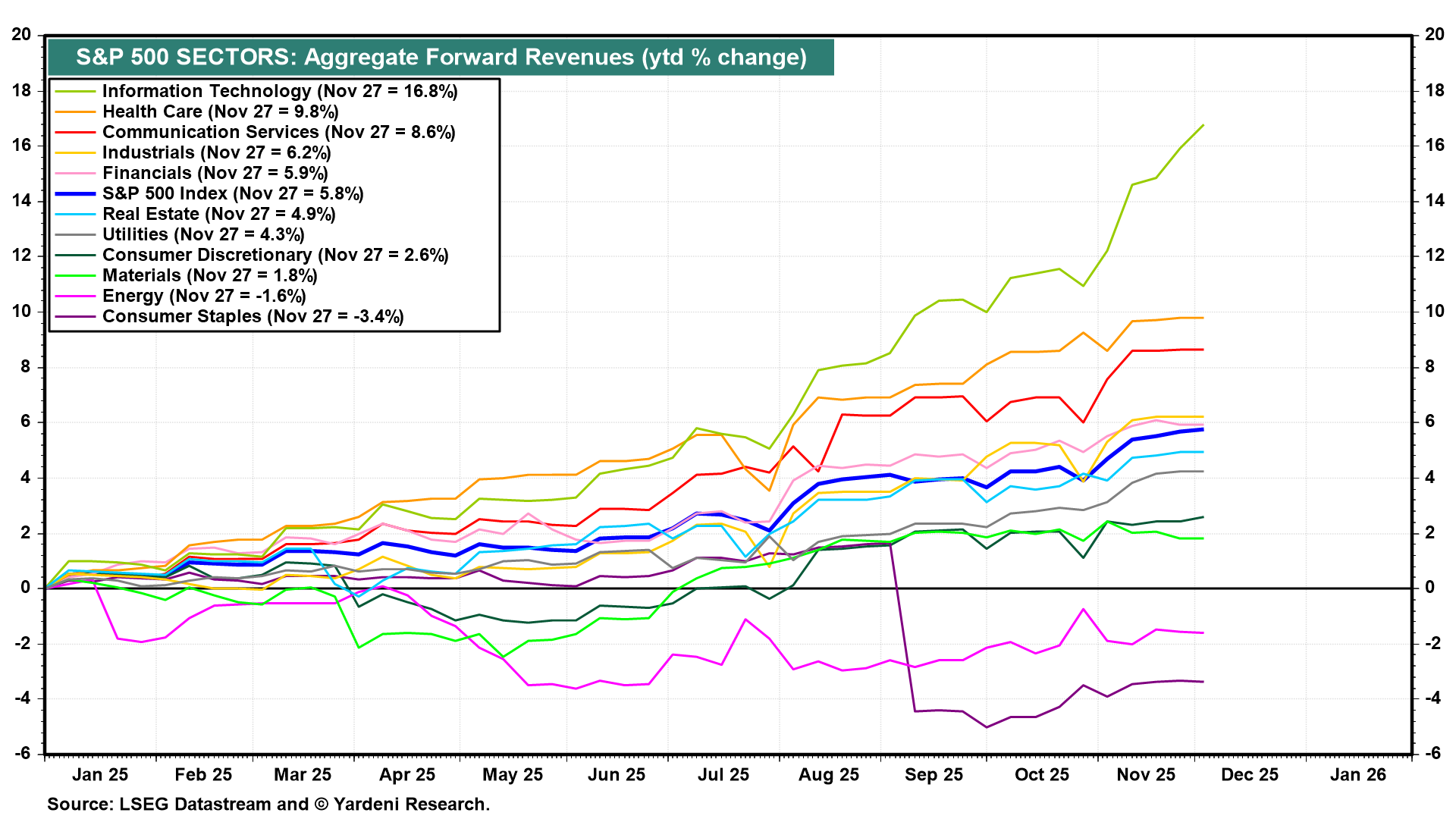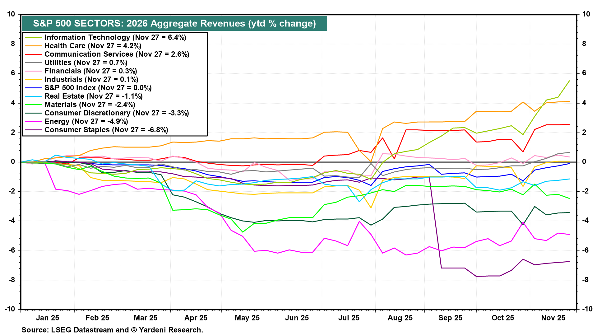 These five sectors have posted a gain in their 2026 consensus revenues forecasts so far: Information Technology (6.4%), Health Care (4.2), Communication Services (2.6), Utilities (0.7), Financials (0.3), and Industrials (0.1) (Fig. 3). Among the laggards, ytd declines have improved for nearly all since July’s end: Consumer Staples (-6.8), Energy (-4.9), Consumer Discretionary (-3.3), Materials (-2.4), and Real Estate (-1.1).
