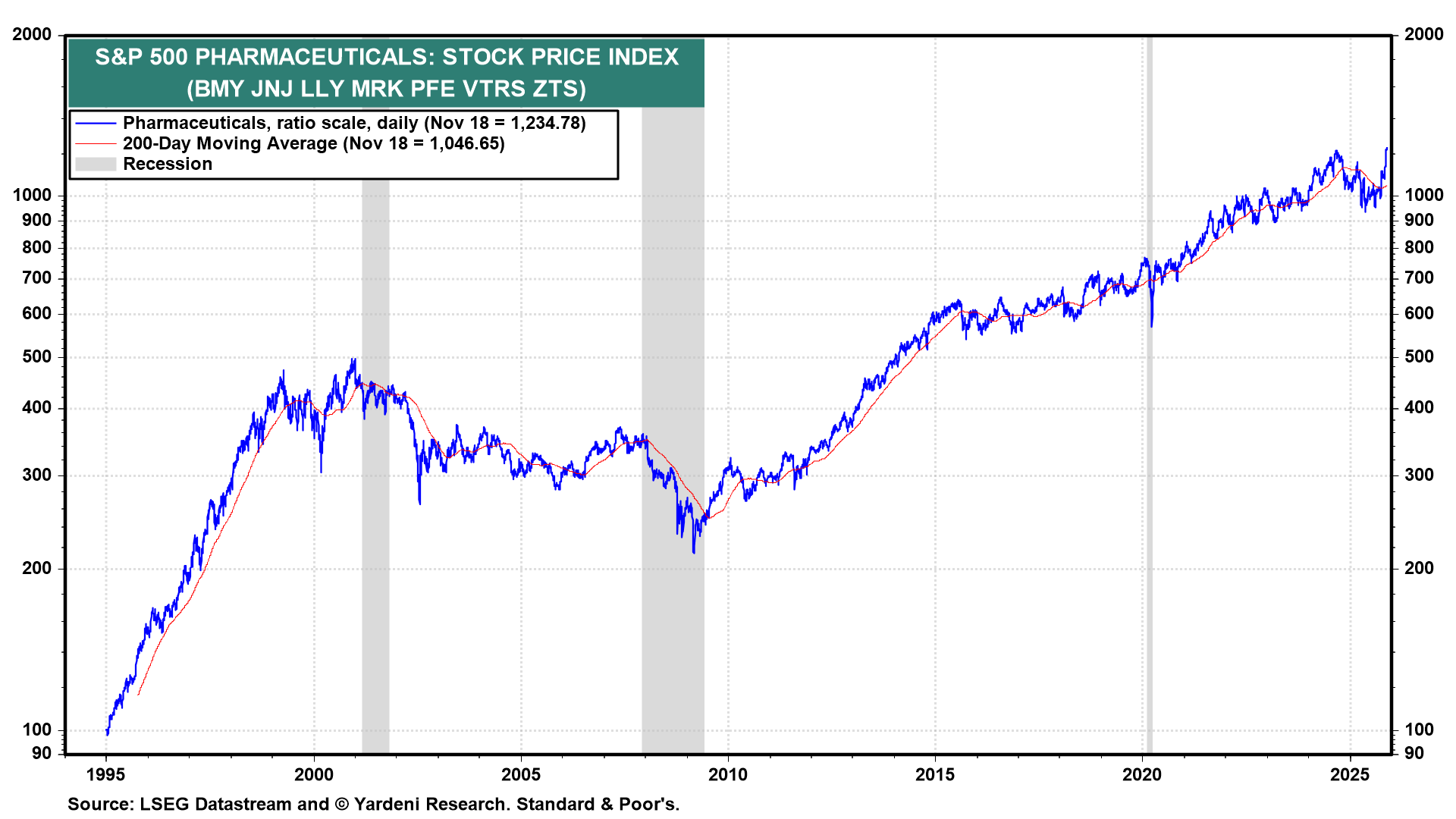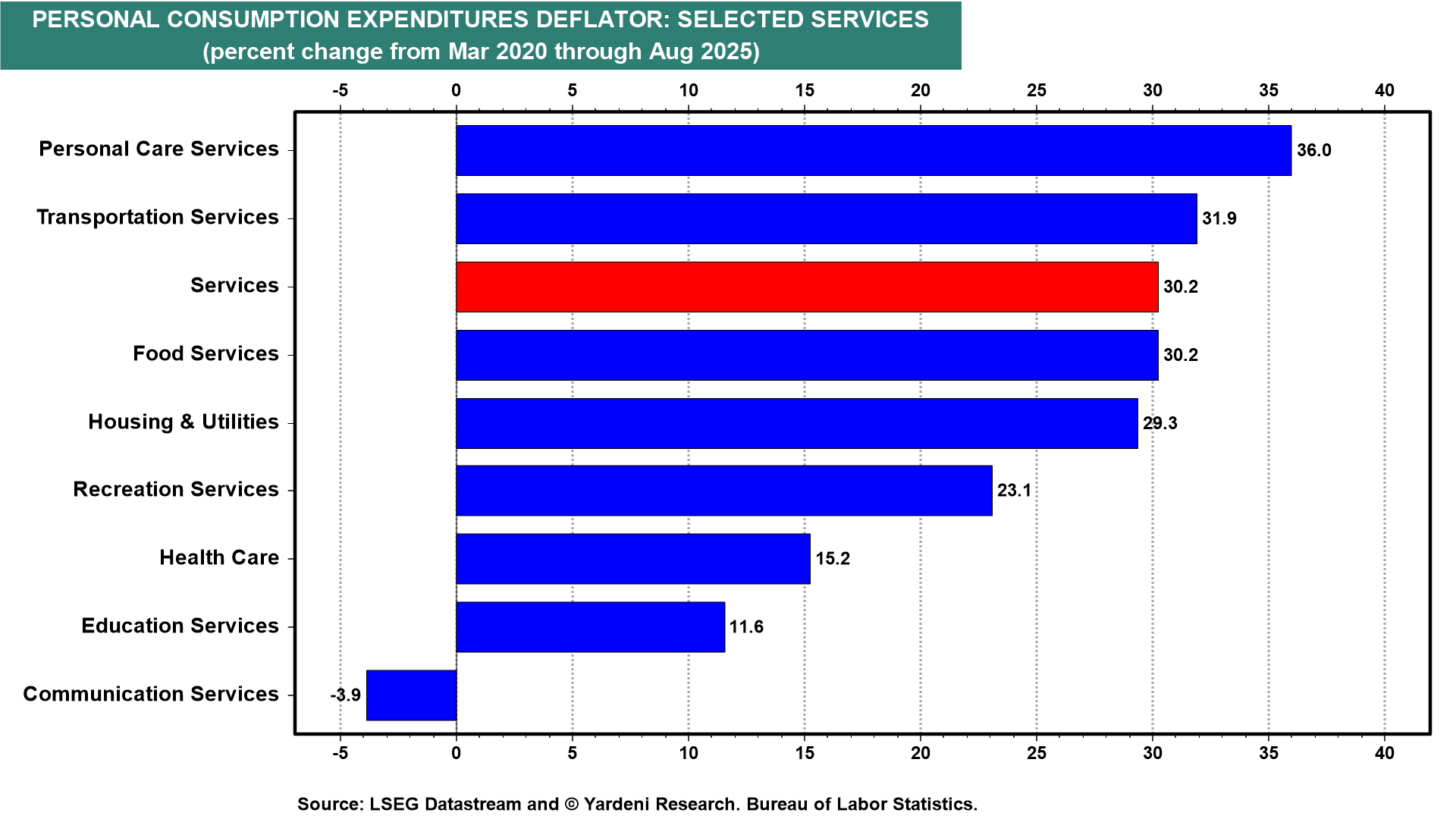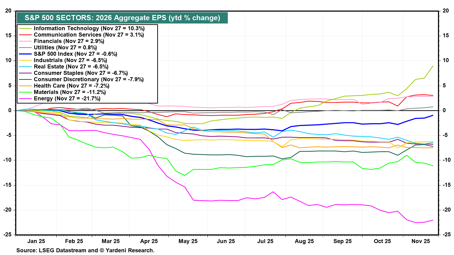 The forecast for the S&P 500’s 2026 earnings is down 0.6% so far this year, but even that has improved markedly from a ytd decline of 4.1% at July’s end. These four sectors have higher 2026 earnings forecasts ytd and are ahead of the S&P 500 by that measure: Information Technology (10.3%), Communication Services (3.1), Financials (2.9), and Utilities (0.8) (Fig. 4).