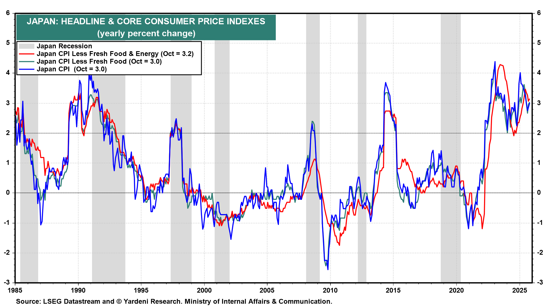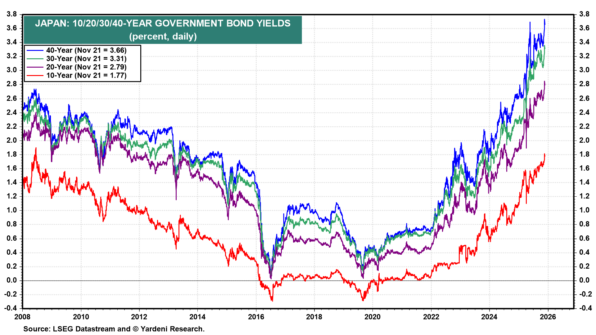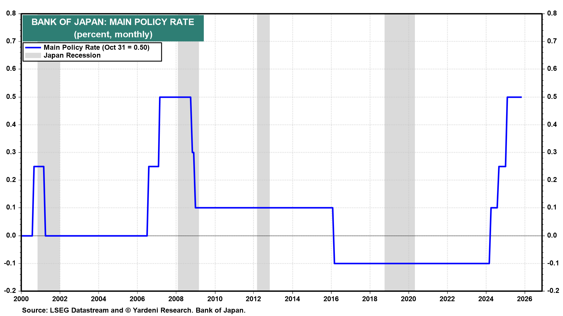 (1) An eye on Japan. After decades of extremely low interest rates in Japan—which provided cheap leverage to speculators in financial assets including bitcoin—the BOJ started raising its benchmark interest rate in the summer of 2024. The tightening sent yields on Japanese government bonds higher.